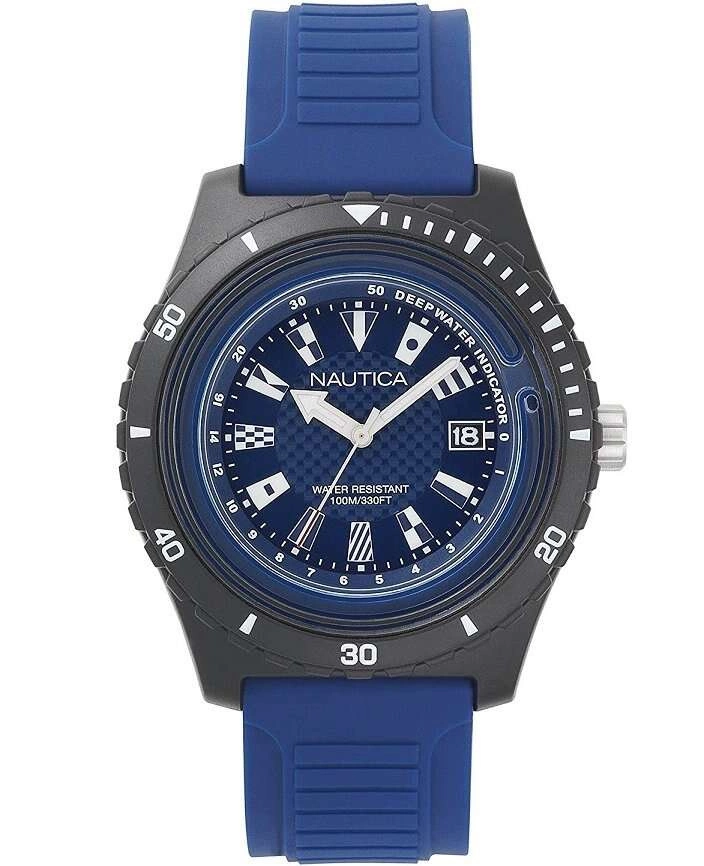 - Wodoszczelny Zegarek Męski Nautica NAPIBZ008 niebieski na pasku, posiada funkcję datownika.