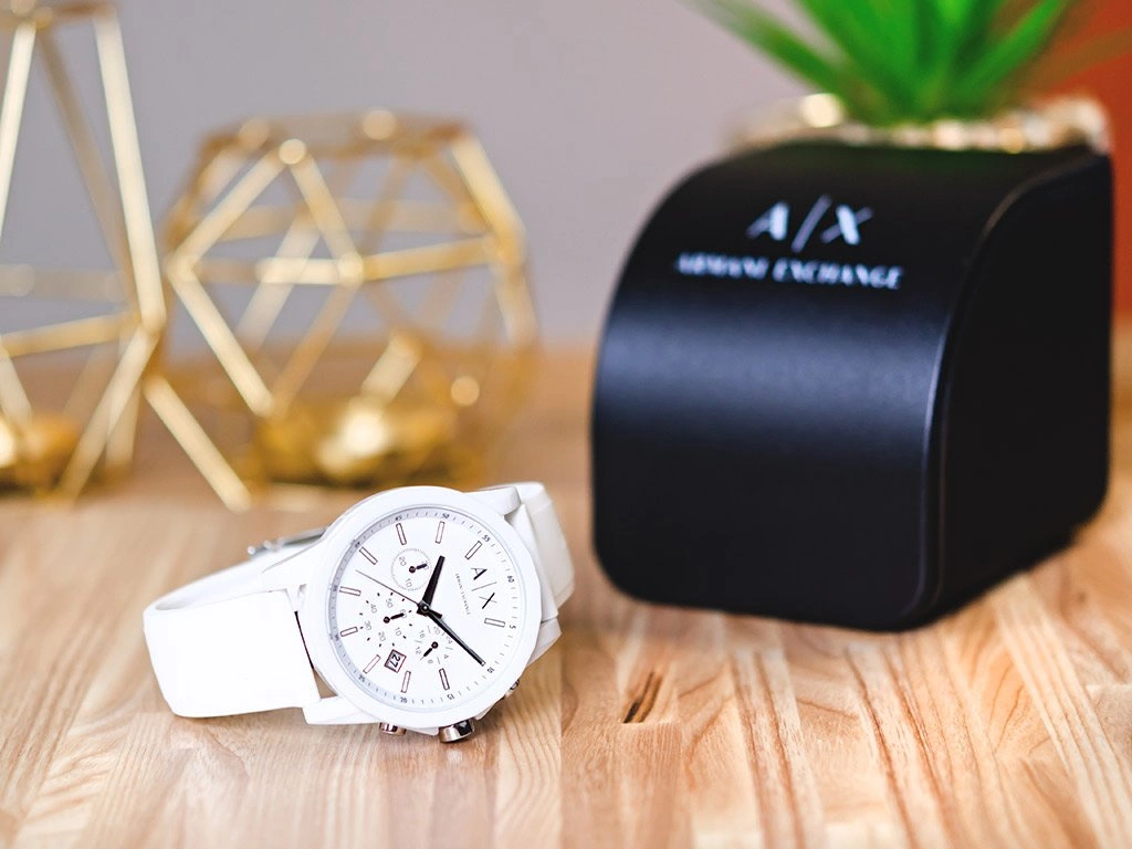 - Zegarek Męski Armani Exchange AX1325 biały na pasku, posiada funkcje takie jak stoper i datownik.