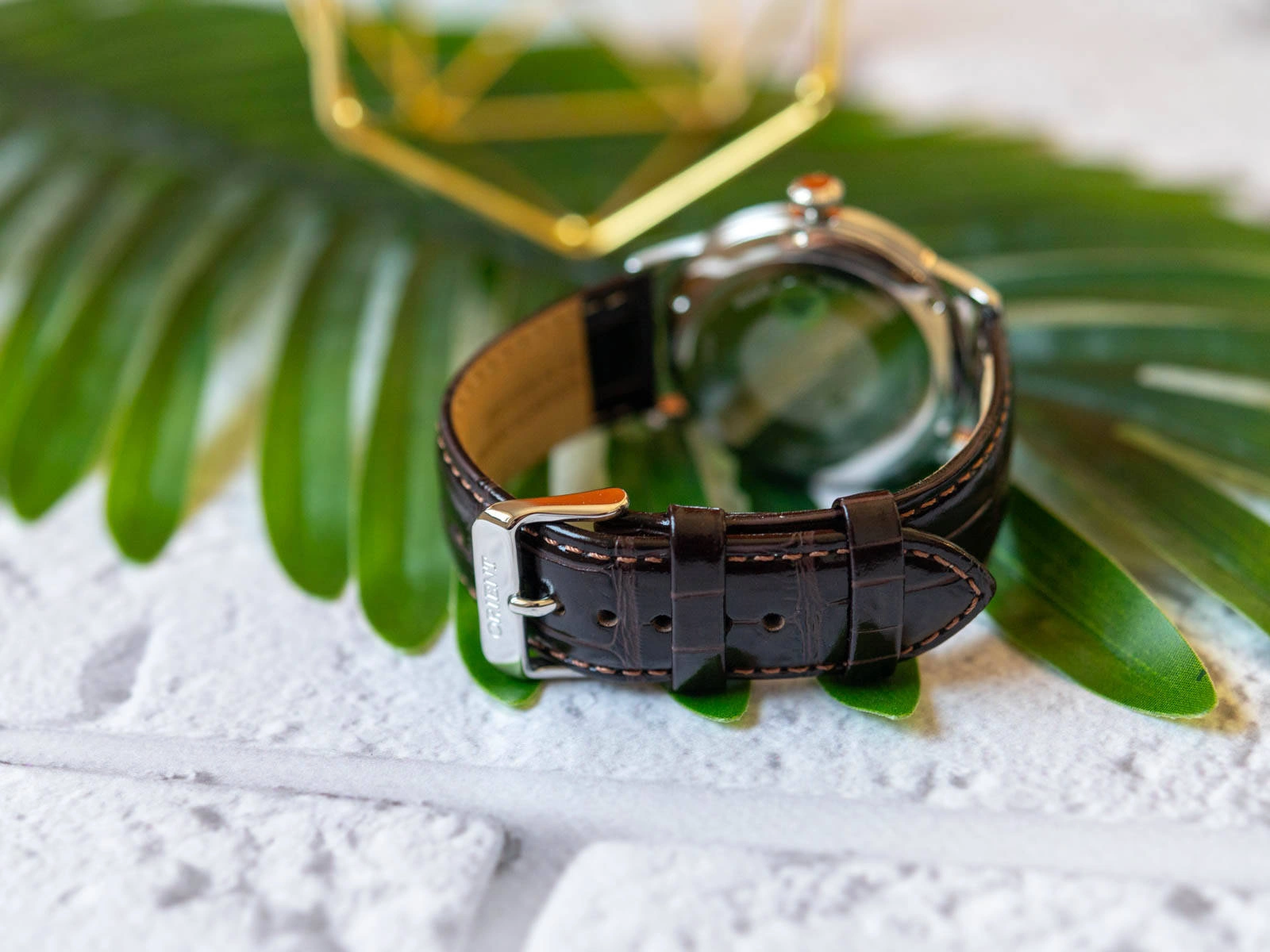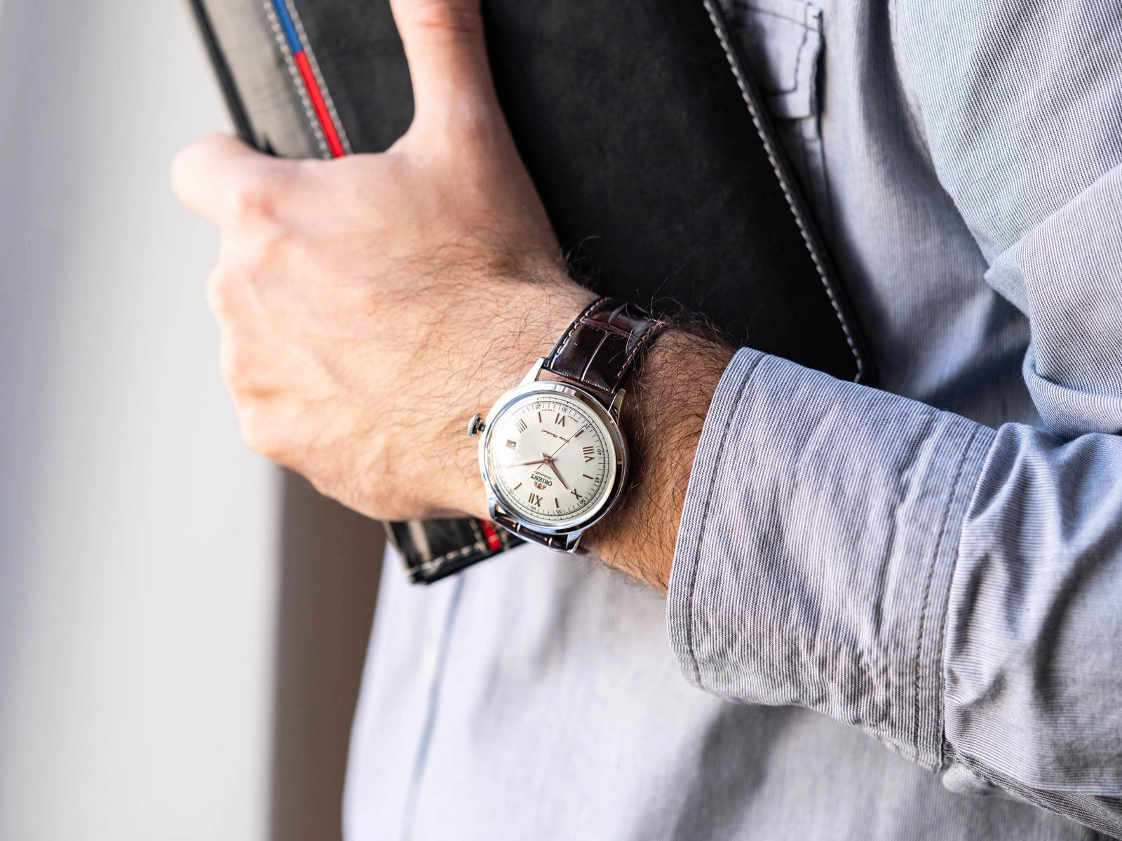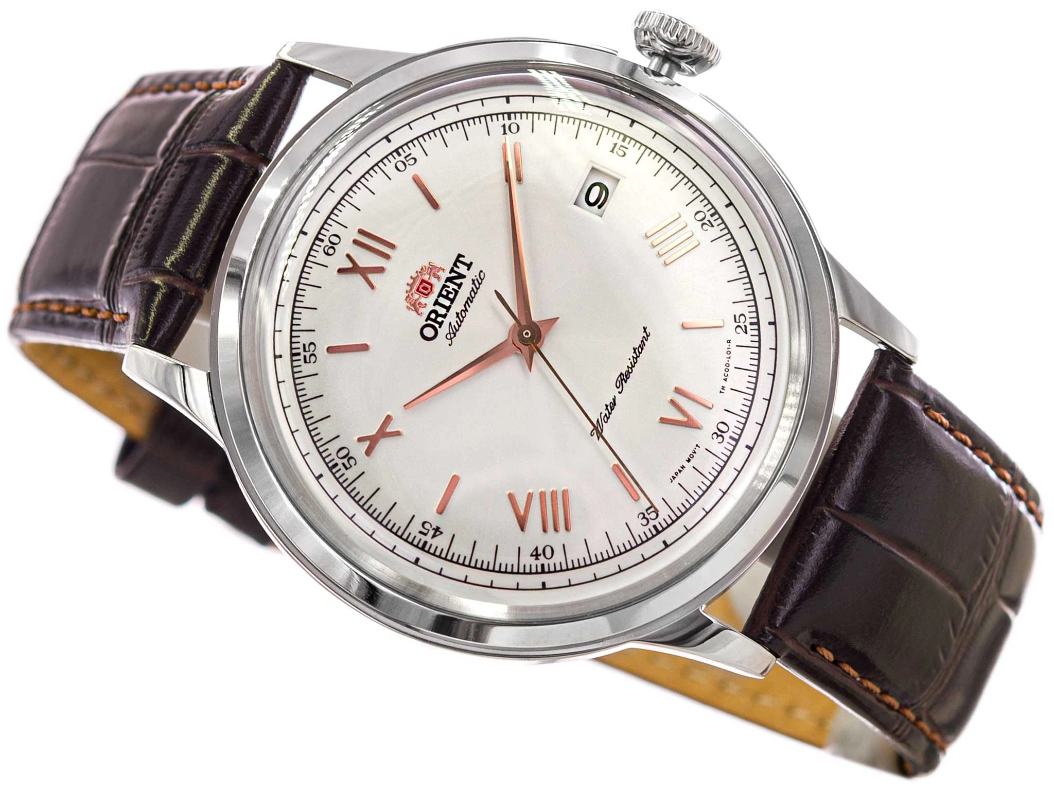 Męski zegarek Orient FAC00008W0 2nd Generation Bambino posiada mechanizm automatyczny, który czerpie energię z ruchu ręką. Można również dokręcić go, poprzez obracanie koronką w prawo. Nie wymaga cyklicznej wymiany baterii, gdyż mechanizm napędza się poprzez ruch. Zgrabna srebrna koperta została wykonana z wysokiej jakości stali szlachetnej i zawieszona na wygodnym skórzanym pasku w kolorze ciemnego brązu. Czytelna srebrna tarcza została zabezpieczona wypukłym szkiełkiem mineralnym. Na niej, oprócz czytelnych indeksów w postaci cyfr rzymskich w kolorze różowego złota, znajduje się okienko datownika wskazującego aktualny dzień miesiąca. Uniwersalne i zawsze modne połączenie kolorów - brązu i srebra, powoduje że model ten elegancko prezentuje się na męskim nadgarstku. Zegarek będzie idealnym wyborem dla mężczyzn, którzy szukają precyzyjnego i stylowego dodatku.