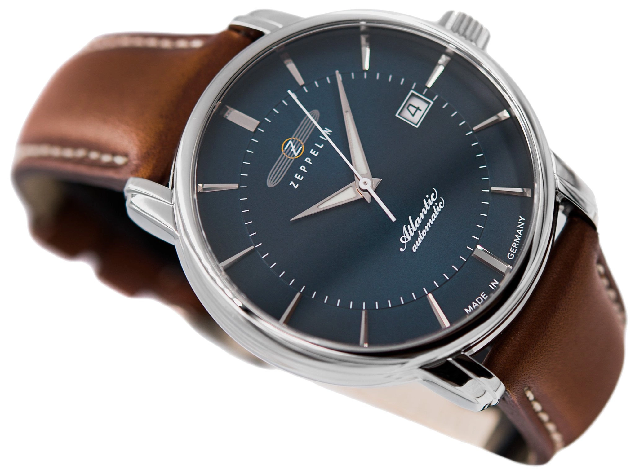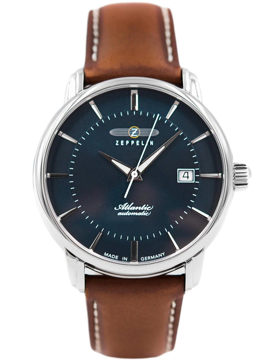 ZEPPELIN ATLANTIC 8452-3 będzie idealnym dodatkiem dla eleganckiego mężczyzny, chociażby poprzez użytą kolorystykę popularnego brązu w połączeniu ze srebrem i granatowym. Prosta, ale wyrazista tarcza pokryta jest wypukłym szkiełkiem szafirowym. Został na niej zamieszczony datownik przy godzinie 3. Wskazuje aktualny dzień miesiąca. Dodatkowo wskazówki pokryte są fluorescencyjną farbą, więc po naświetleniu, świecą w ciemności przez jakiś czas. Czasomierz pracuje w oparciu o automatyczny mechanizm szwajcarski ETA 2824-2 z liczbą 25 kamieni łożyskujących. Zegarek będzie pracował, jeżeli będzie noszony na nadgarstku. Można go również ręcznie dokręcić, za pomocą koronki.