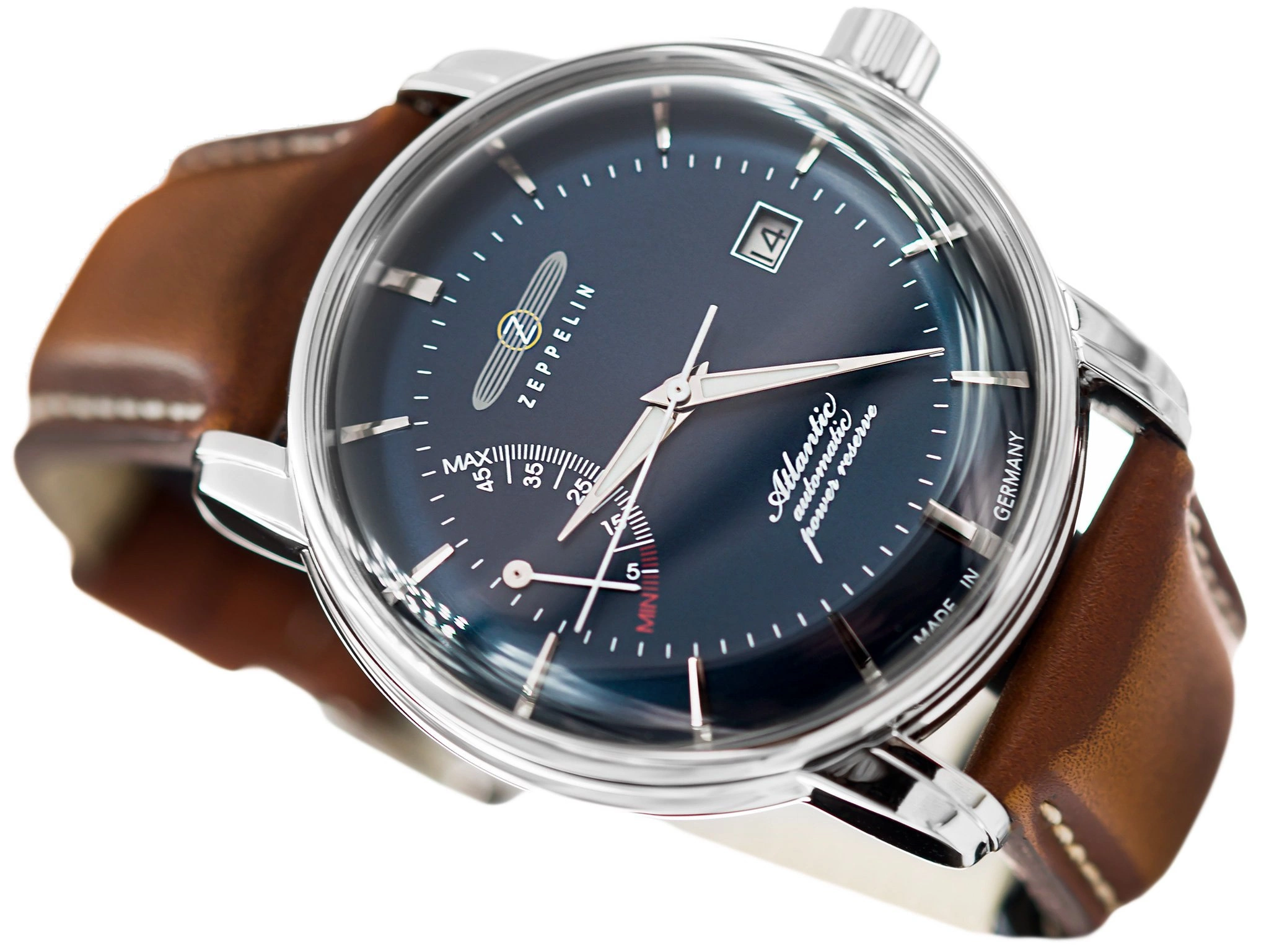 ZEPPELIN ATLANTIC 8462-3 elegancko prezentuje się na męskim nadgarstku. Użyta kolorystyka, połączenie granatowego, srebrnego z brązem, powoduje że zegarek prezentuje się świetnie. Na tarczy modelu, zamieszony jest datownik, który wskazuje aktualny dzień miesiąca. Z lewej strony znajduje się wskaźnik pokazujący czas rezerwy chodu, który wynosi 45 godzin. Cyferblat chroniony jest wypukłym, mineralnym szkiełkiem K1. Wskazówki srebrno-białe są fosforyzowane, po naświetleniu świecą przez jakiś czas. Dekielek zegarka jest przeszklony, co umożliwia podglądanie pracy automatycznego mechanizmu o kalibrze 9133 z liczbą 26 kamieni. Czasomierz będzie pracował, jeżeli będzie noszony na nadgarstku. Można go również ręcznie dokręcić, za pomocą koronki.