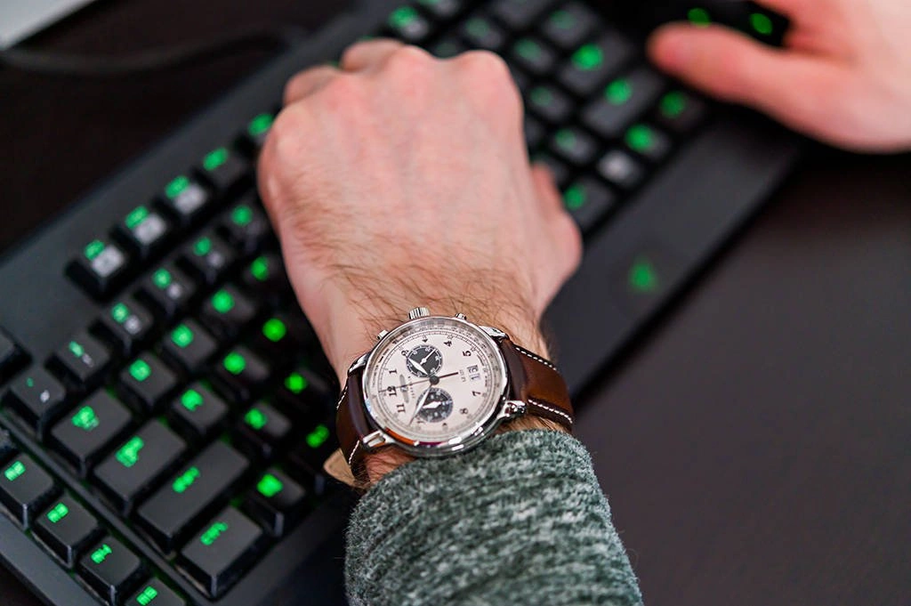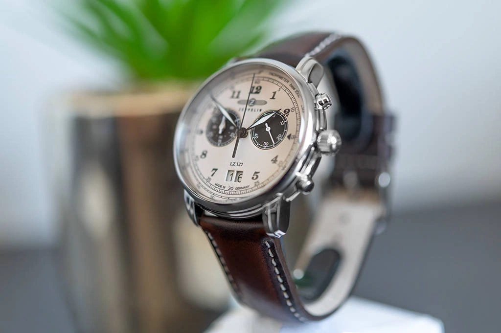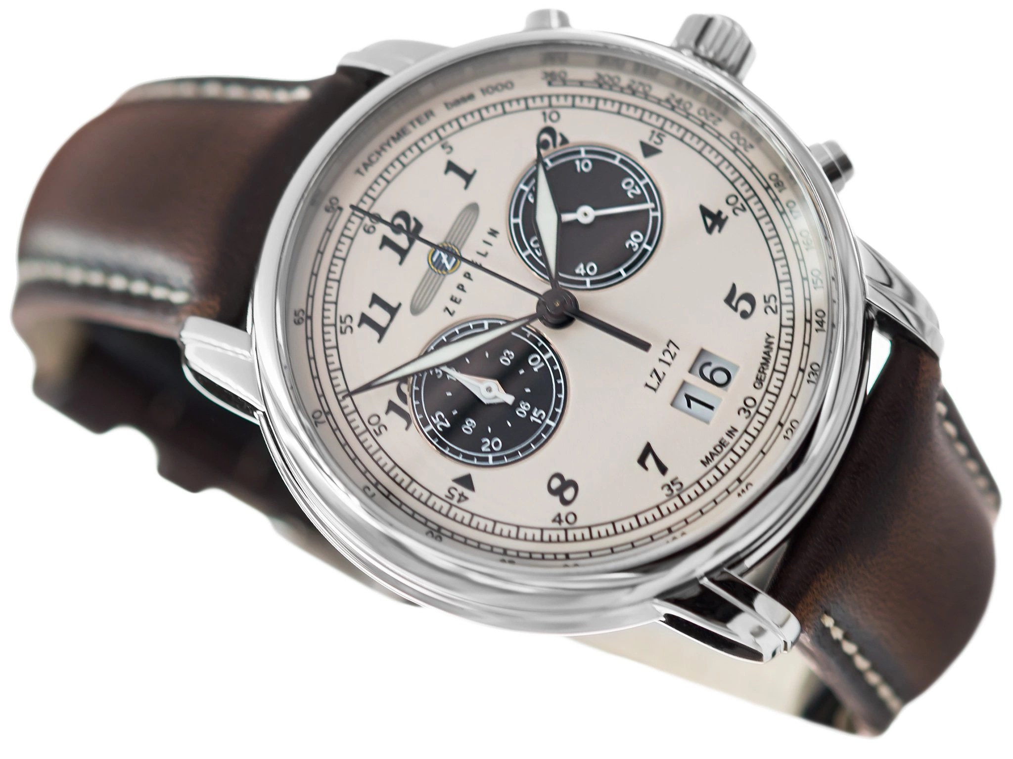 Kształt koperty zegarka ZEPPELIN 8684-5 LZ127 GRAFF ZEPPELIN jest typowy dla tej marki. Wypukłe mineralne szkiełko, chroni beżową tarczę, która została wyposażona w wiele przydatnych funkcji. W oko natychmiast wpada duży wyraźny datownik umiejscowiony przy godzinie 6. Model ten posiada również stoper analogowy, który obsługuje się za pomocą bocznych przycisków. Cyferblat oraz wskazówki zostały pokryte neobride, więc po naświetleniu świecą przez jakiś czas, co zdecydowanie ułatwia odczyt godziny w ciemności. Model ten efektownie prezentuje się na męskim nadgarstku. Nosi się go niezwykle wygodnie ze względu na niską wagę wynoszącą 65g, oraz dzięki gładkiemu paskowi ze skóry cielęcej.