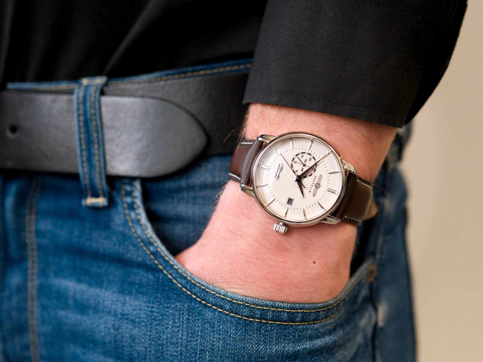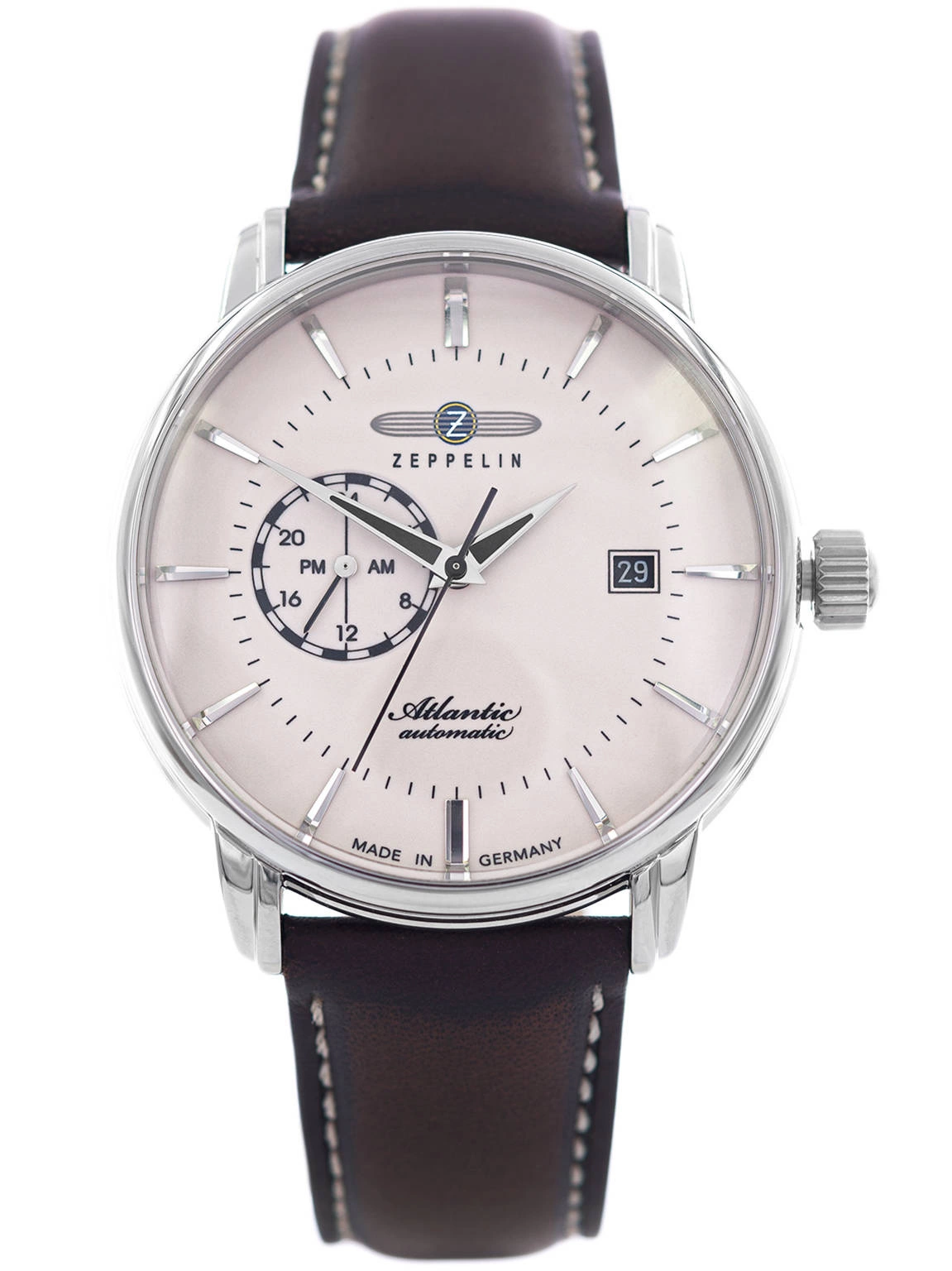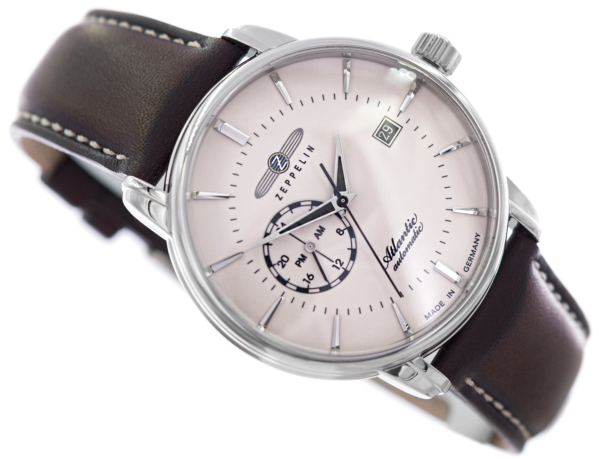 Elegancki zegarek ZEPPELIN ATLANTIC 8470-5 znakomicie prezentuje się na męskim nadgarstku. Na tarczy modelu, zamieszony jest rozbudowany datownik, który wskazuje aktualny dzień miesiąca oraz czas w formacie 24-godzinnym. Cyferblat chroniony jest wypukłym, mineralnym szkiełkiem K1. Tarcza jest fosforyzowana, po naświetleniu świeci przez jakiś czas. Dekielek zegarka jest przeszklony, co umożliwia podglądanie pracy automatycznego mechanizmu o kalibrze 8217 z liczbą 21 kamieni. Czasomierz będzie pracował, jeżeli będzie noszony na nadgarstku. Można go również ręcznie dokręcić, za pomocą koronki. Niemiecka precyzja oraz użycie najwyższej jakości komponentów sprawiają, że ZEPPELIN ATLANTIC 8470-5 to wysokiej klasy czasomierz, który spełni oczekiwania każdego pana. Eleganckie pudełko dołączone do tego modelu sprawia, że zegarek może stać się idealnym pomysłem na prezent.