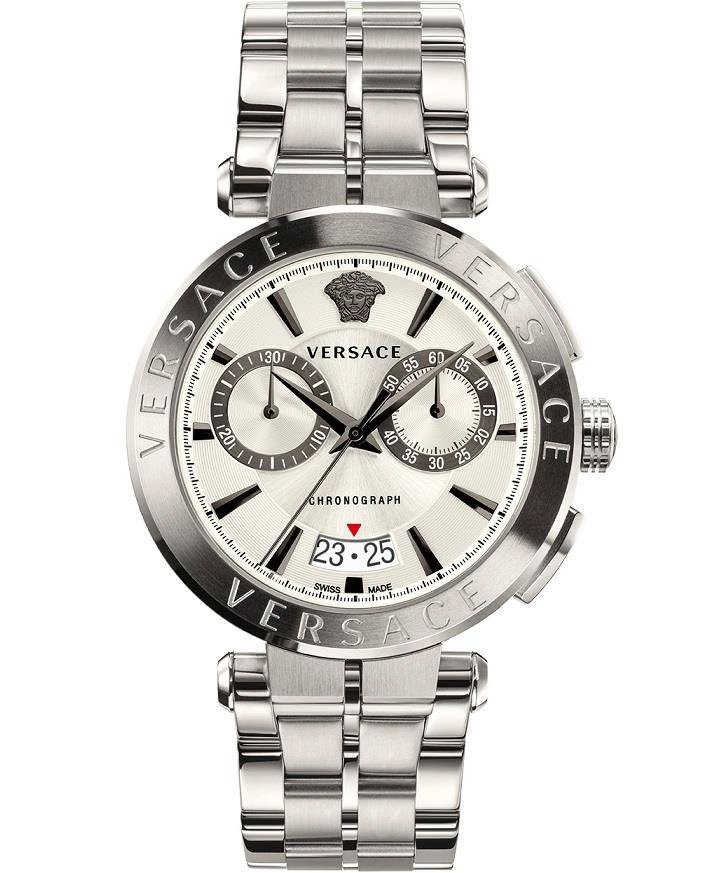 - Zegarek Męski Versace VE1D00319 srebrny na bransolecie, posiada funkcje takie jak stoper i datownik.