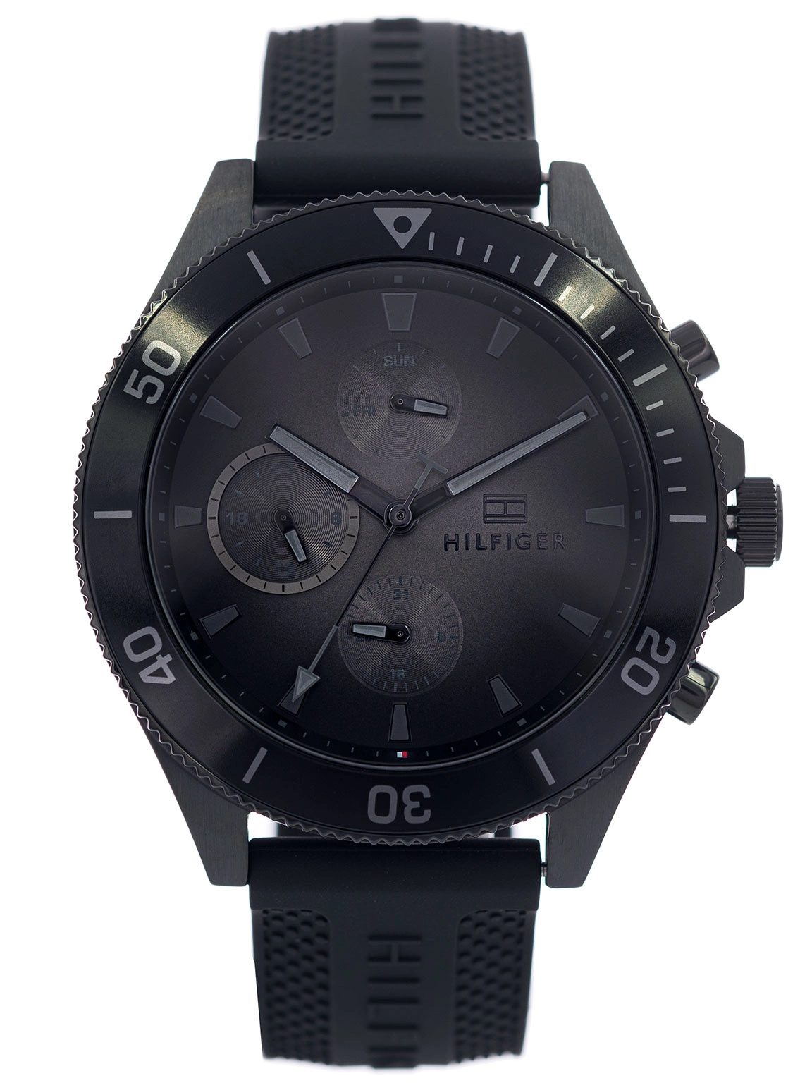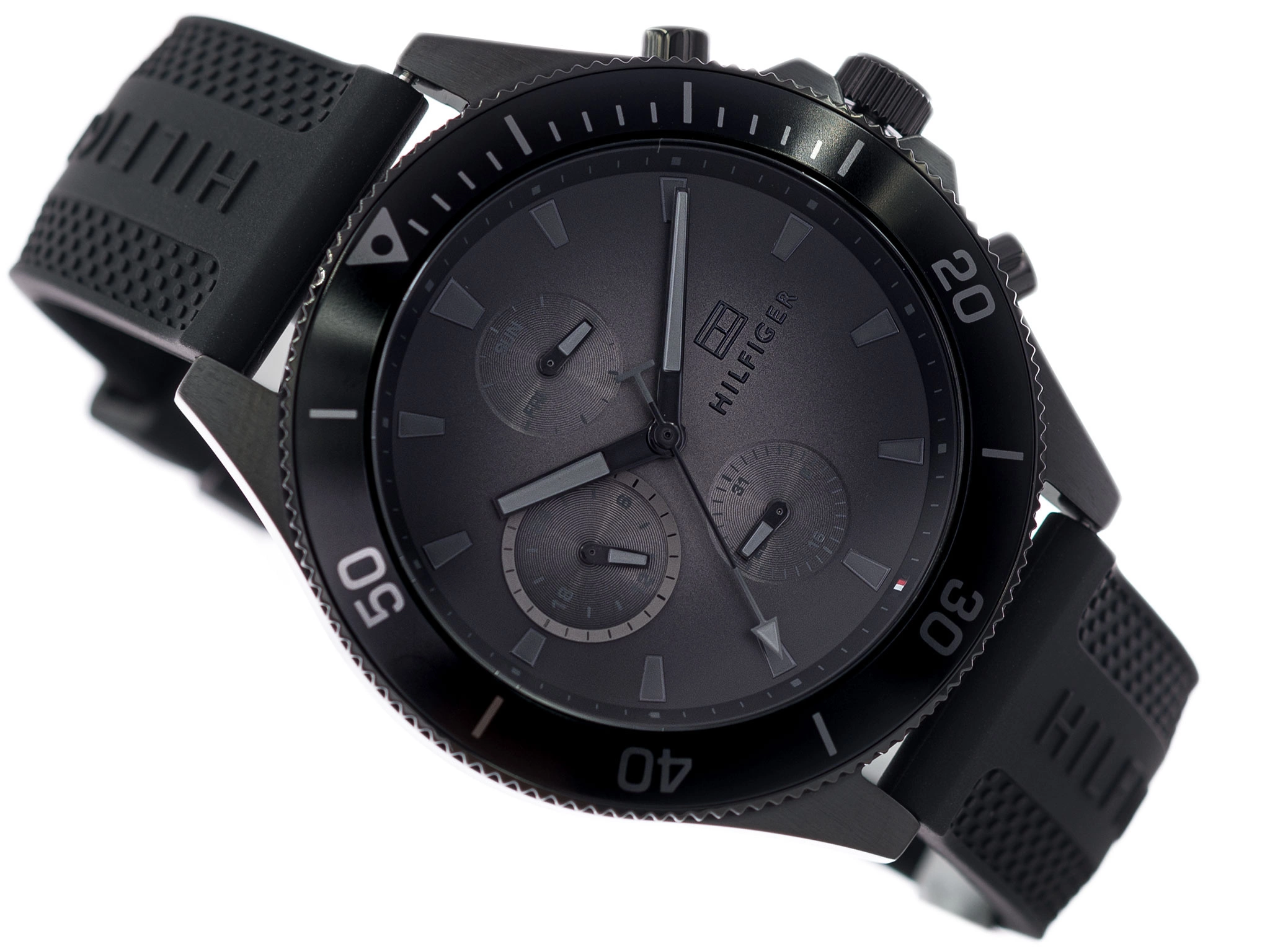 • Zegarek Męski Tommy Hilfiger 1791921 czarny na pasku, posiada funkcję datownika.