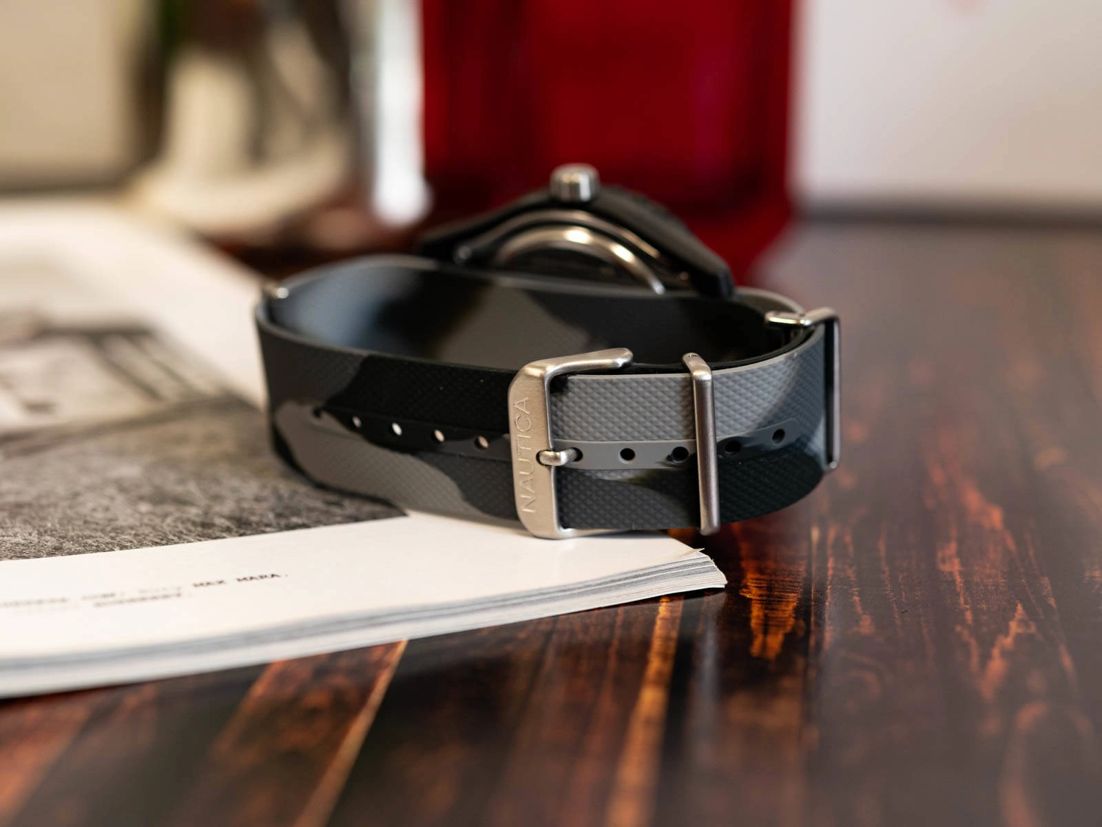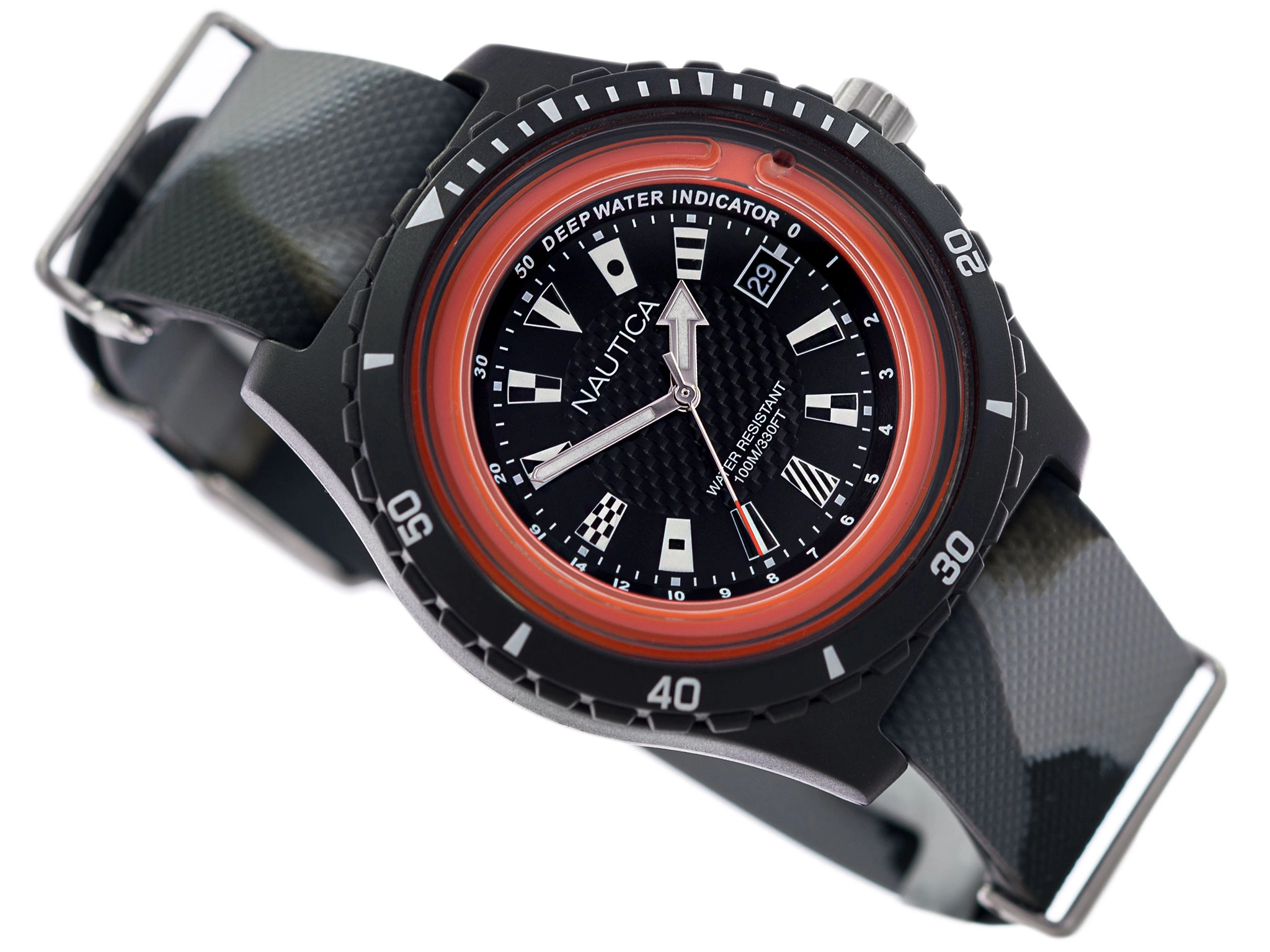 Nautica NAPPSRF005 Surfside to wyjątkowy model męski w sportowym stylu. Koperta z tworzywa sztucznego połączona jest z gumowym paskiem nato, w odcieniach czerni i szarości. Model wyposażony jest w datownik, który wskazuje aktualny dzień miesiąca. W przypadku krótszych miesięcy, datę należy skorygować ręcznie. Głębokościomierz wskazuje przybliżoną głębokość, która nie jest dokładna w 100%. Służy on do rekreacyjnego użytku. Fosforyzowane wskazówki i indeksy po naświetleniu świecą przez jakiś czas w ciemności. Ten funkcjonalny zegarek, fantastycznie prezentuje się na męskim nadgarstku. Idealnie sprawdzi się podczas pływania, ze względu na wysoką klasę wodoszczelności 100M.