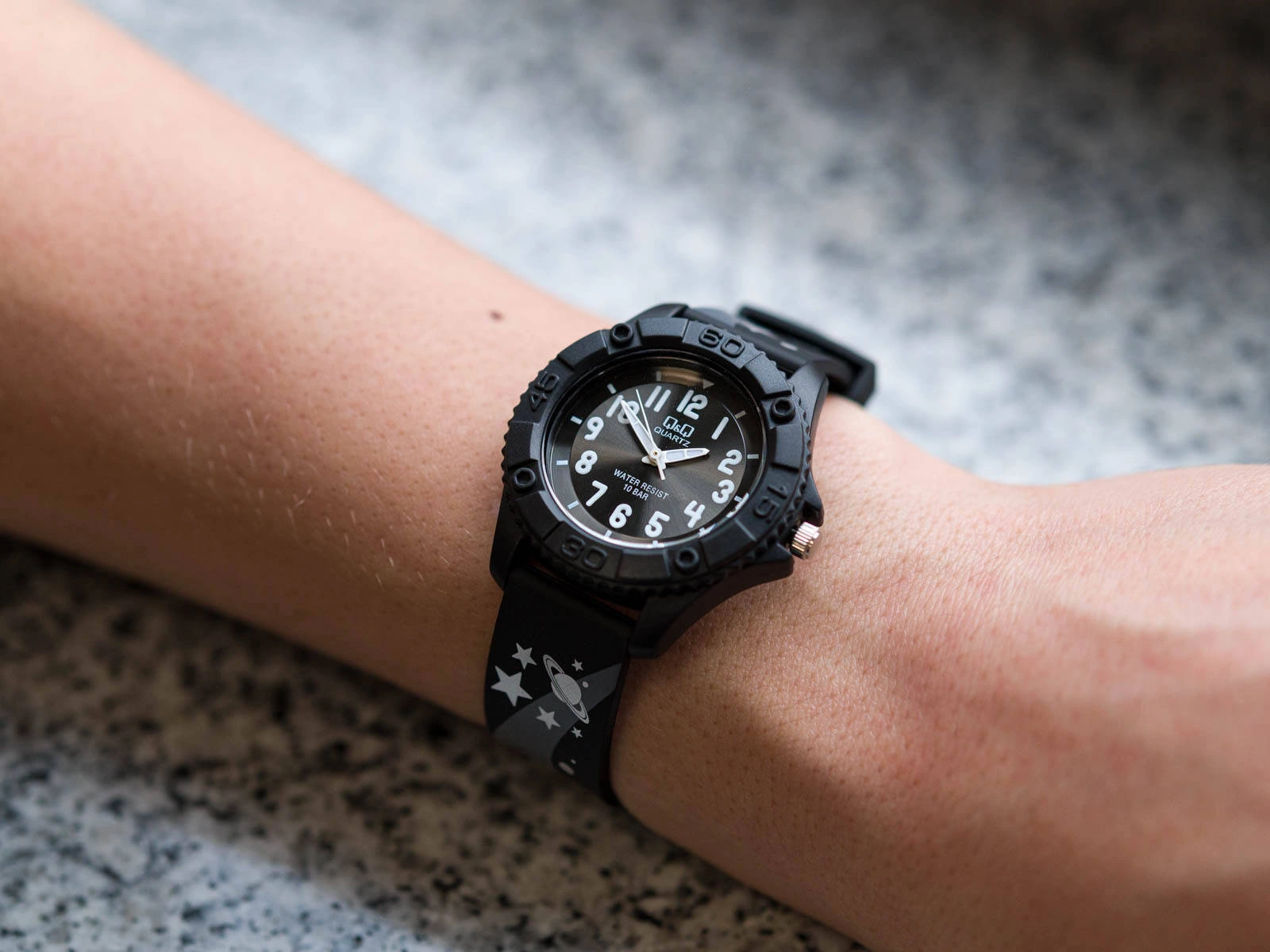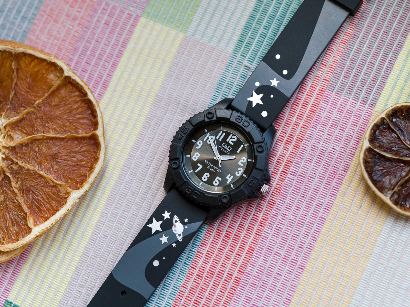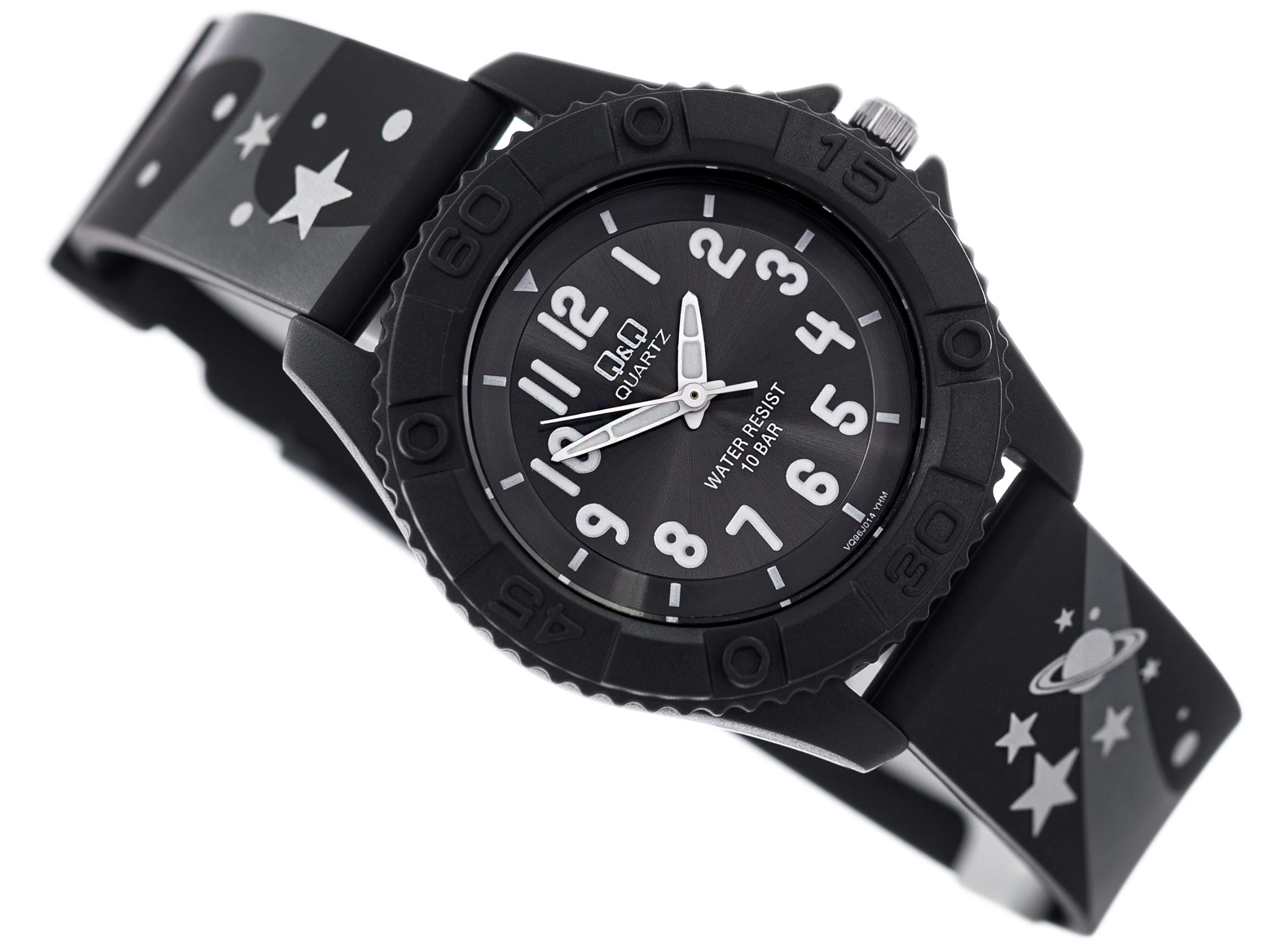Q&Q VQ96J014Y będzie świetnym wyborem na prezent, dla chłopca rozpoczynającego przygodę z nauką zegara. Idealnie sprawdzi się, jako pierwszy zegarek dla dziecka, ze względu na świetny wzór. Błyszczący, czarny cyferblat chroniony jest przejrzystym płaskim szkiełkiem akrylowym. Godziny oznaczone są białymi cyframi arabskimi. Odczyt aktualnej godziny nie stanowi żadnego problemu, dzięki zastosowaniu kontrastowych kolorów. Wygodny pasek z tworzywa sztucznego, ozdobiony jest rysunkiem gwiazdek i planet, co z pewnością spodoba się chłopcom, którzy interesują się kosmosem. Klasa wodoszczelności 10BAR pozwala na pływanie z zegarkiem na ręku, to bardzo praktyczny parametr wśród dziecięcych modeli zegarków.