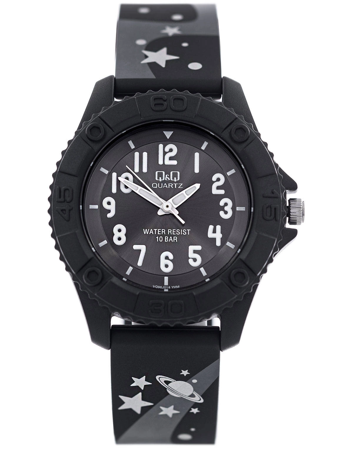 - Wodoszczelny Zegarek dziecięcy Q&Q VQ96J014Y czarny na pasku.