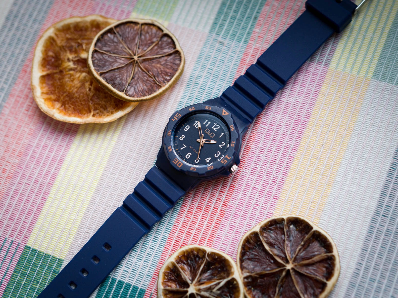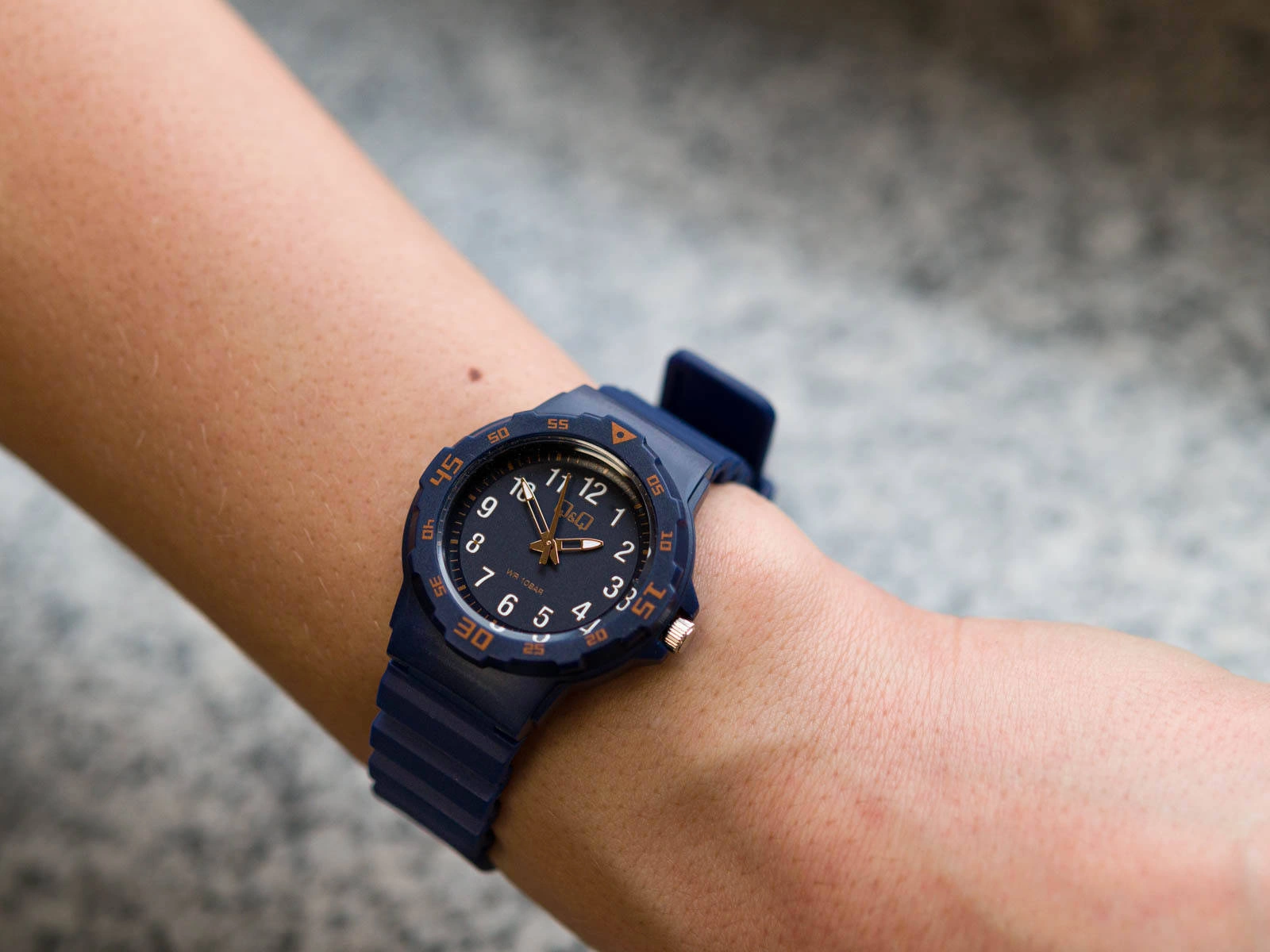 Q&Q VR19J018Y będzie świetnym wyborem na prezent, dla chłopca rozpoczynającego przygodę z nauką zegara. Idealnie sprawdzi się, jako pierwszy zegarek dla dziecka, ze względu na jego czytelność. Granatowy cyferblat, chroniony jest przejrzystym, płaskim szkiełkiem akrylowym. Godziny oznaczone są białymi cyframi arabskimi. Odczyt aktualnej godziny nie stanowi żadnego problemu, dzięki zastosowaniu kontrastowych kolorów. Zarówno wskazówki, jaki i cyfry są fosforyzowane, więc po naświetleniu świecą przez jakiś czas. Wygodny pasek z tworzywa sztucznego, będzie pasował na nadgarstek o obwodzie od 14,5cm do 21cm. Klasa wodoszczelności 10BAR pozwala na pływanie z zegarkiem na ręku, to bardzo praktyczny parametr wśród dziecięcych modeli zegarków.