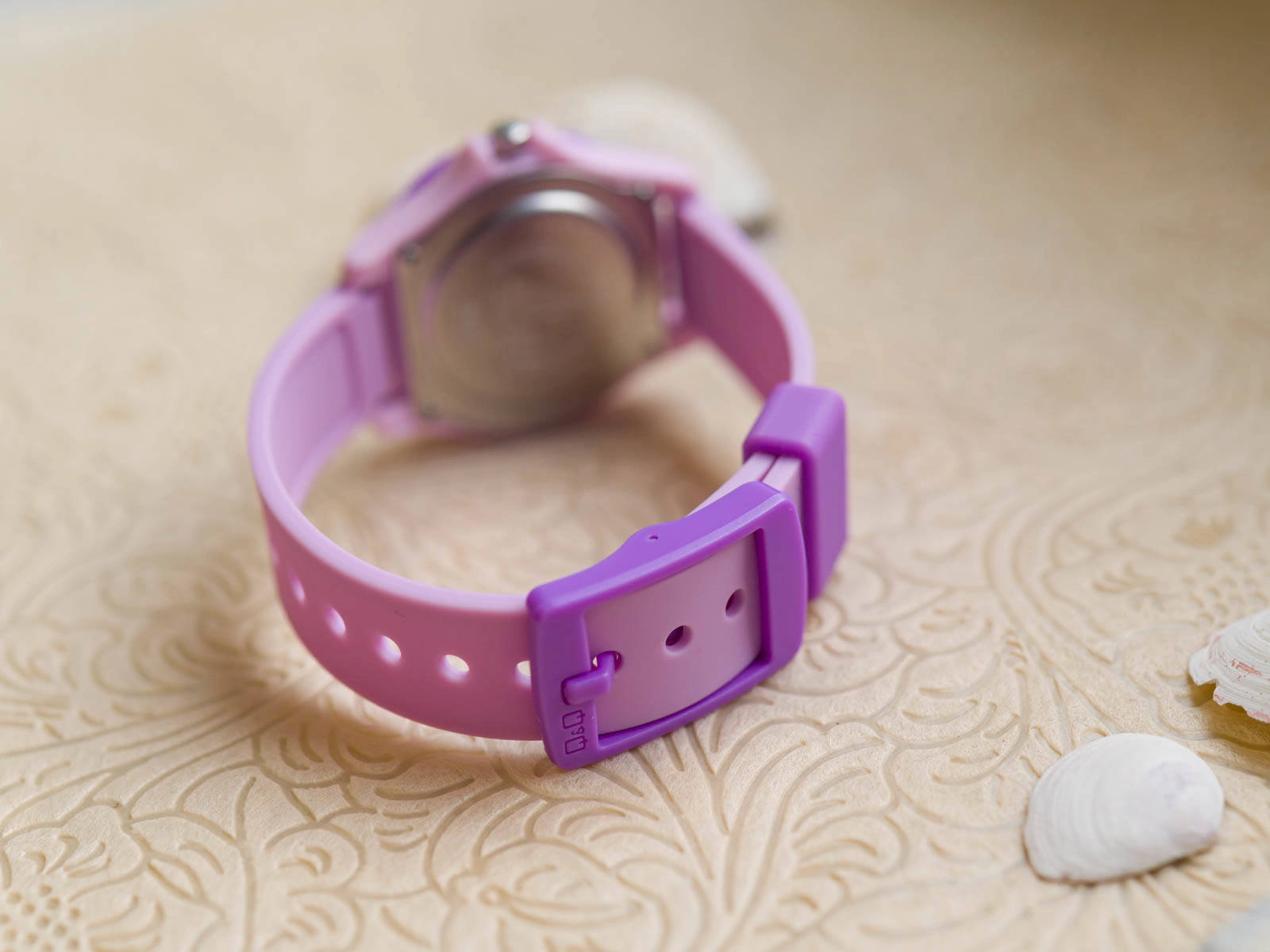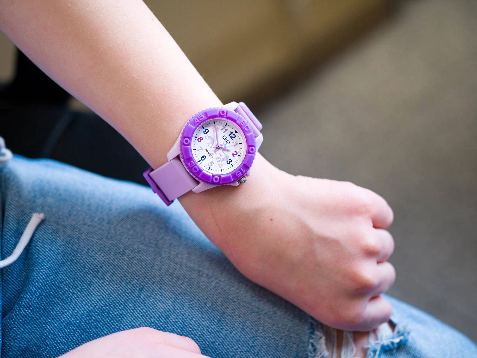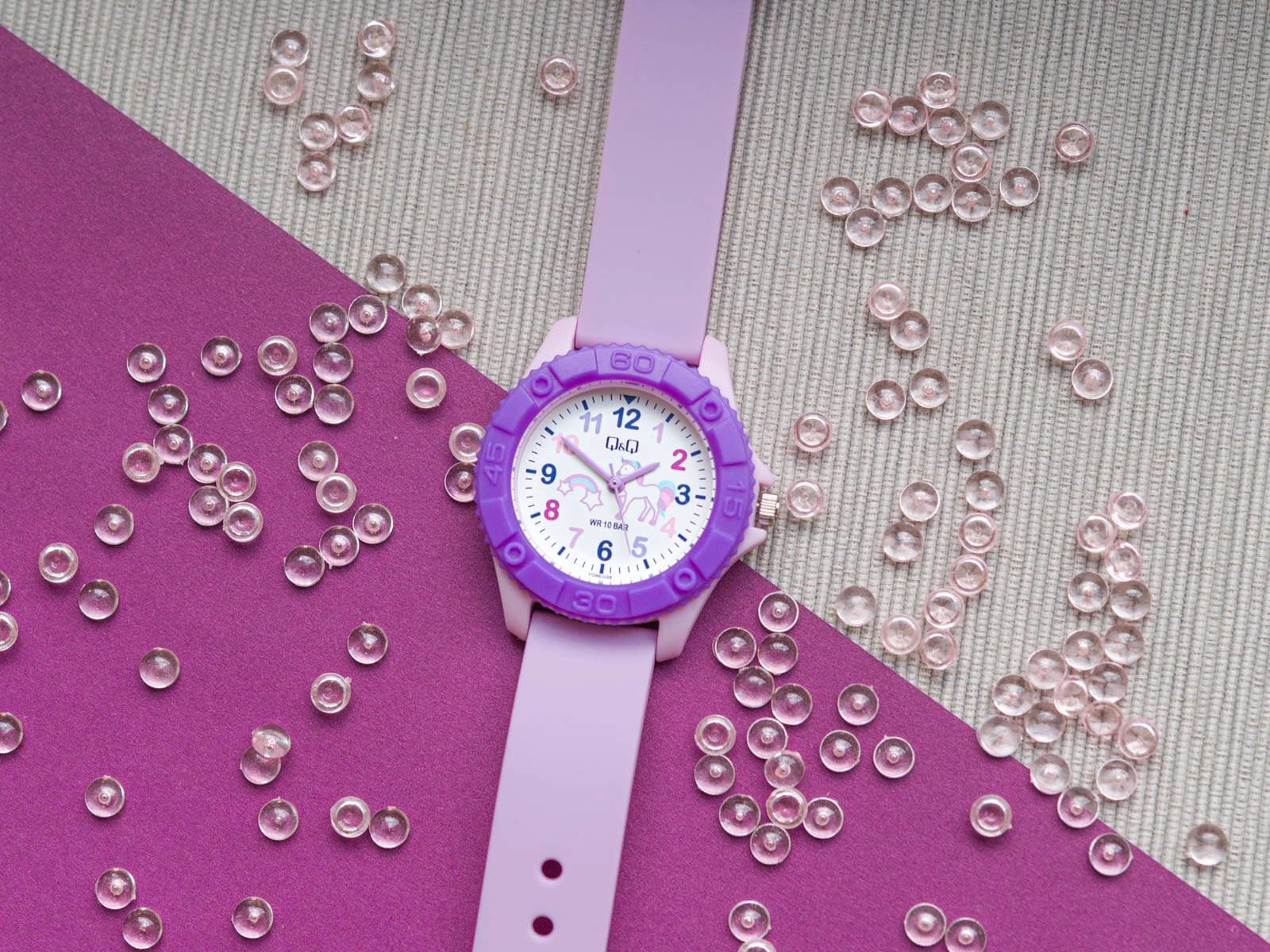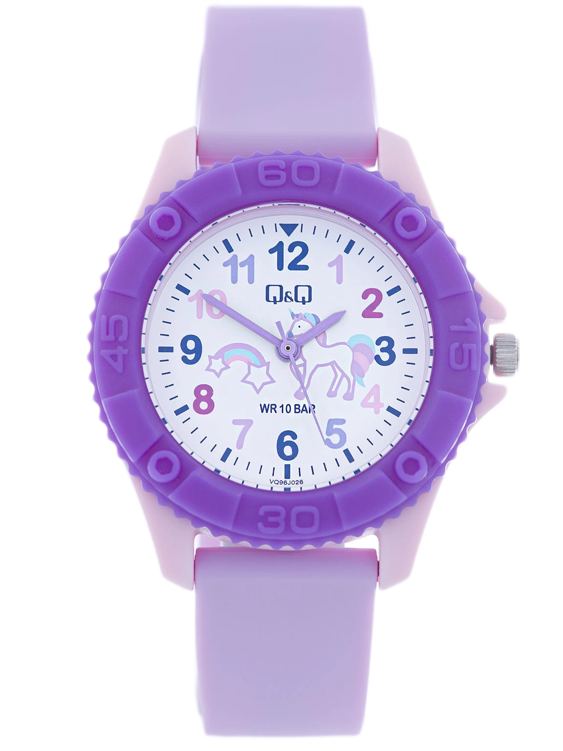 • Wodoszczelny Zegarek dziecięcy Q&Q VQ96J026Y fioletowy na pasku.