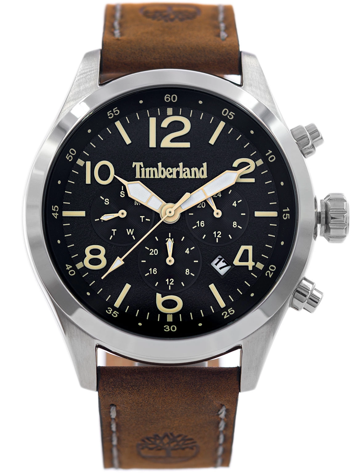 - Wodoszczelny Zegarek Męski Timberland TBL.15249JS/02 brązowy na pasku, posiada funkcję rozbudowanego datownika, neobrite oraz dual-time.