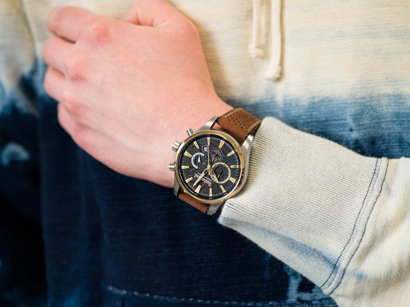 Timberland TDWGC2102402 wyróżnia się niezwykle stylowym wyglądem. Srebrna koperta zawieszona jest na brązowym pasku, wykonanym ze skóry pozyskanej w odpowiedzialny i ekologiczny sposób. Model ten wyposażony jest w stoper analogowy, który obsługuje się za pomocą przycisków umiejscowionych z prawej strony koperty. Datownik wskazuje aktualny dzień miesiąca, w przypadku krótszych miesięcy, datę należy skorygować ręcznie. Na czarnym cyferblacie znajduje się logo producenta, które nadaje tarczy trójwymiarowości. Przy godzinie 9, znajduje się wskazówka, odpowiedzialna za wskazywanie czasu w formacie 24 godzinnym. Złote wskazówki i indeksy są fosforyzowane, więc po naświetleniu świecą przez jakiś czas w ciemności. Zegarek niezwykle efektownie prezentuje się na męskim nadgarstku, będzie idealnym dopełnieniem codziennej stylizacji.