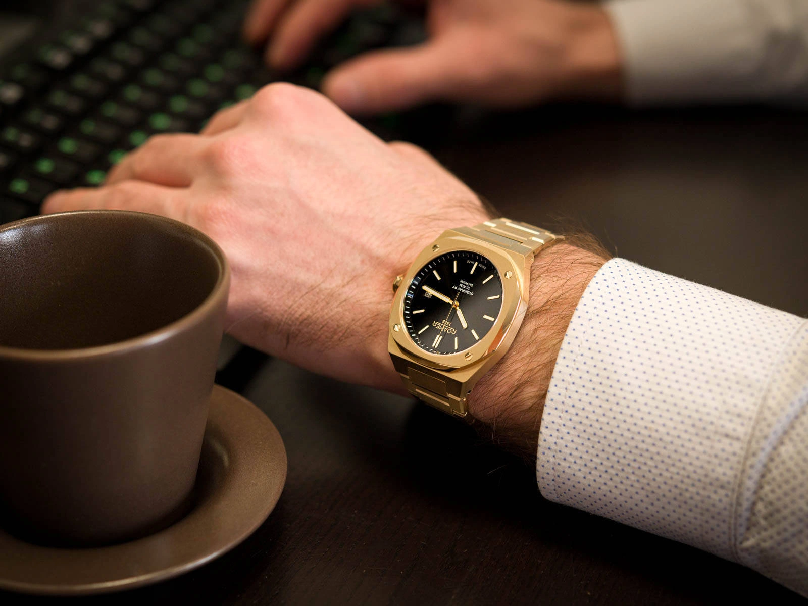 - Wodoszczelny Zegarek Męski Roamer 854833 48 55 50 złoty na bransolecie, posiada funkcję datownika.