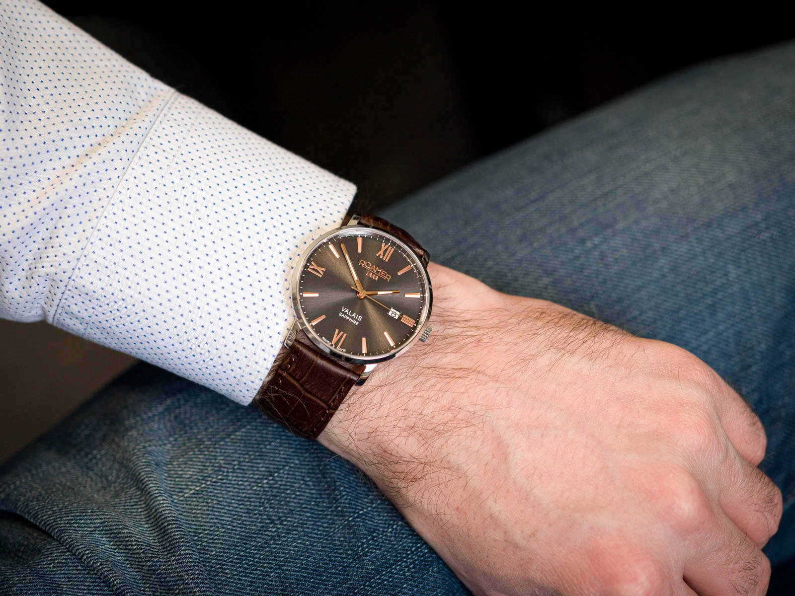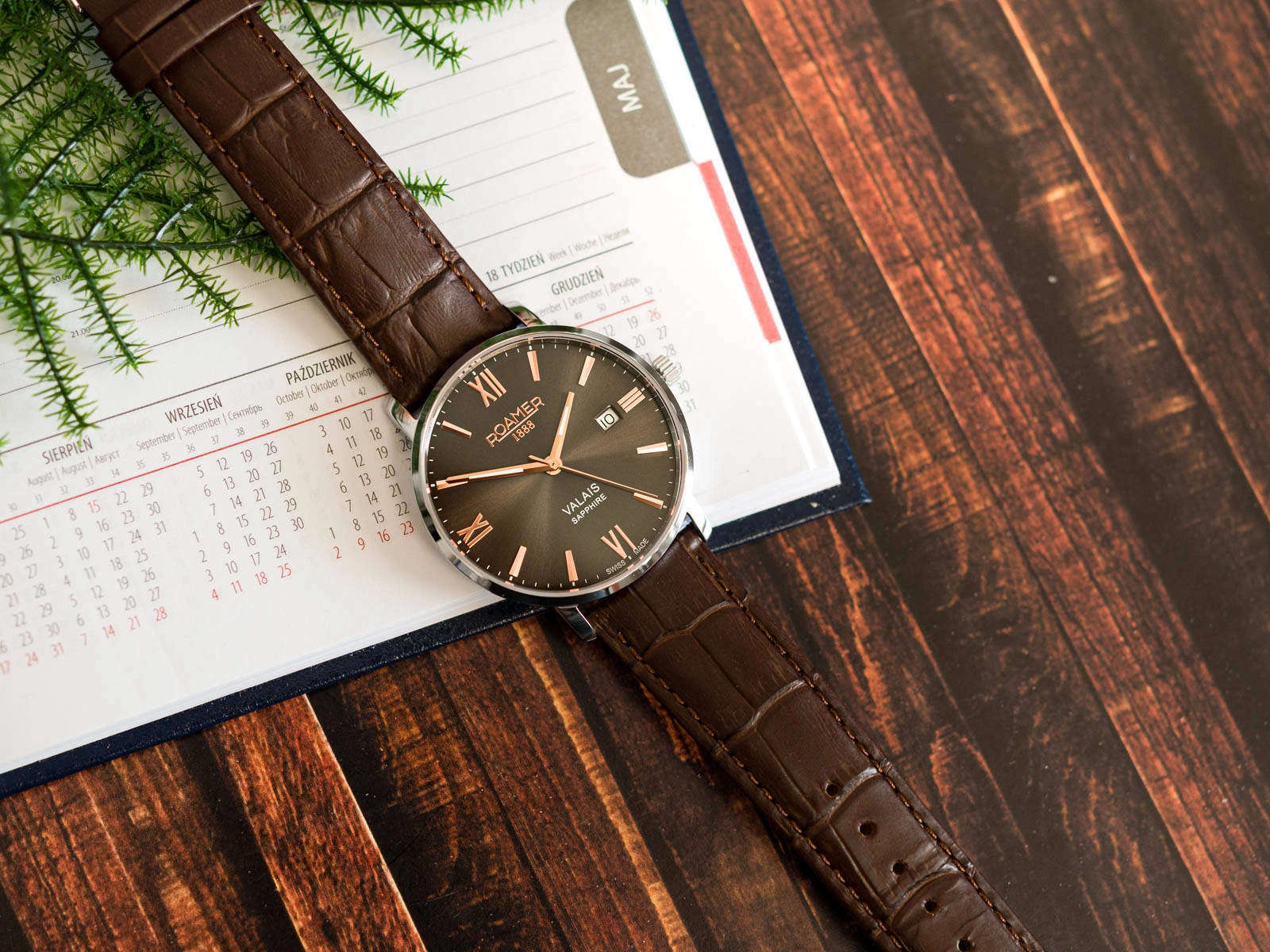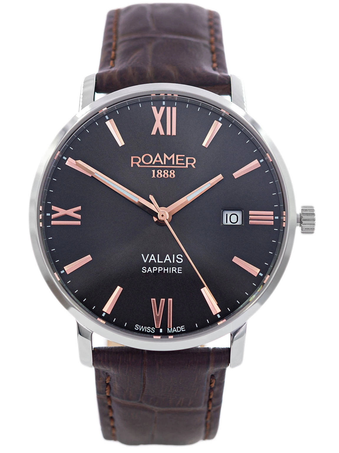 Roamer Valais 958833 41 53 05 to idealna propozycja dla mężczyzn, szukających eleganckiego i klasycznego zegarka. Przykuwa uwagę świetnie skomponowaną kolorystyką, połączenie brązu, srebra, szarości i różowego złota może przyprawić o zawrót głowy. Błyszczący cyferblat oznakowany jest nazwą marki i serii. Oprócz świetnego wyglądu, model ten wyposażony jest w precyzyjny szwajcarski mechanizm, datownik oraz fosforyzowane wskazówki. Ze względu na minimalistyczny wygląd i smukłą kopertę, model ten sprawdzi się świetnie jako dodatek do garnituru czy koszuli.