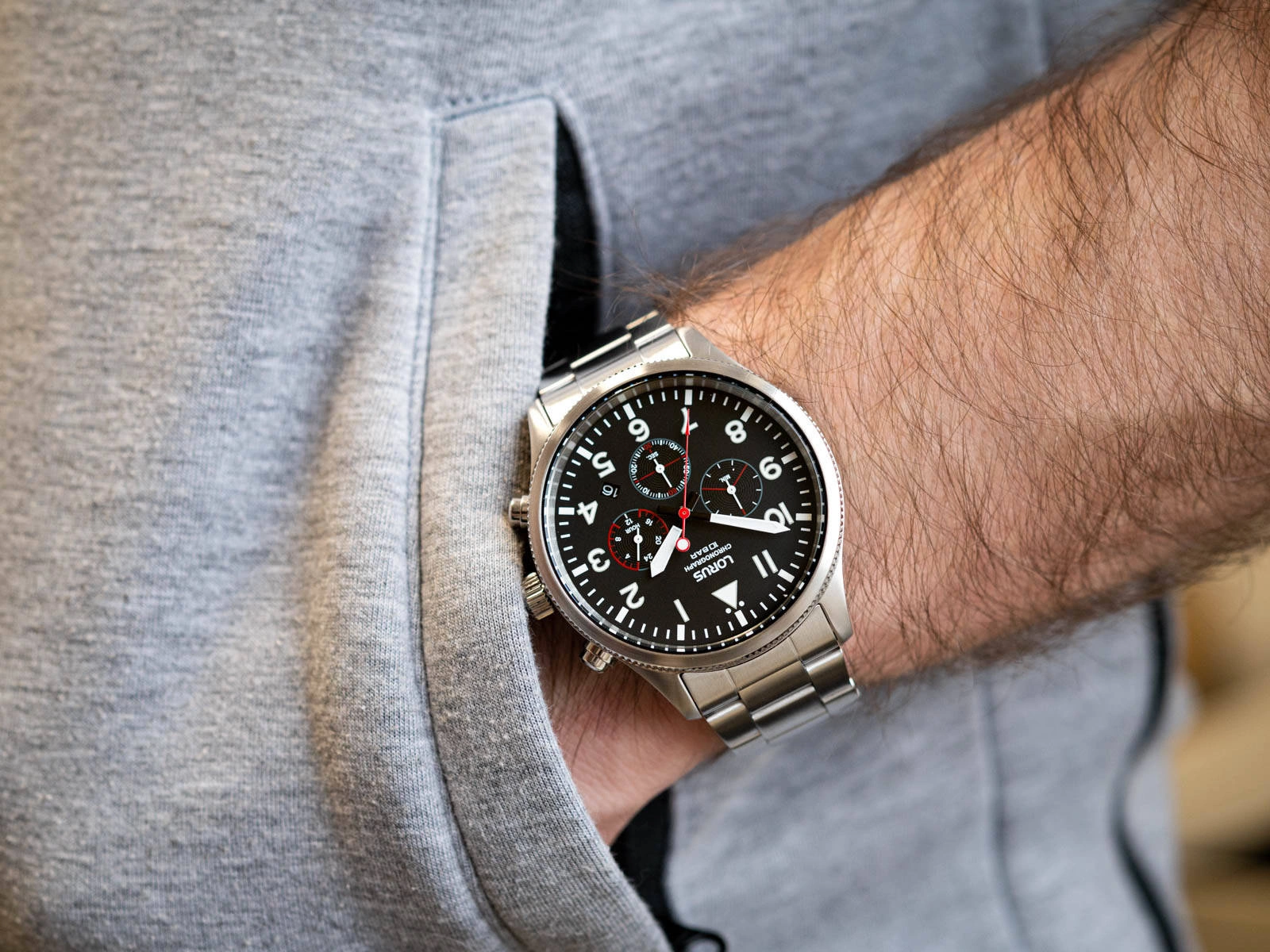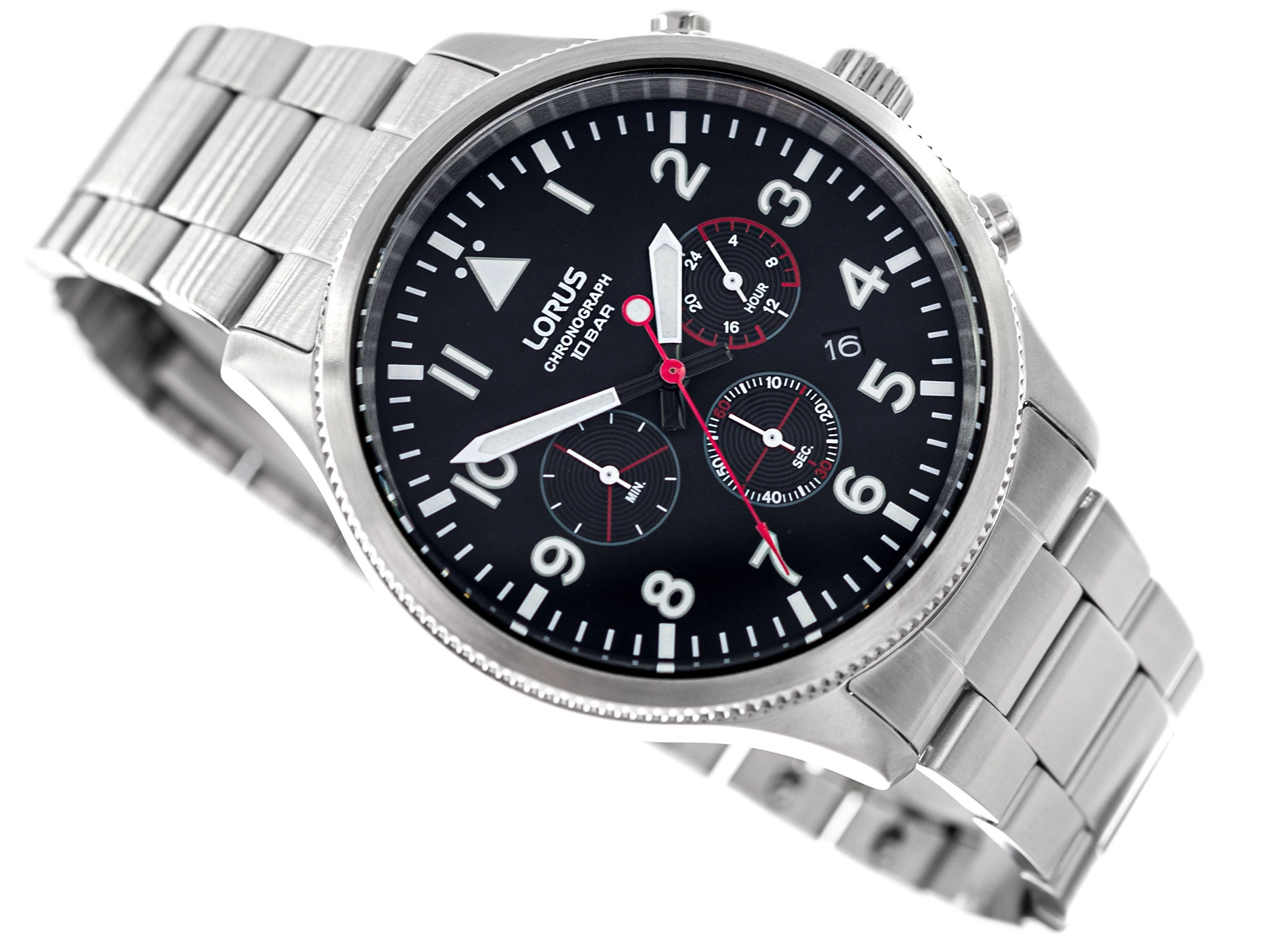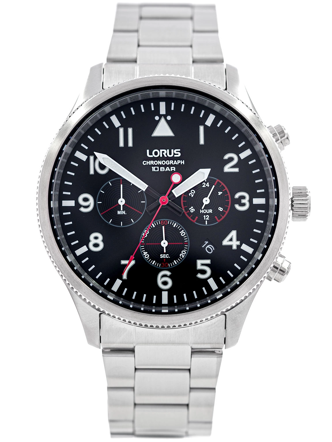 - Wodoszczelny Zegarek Męski Lorus RT363JX9 srebrny na bransolecie, posiada funkcje takie jak stoper i datownik.