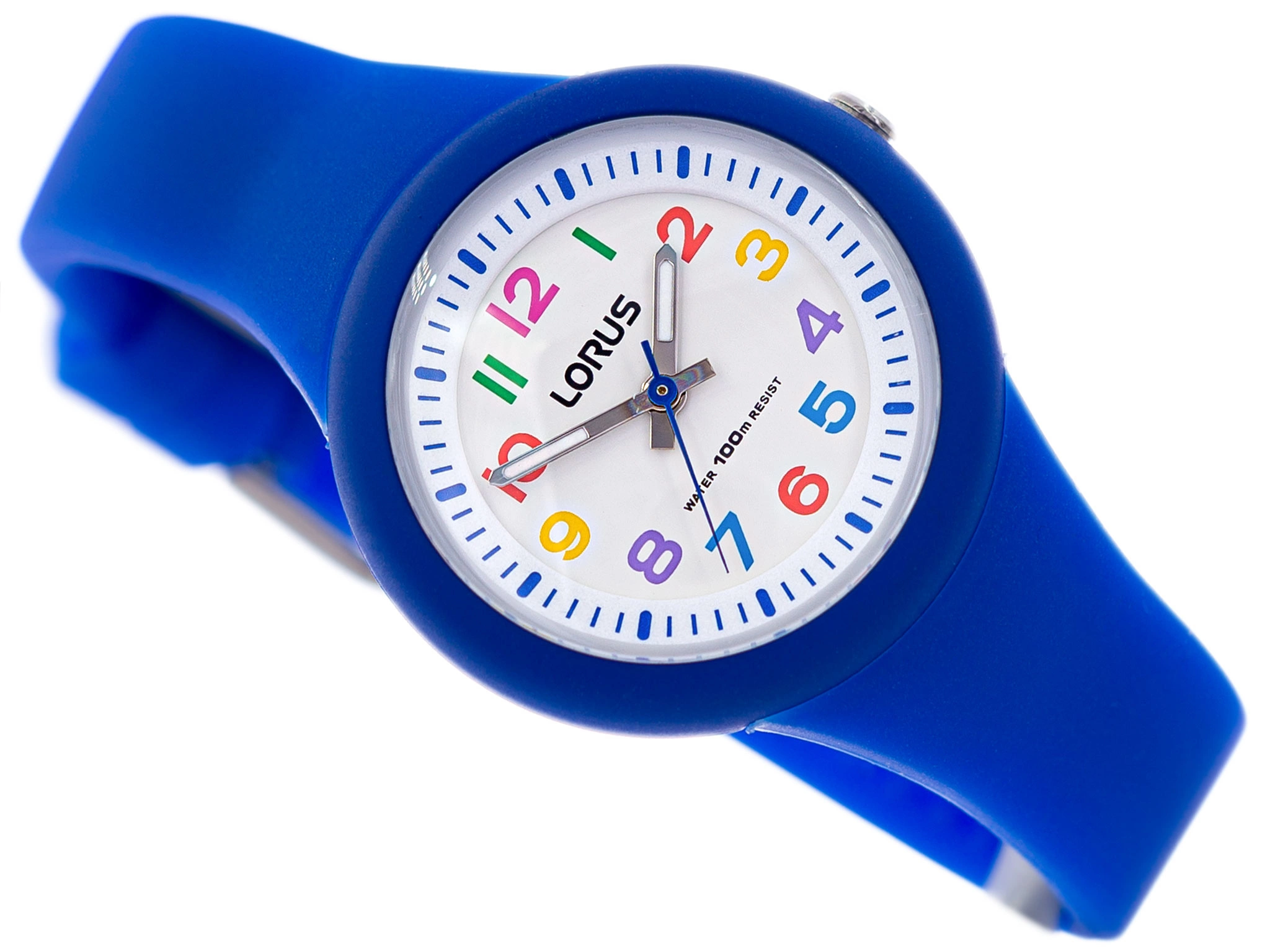 Lorus RRX45EX9 jest modelem stworzonym z myślą o młodych użytkownikach. Koperta i pasek zostały wykonane z wygodnego i lekkiego tworzywa sztucznego w kolorze niebieskim. Na białej tarczy umieszczone są wyraźne, kolorowe cyfry, które ułatwią odczyt godziny. Taki rodzaj cyferblatu stworzono z myślą o dzieciach, które rozpoczynają przygodę z czasem. Wskazówki pokryte są neobrite, wiec po naświetleniu świecą w ciemności przez jakiś czas. Lorus RRX45EX9 jest wodoszczelny, można w nim pływać bez obaw o zalanie. Należy pamiętać, żeby nie korzystać z koronki pod wodą. Model ten posiada solidny mechanizm kwarcowy, napędzany wymienną baterią. Do zegarków Lorus dołączone jest stylowe i oryginalne pudełko, które pochodzi od producenta.