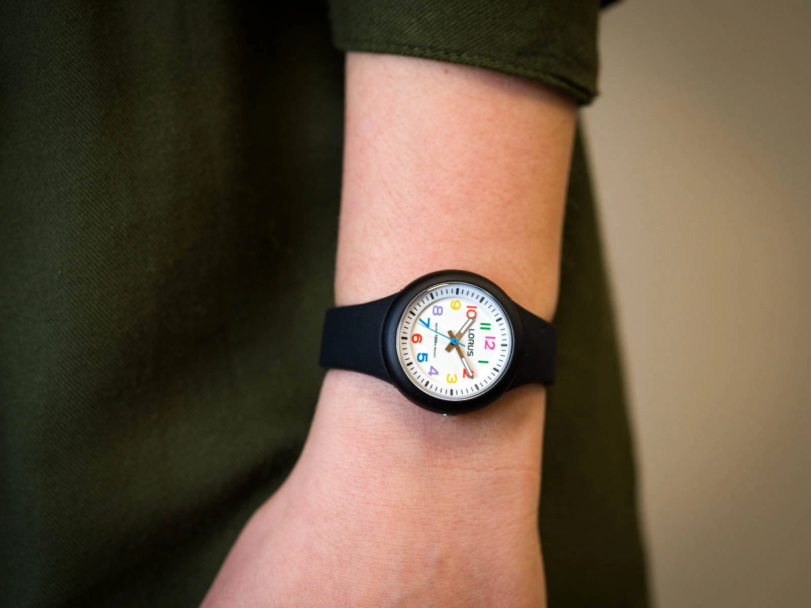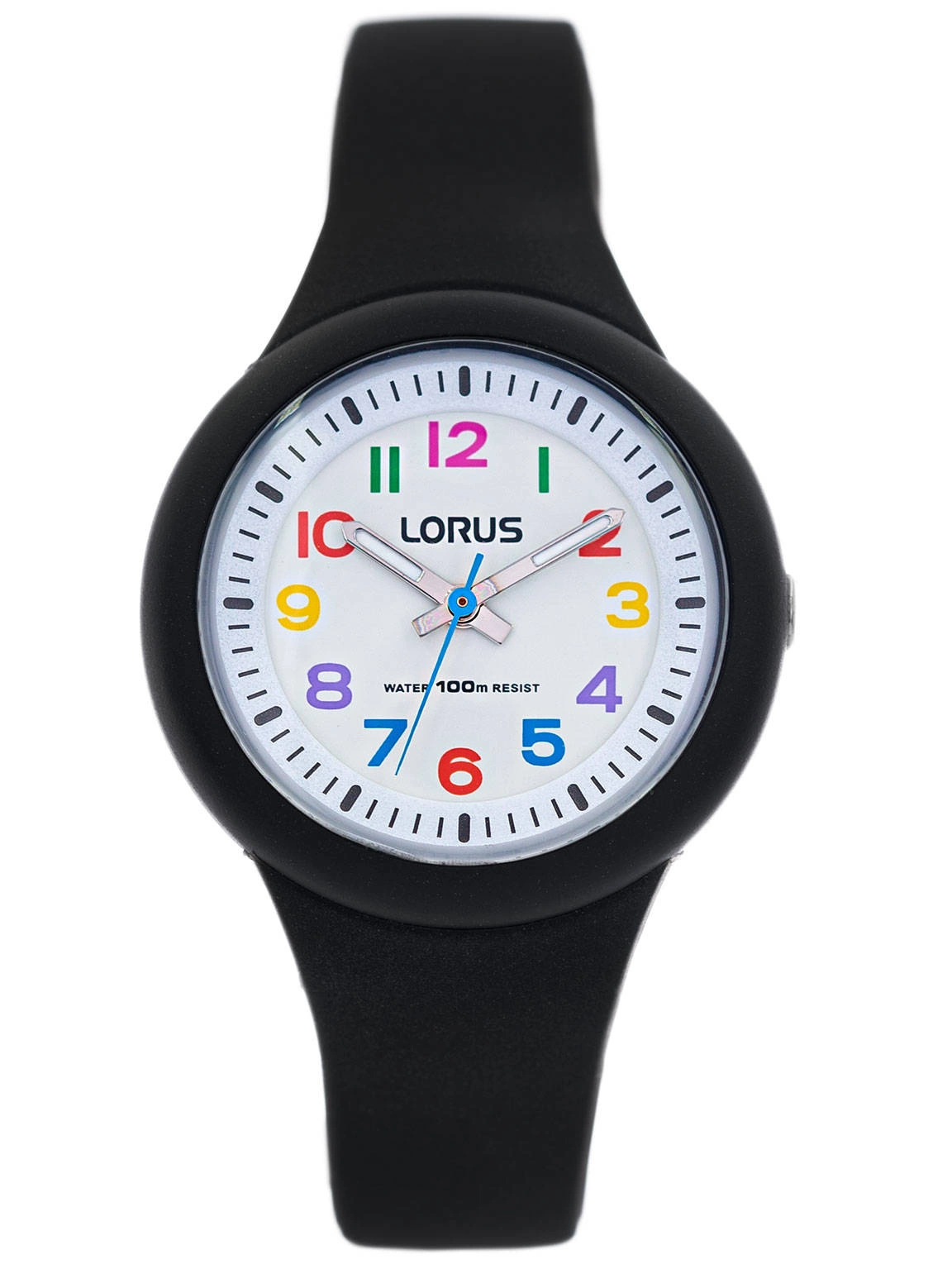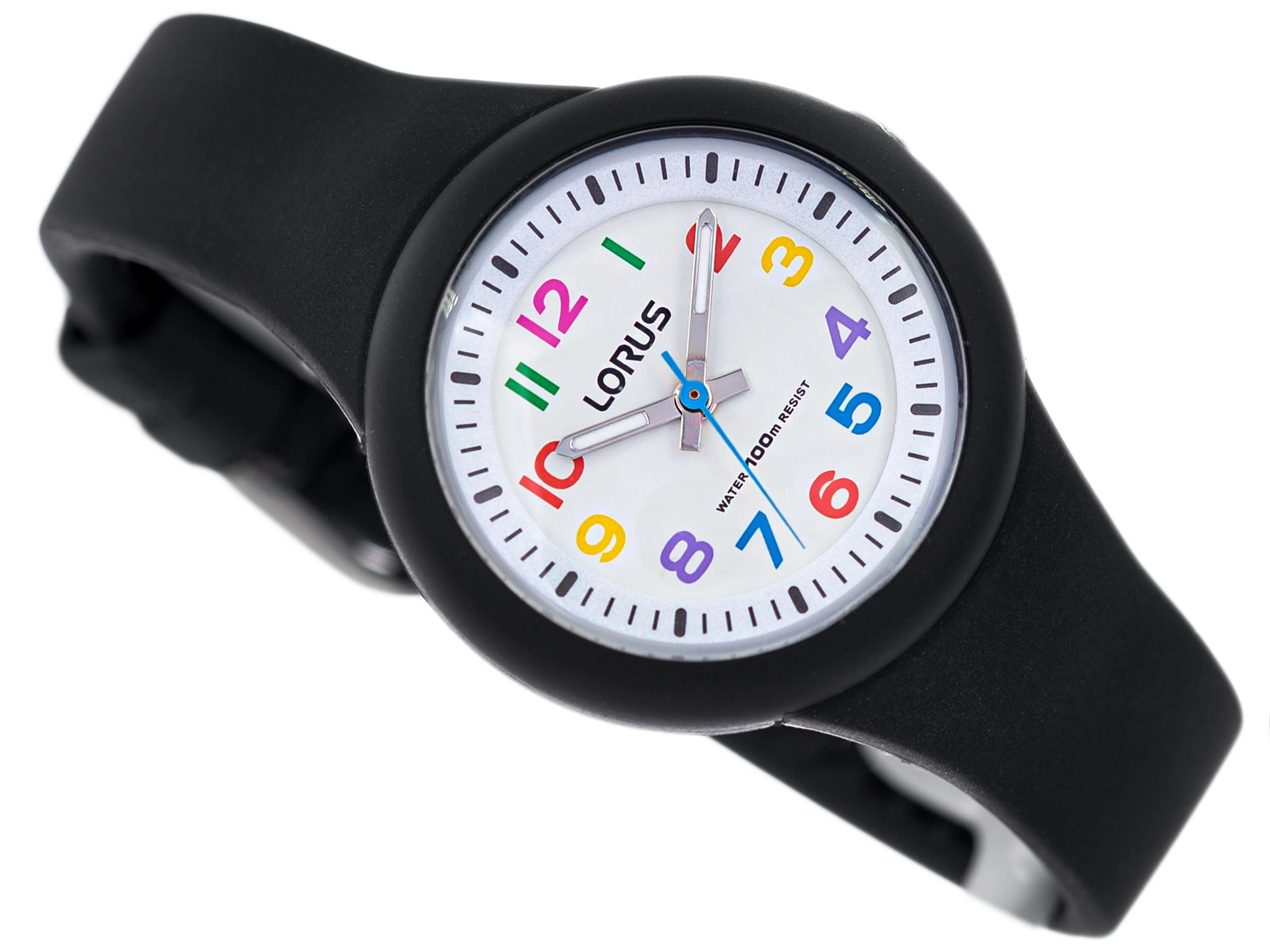 Lorus RRX41EX9 to udana propozycja zegarka dla dzieci. Koperta i pasek zostały wykonane z wygodnego i lekkiego tworzywa sztucznego w kolorze czarnym. Na białej tarczy umieszczone są wyraźne, kolorowe cyfry, które pomagają odczytanie godziny, ważne kiedy poznaje się zegarek. Wskazówki pokryte są neobrite, wiec po naświetleniu świecą w ciemności przez jakiś czas. Lorus RRX41EX9 jest wodoszczelny, można w nim pływać. Model ten posiada solidny mechanizm kwarcowy, napędzany wymienną baterią. Do zegarków Lorus dołączone jest stylowe i oryginalne pudełko, które pochodzi od producenta.