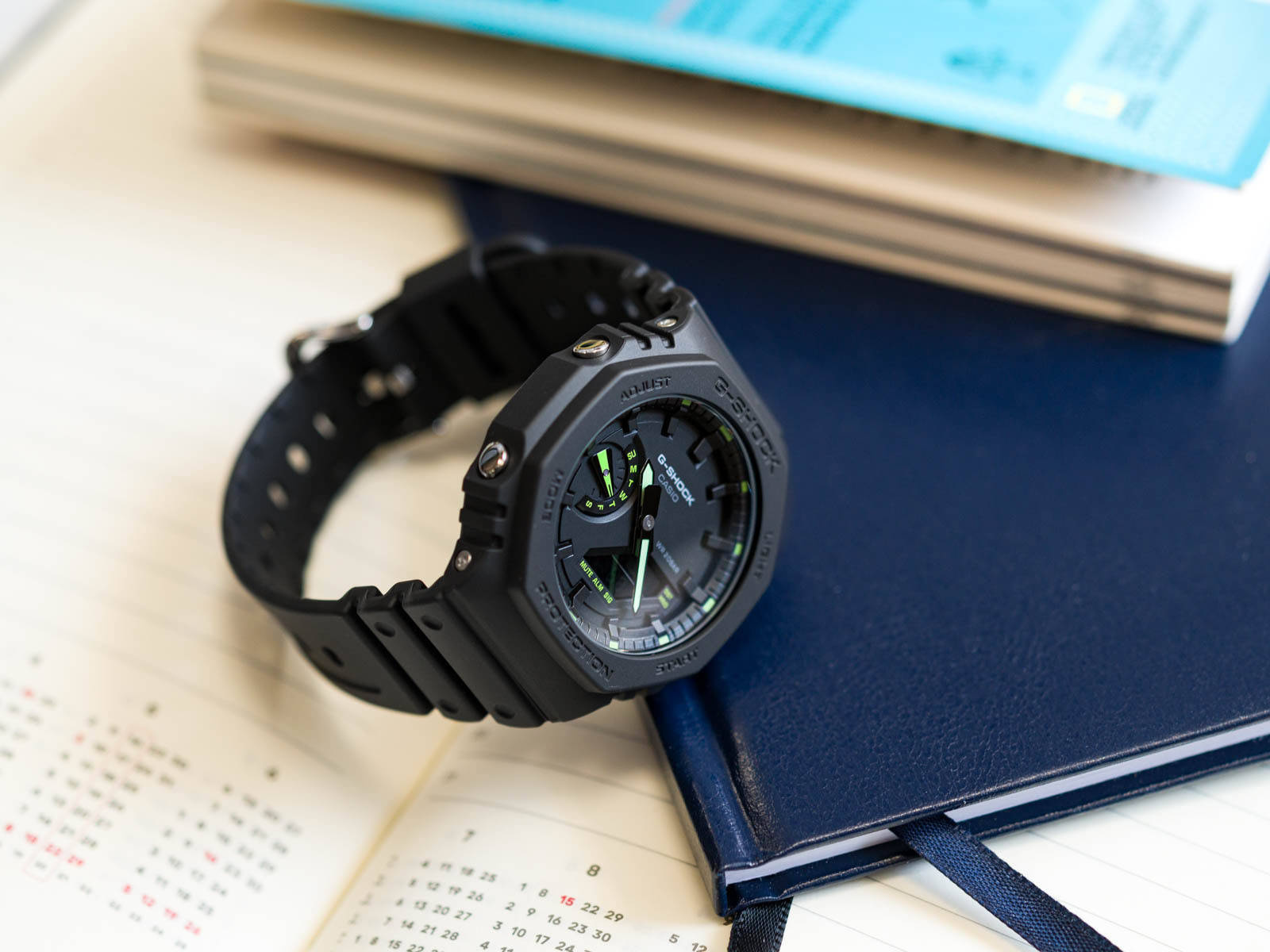 CASIO G-SHOCK GA-2100-1A3ER Neon Accent Series wyróżnia się neonowymi, zielonymi dodatkami na tle matowej czerni, przez to bardzo efektownie prezentuje się na męskim nadgarstku. Dobrze znana ośmiokątna, smukła koperta mieści w sobie wiele przydatnych funkcji, m.in. dla osób często podróżujących świetnie sprawdzi się czas światowy. Cyfrowy stoper, czy timer odmierzający zaprogramowany czas do zera, przydadzą się na treningu. Czasomierz jest wodoszczelny - 200M, więc niestraszne mu sporty wodne. Podświetlenie tarczy pozwoli odczytać w ciemności wartości na wyświetlaczu cyfrowym.