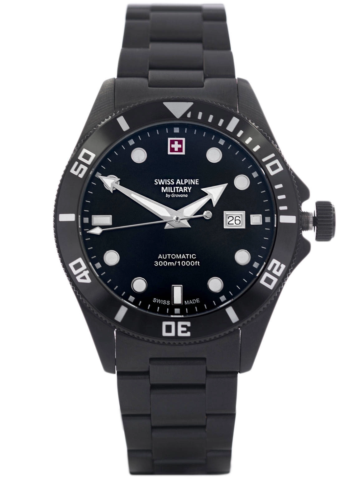 - Wodoszczelny Zegarek Męski Swiss Alpine Military 7095.2177SAM czarny na bransolecie, posiada funkcję datownika.