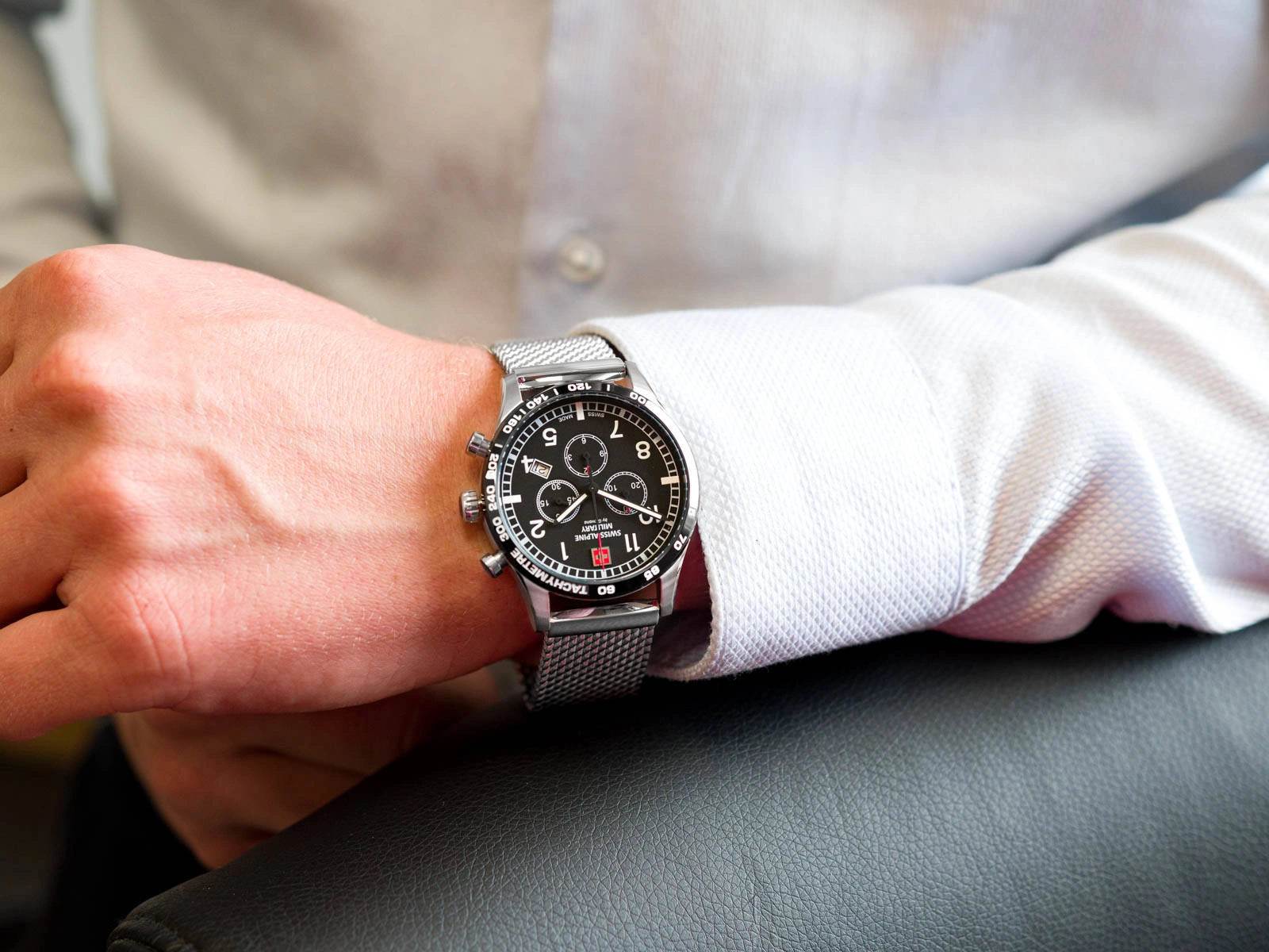 • Wodoszczelny Zegarek Męski Swiss Alpine Military SAM1746.9137 srebrny na bransolecie, posiada funkcje takie jak stoper i datownik.