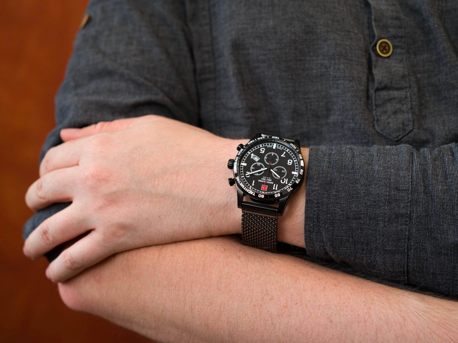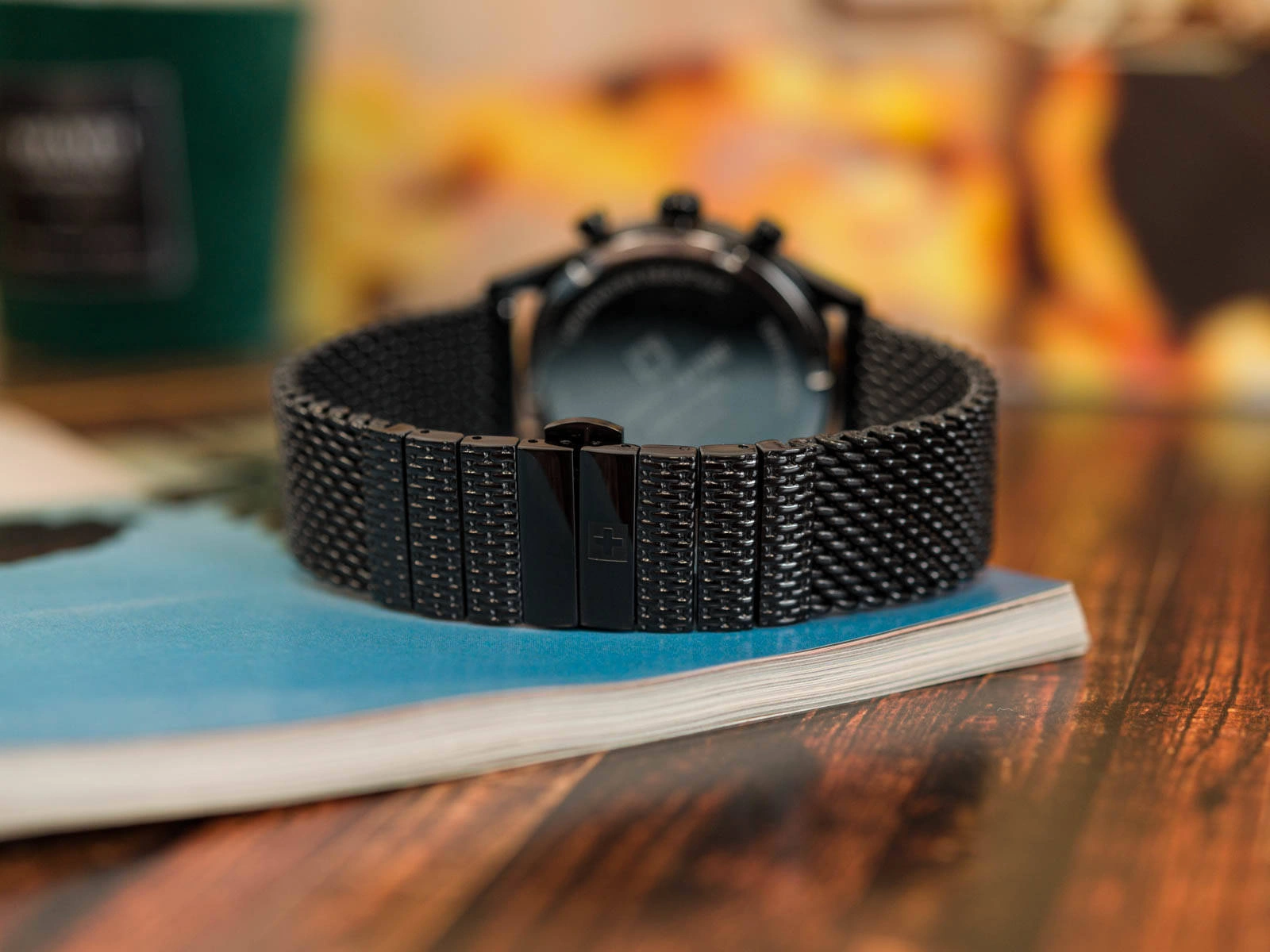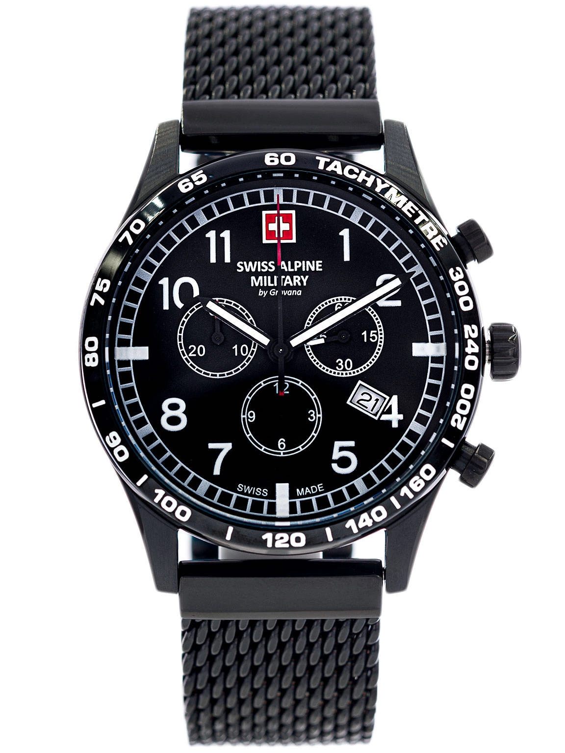 Męski zegarek Swiss Alpine Military SAM1746.9177 w całości został wykonany ze stali szlachetnej. Wewnątrz znajduje się szwajcarski mechanizm kwarcowy Ronda 5030.D, który znany jest z dokładności. Średniej wielkości koperta została połączona z bransoletą typu mesh i zakończona została zapięciem motylkowym. Taki rodzaj zapięcia jest komfortowy w użytkowaniu. Na czarnej, matowej tarczy umieszczono rozbudowany stoper analogowy odmierzający czas w sekundach, minutach i godzinach. Warto podkreślić, że pomiar czasu jest możliwy aż do 12 godzin. Przydatny datownik wskazuje dzień miesiąca. Model ten ma wysoką wodoszczelność wynoszącą 10ATM, dzięki czemu można bezpiecznie uprawiać sporty wodne. Należy pamiętać by nie korzystać w tym czasie z przycisków. Swiss Alpine Military 1746.9177 jest w całości w kolorze czarnym, przez co można go dopasować do niemal każdej stylizacji. Do tego modelu dołączone jest oryginalne opakowanie producenta, który może pełnić rolę pudełka na prezent.