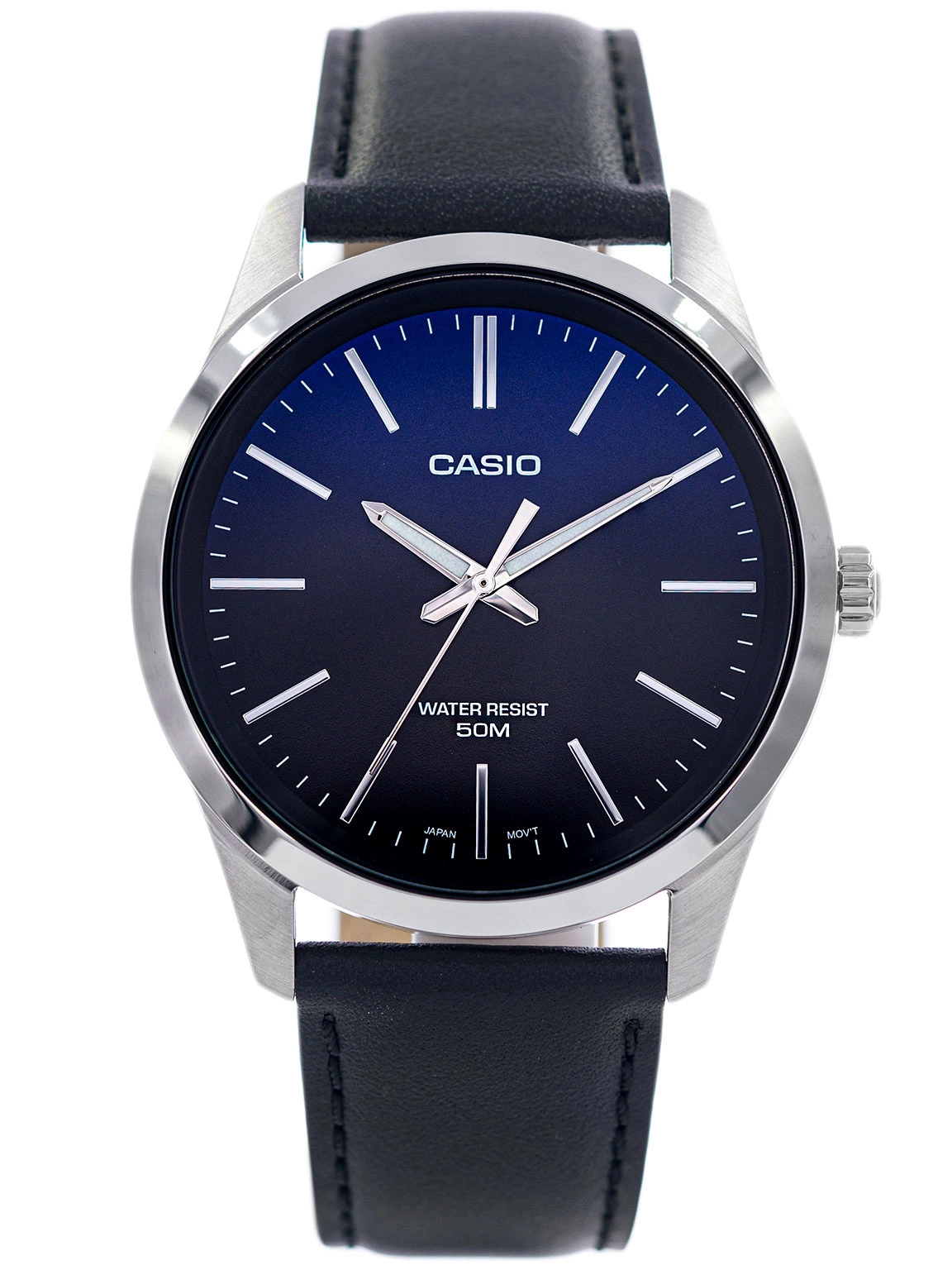 Casio MTP-E180L-2AVEF jest propozycja dla mężczyzn szukających klasycznego czasomierza. Na czarnym pasku zawieszona została elegancka koperta wykonana ze stali szlachetnej odpornej na korozje. Wyjątkowej atrakcyjności dodaje temu zegarkowi oryginalny cieniowany cyferblat. Na granatowo-czarnej tarczy umieszczone zostały wyraźne indeksy w kolorze srebra. Wskazówki zostały pokryte powłoką neobrite, która po naświetleniu świeci przez jakiś czas. Sercem modelu MTP-E180L-2VEF jest japoński mechanizm kwarcowy - zasilany baterią. Lekkość i wywarzone proporcje sprawiają, że model ten będzie fantastycznym dodatkiem męskiej stylizacji