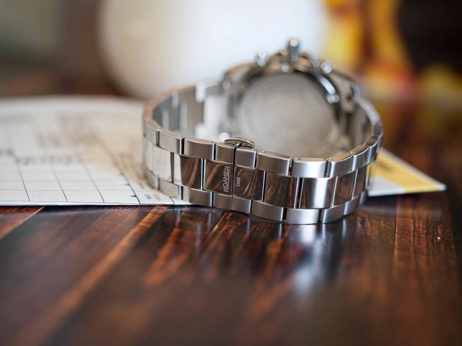 - Wodoszczelny Zegarek Męski Roamer 862837 41 45 20 srebrny na bransolecie, posiada funkcje stopera i datownika.