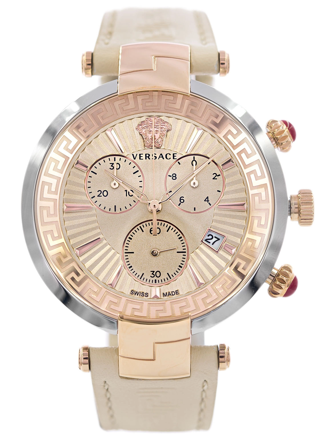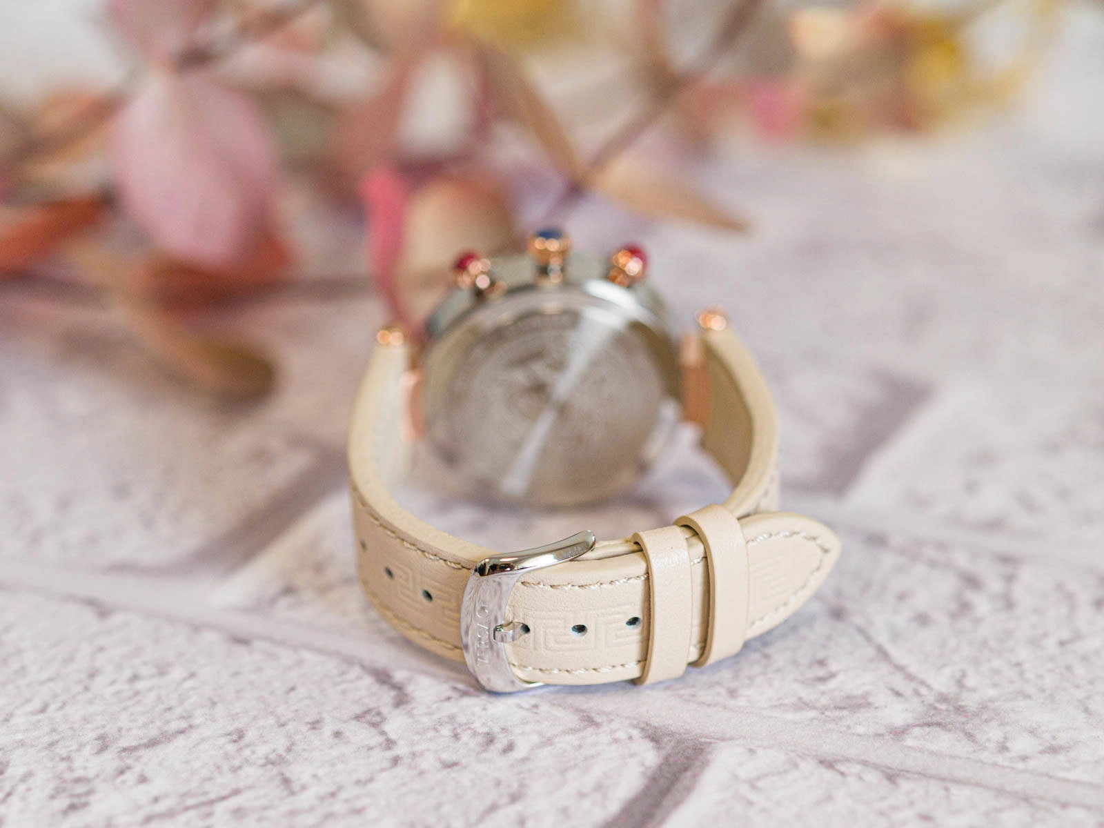 - Zegarek Damski Versace VE2M00321 beżowy na pasku, posiada datownik i funkcje stopera.