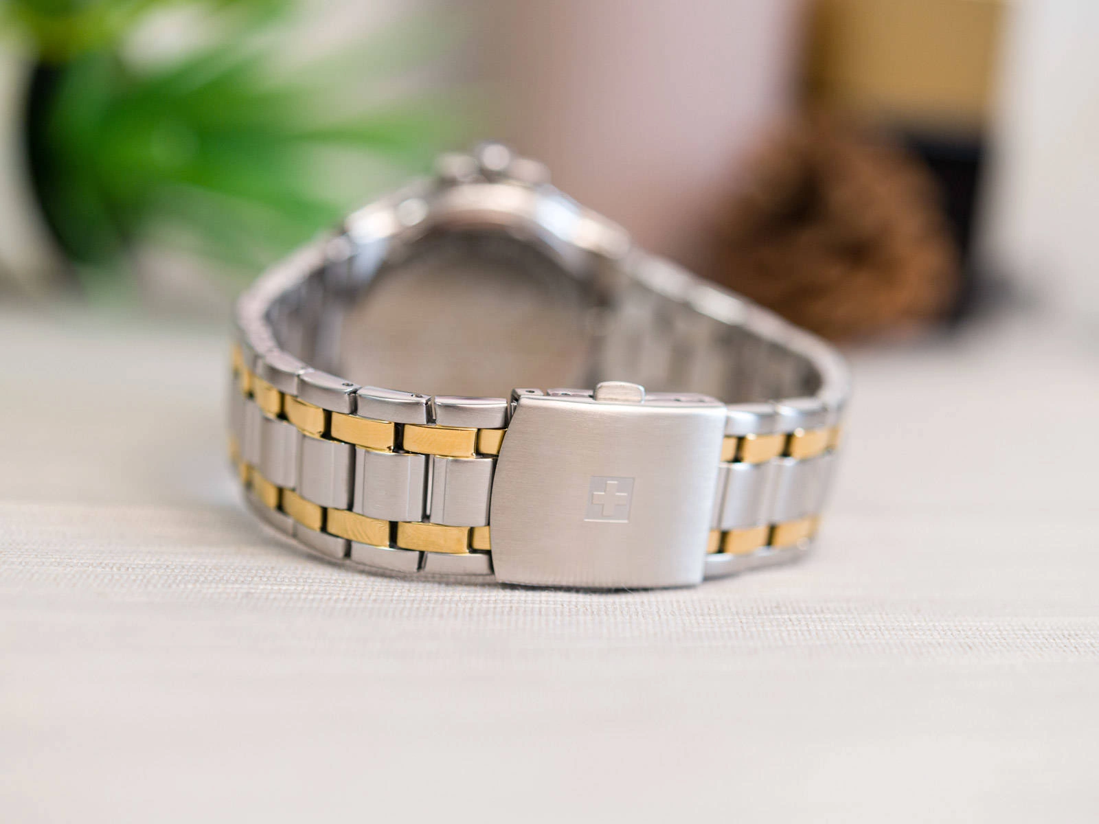 - Wodoszczelny Zegarek Męski Swiss Alpine Military SAM7043.1145 srebrno-złoty na bransolecie, posiada datownik.