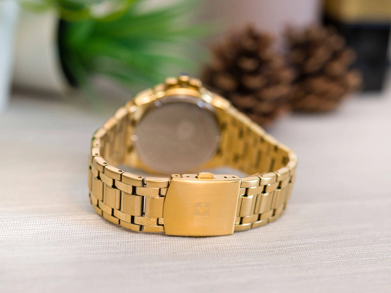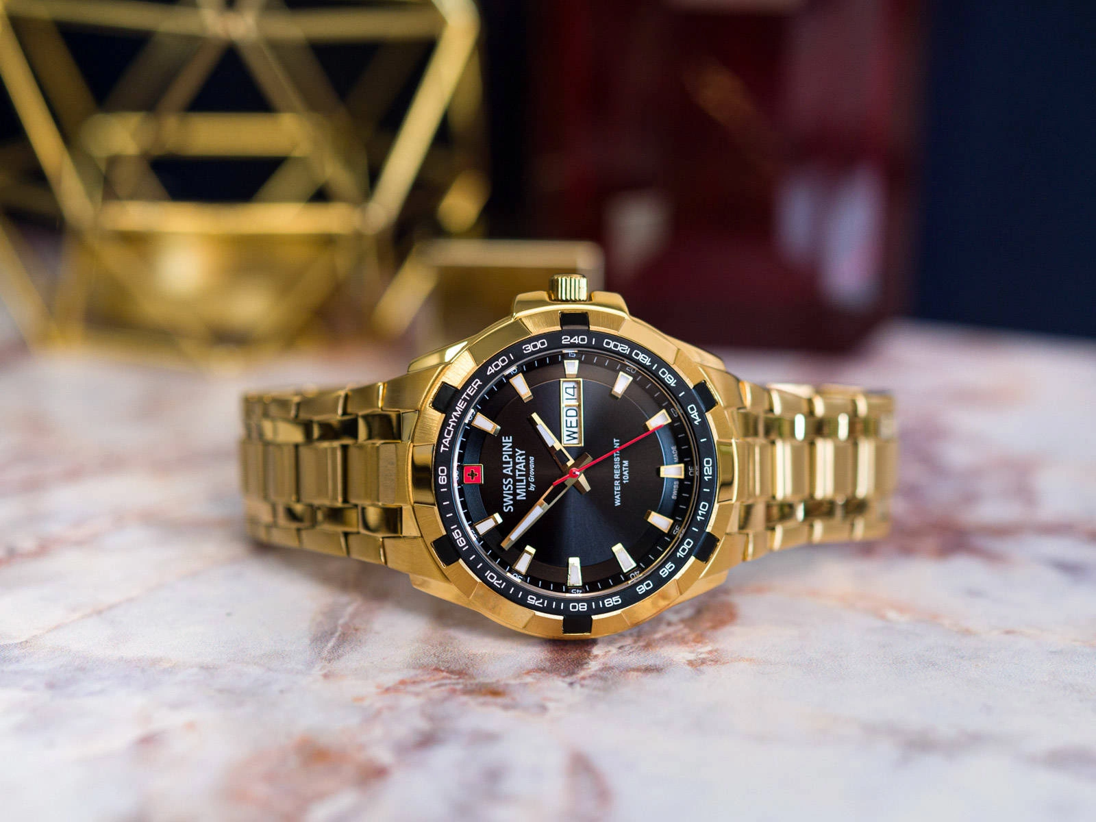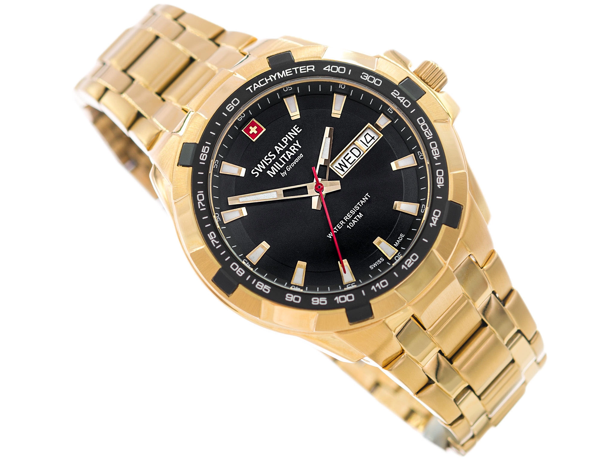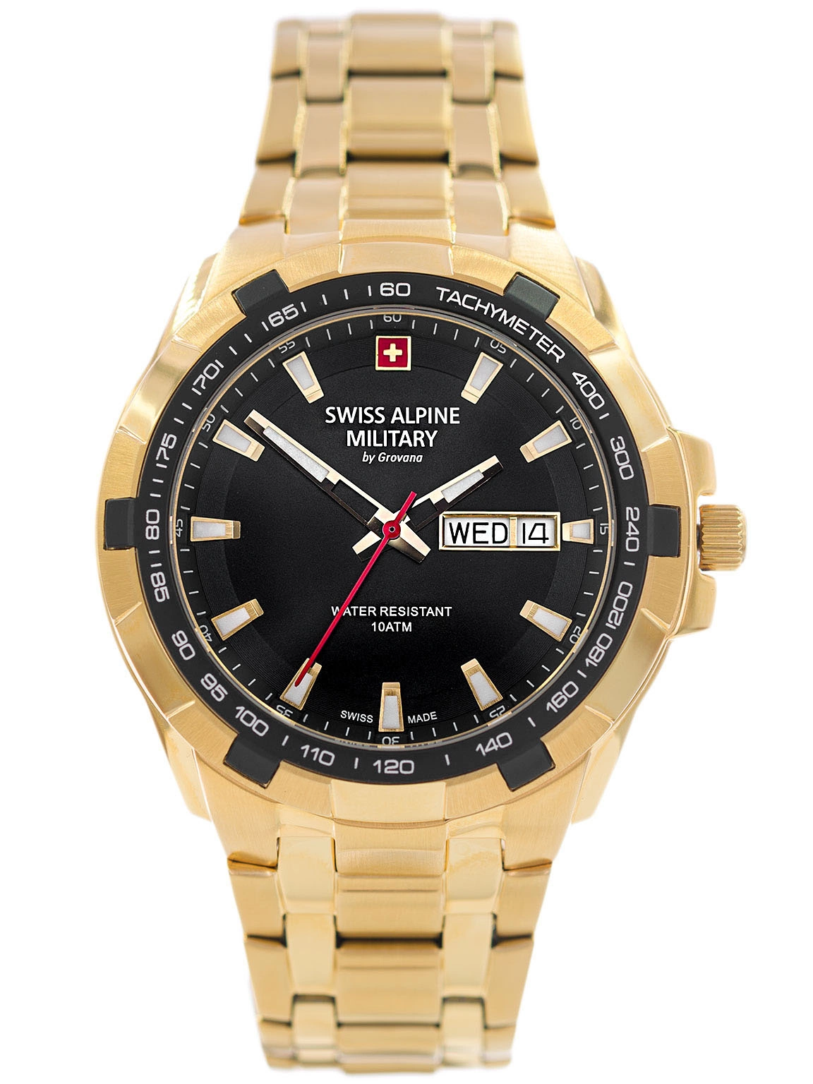 - Wodoszczelny Zegarek Męski Swiss Alpine Military SAM7043.1117 złoty na bransolecie, posiada datownik.