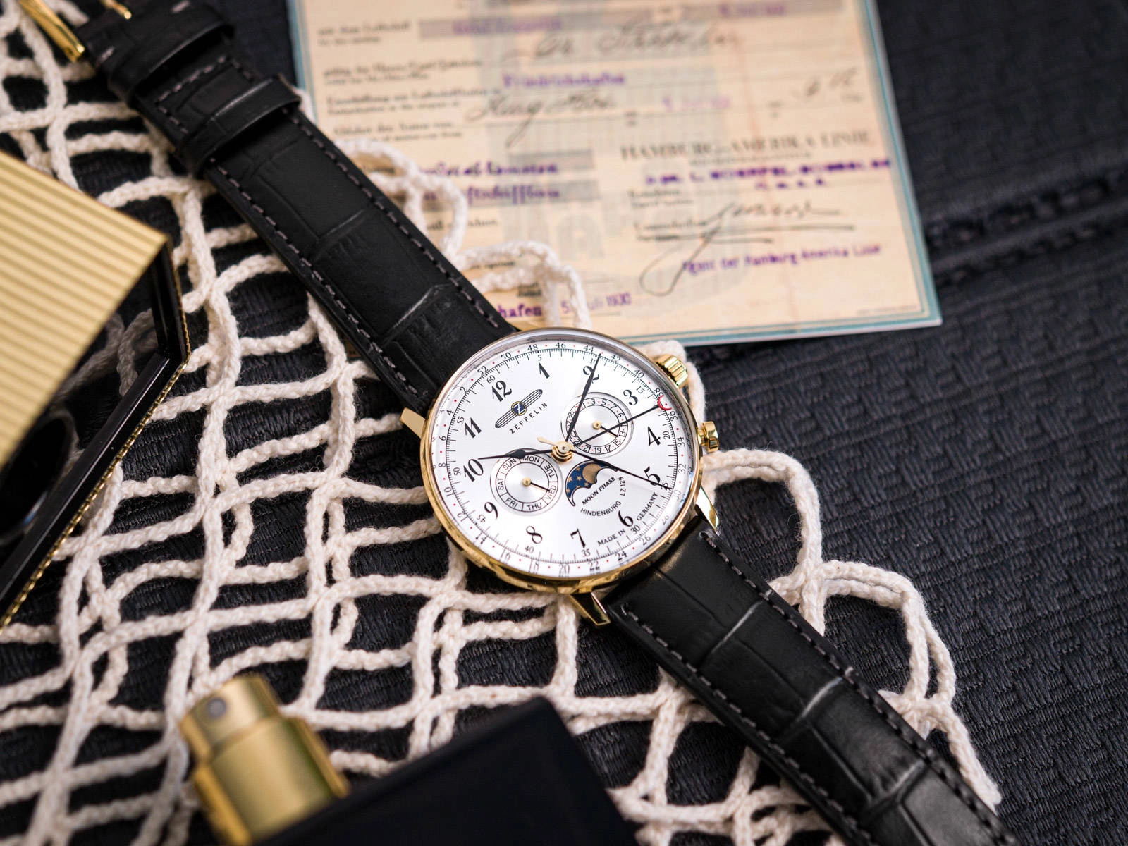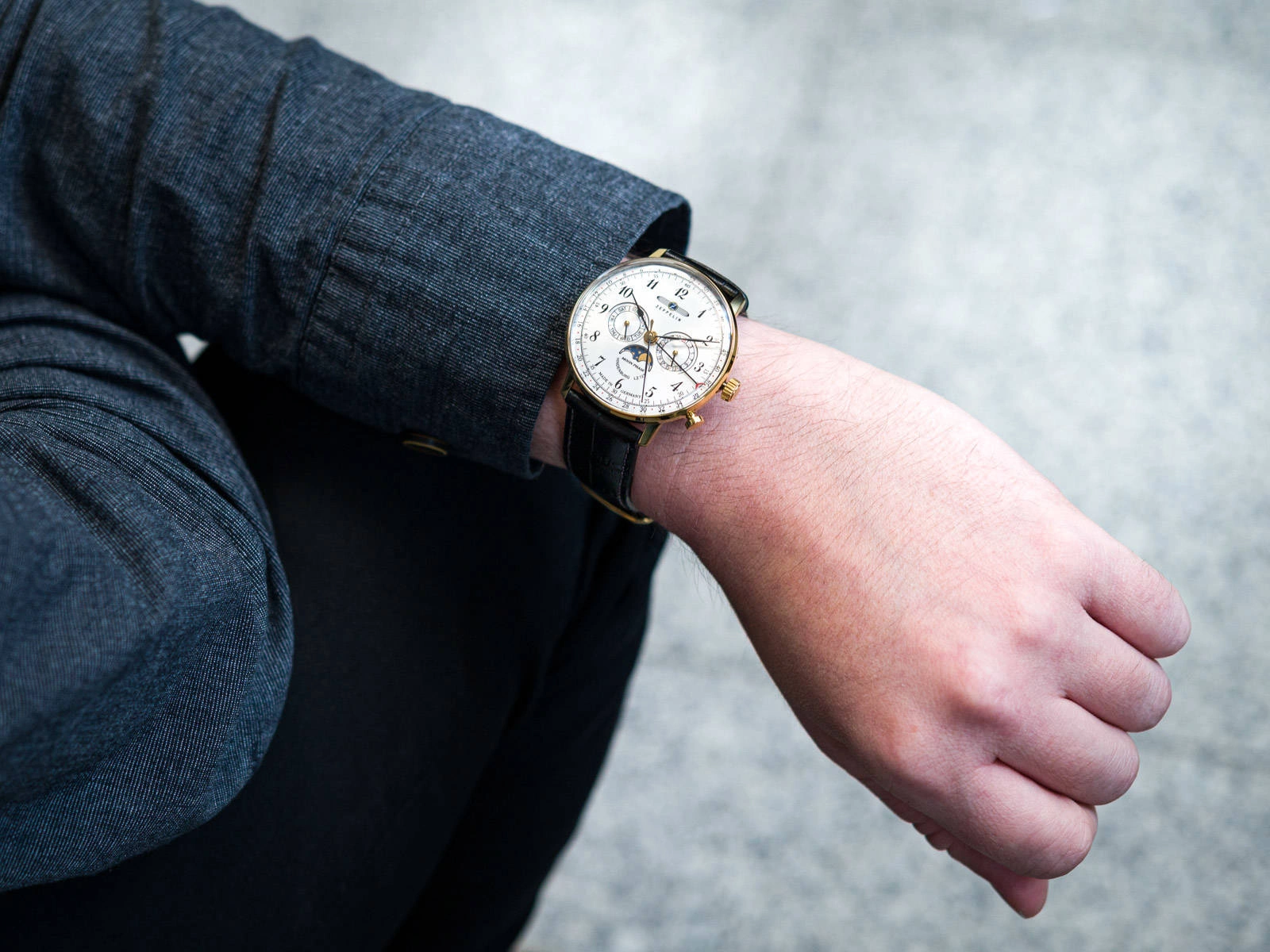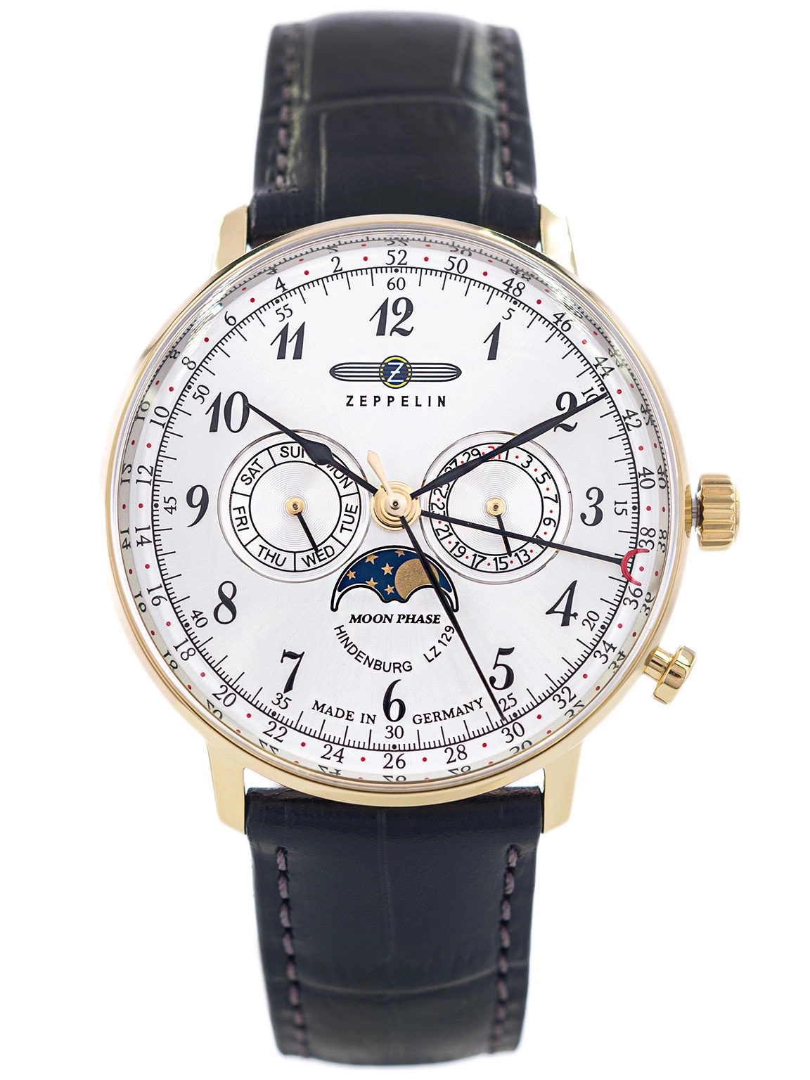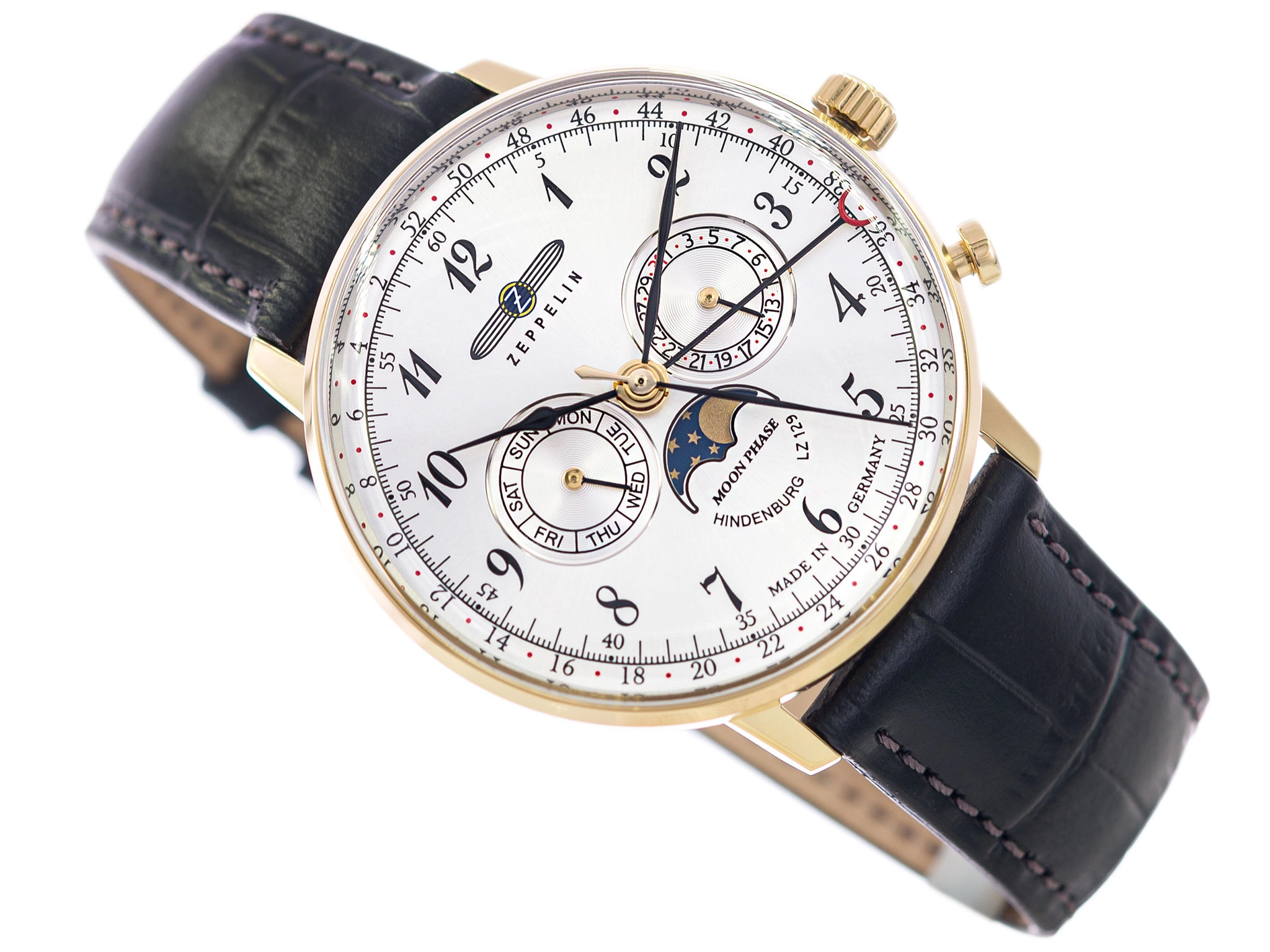 ZEPPELIN 7038-1 HINDENBURG LZ-129 działa w oparciu o szwajcarski mechanizm kwarcowy RONDA 706B słynący z precyzji wykonania i niezawodności. Wyposażony jest w rozbudowany datownik, który wskazuje aktualny dzień tygodnia i dzień miesiąca. Dodatkowa wskazówka pokazuje numer tygodnia w roku. Przy godzinie 6 umieszczony jest wskaźnik faz księżyca. Błyszcząca koperta w kolorze złota wykonana jest ze stali szlachetnej odpornej na korozję. Połączona jest z wygodnym, wysokiej jakości paskiem ze skóry cielęcej w kolorze brązowym. Lśniący cyferblat chroniony jest przez wypukłe szkiełko hesalitowe słynące z wysokiej odporności na wpływ chemikaliów. Model ten efektownie prezentuje się na męskim nadgarstku i z powodzeniem może zostać elementem każdej męskiej stylizacji.