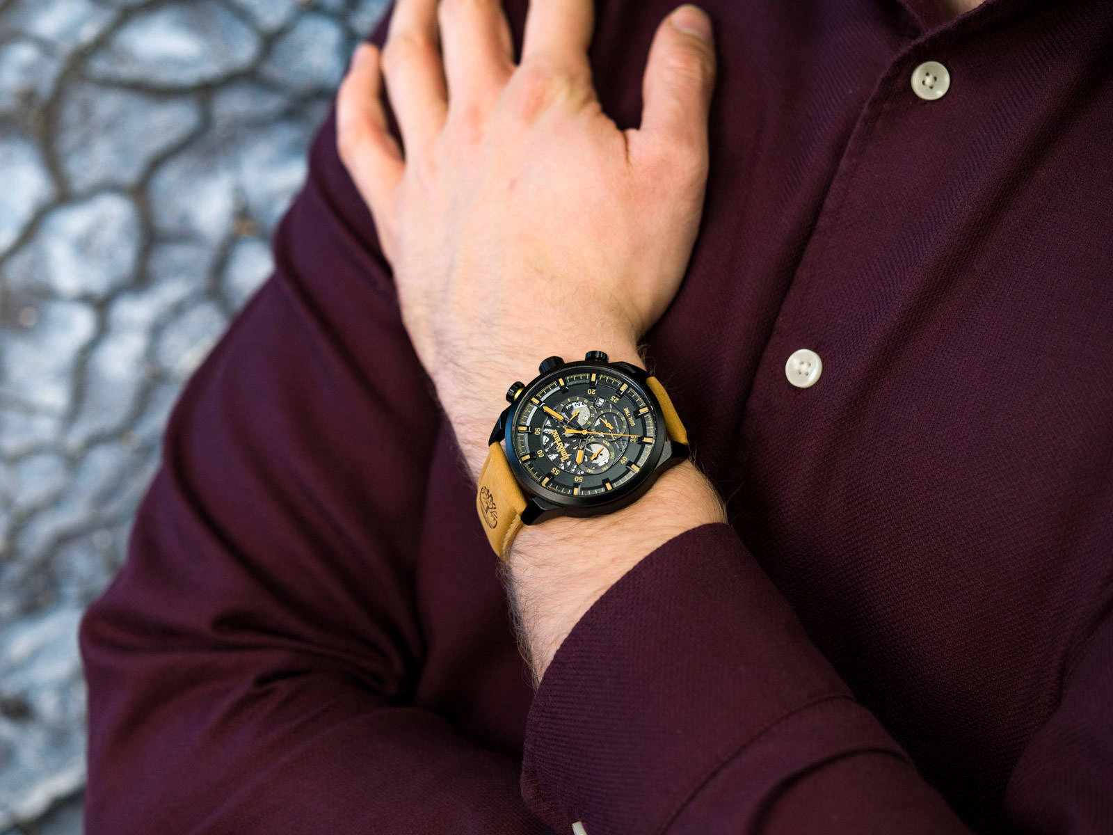 TDWGF2100602 Henniker III to propozycja amerykańskiej marki Timberland zaprojektowana dla mężczyzn preferujących zegarki analogowe o nietuzinkowym designie. Bez wątpienia wzrok przykuwa częściowo odkryta tarcza, gdzie obserwować możemy prace datownika. Czarna, koperta zawieszona jest na brązowym, skórzanym pasku, który doskonale dopasowuje się do nadgarstka i jest miły w dotyku. Przydatną funkcja jest rozbudowany datownik wskazujący za pomocą małej tarczy, dzień tygodnia. Pomiędzy godziną 4, a 5 ruchome okienko prezentuje aktualny dzień miesiąca. Dodatkowo czasomierz posiada możliwość ustawienia drugiego czasu na subtarczy przy godzinie 6. Model ten znakomicie prezentuje się na męskim nadgarstku. Ze względu na charakterystyczne zestawienie kolorów oraz interesujący design, bez cienia wątpliwości ożywi każdą stylizacje. Gustowne pudełko dołączone do tego modelu sprawia, że zegarek może stać się idealnym pomysłem na prezent.