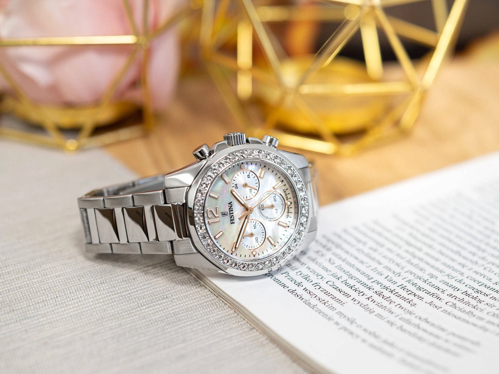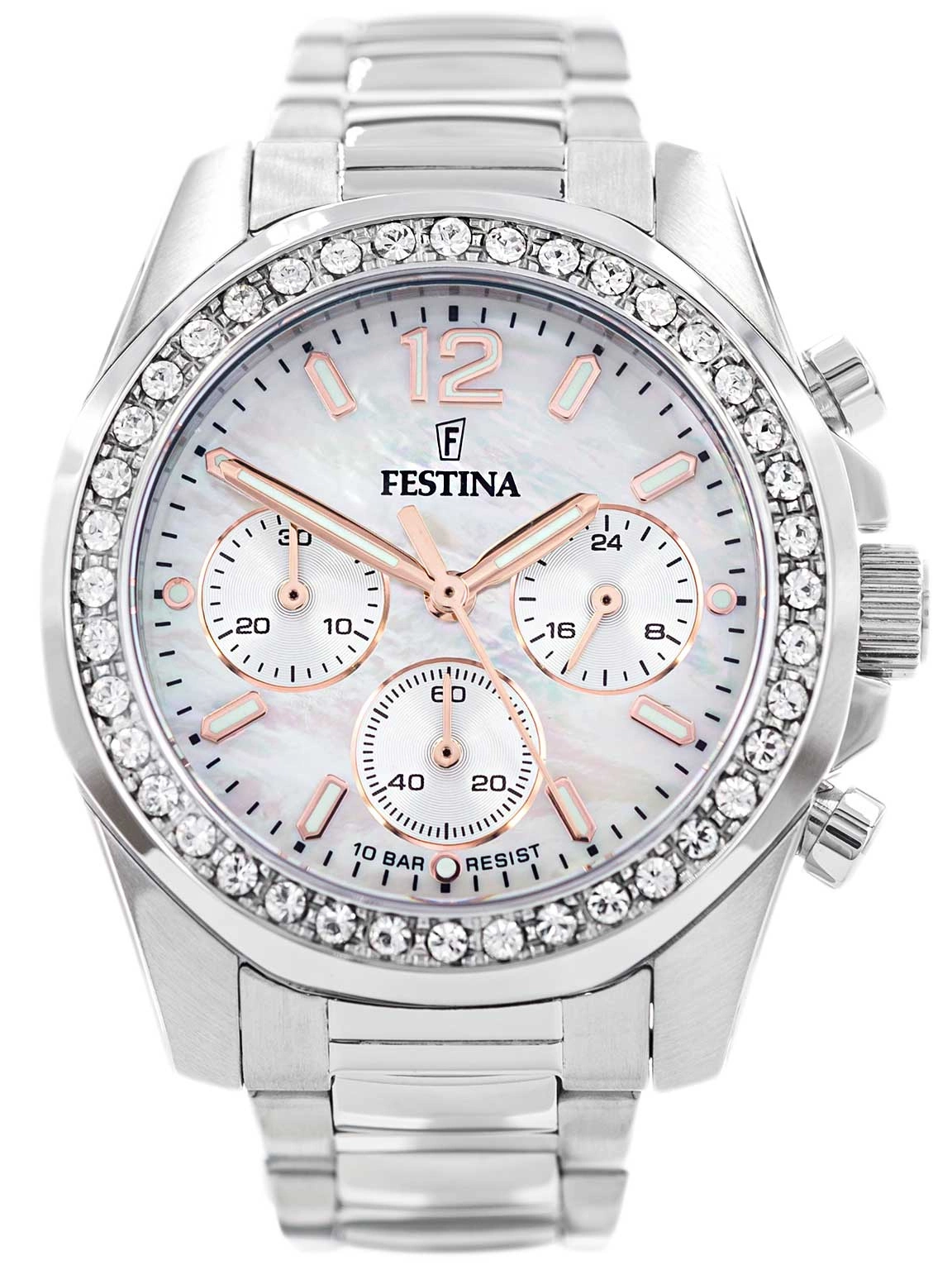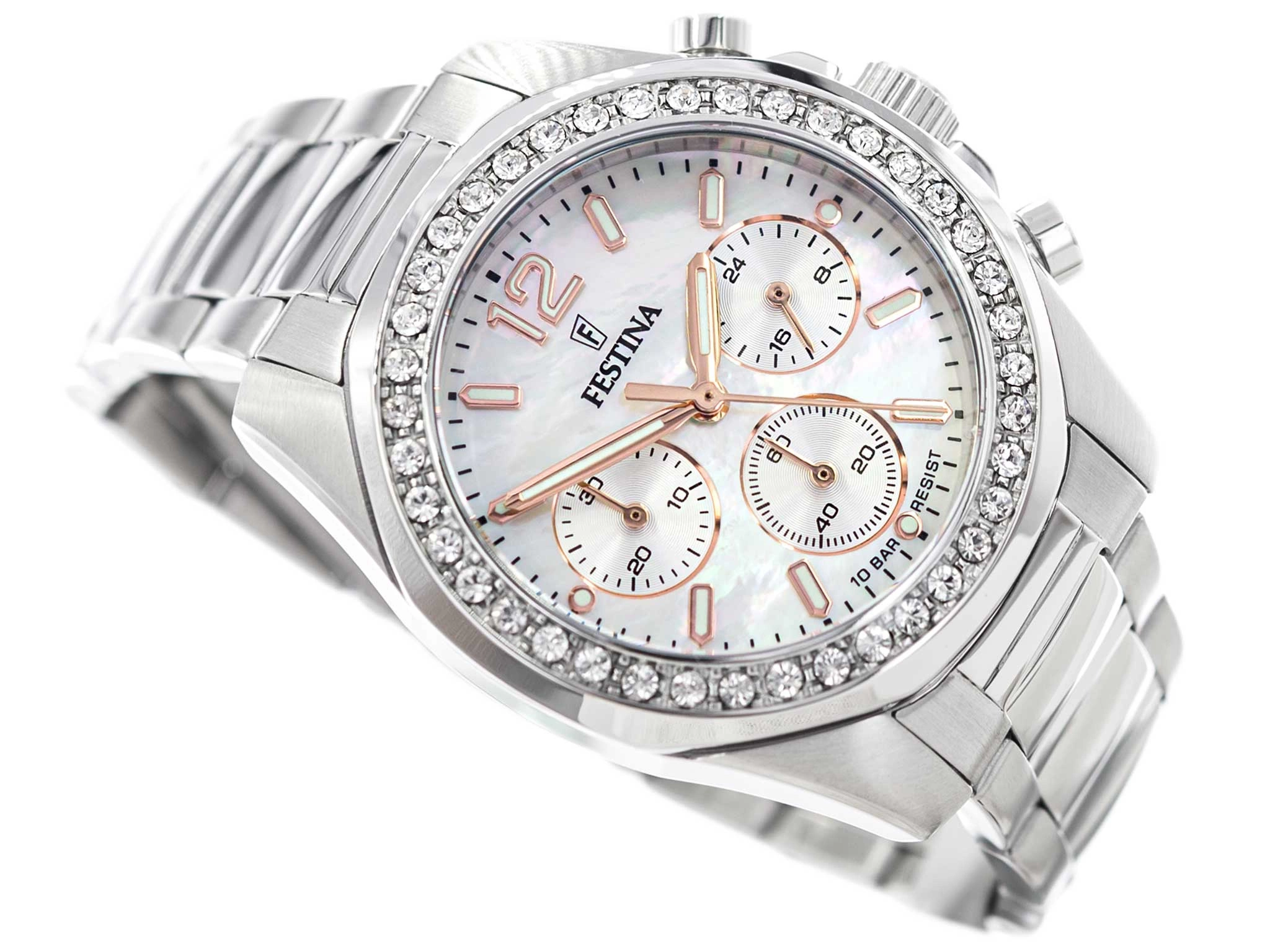 - Wodoszczelny Zegarek Damski Festina F20606/1 srebrny na bransolecie, posiada funkcje takie jak stoper.