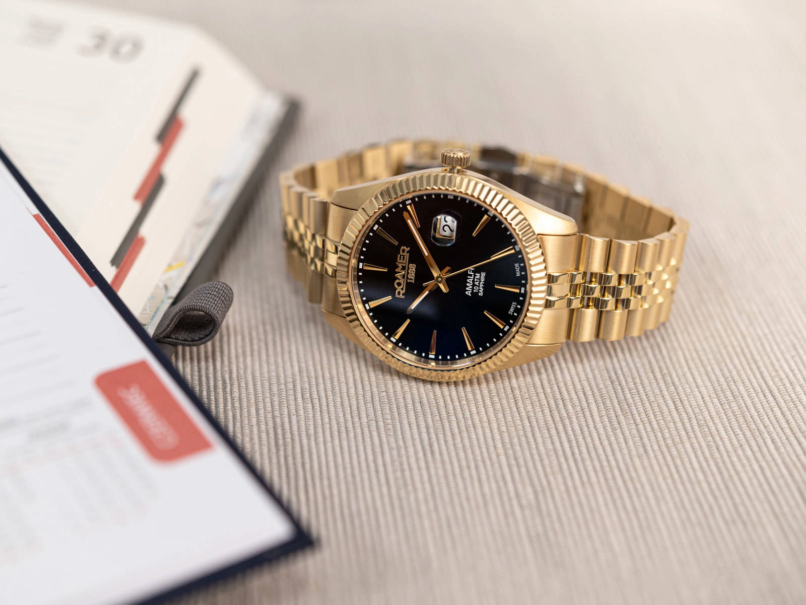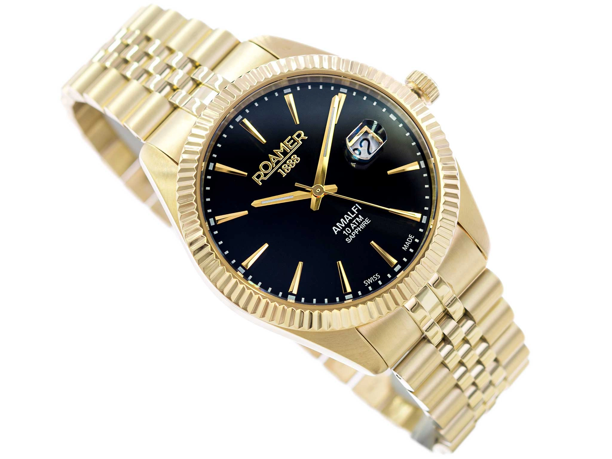 • Wodoszczelny Zegarek Męski Roamer 852833 48 55 20 złoty na bransolecie, posiada funkcję datownika.