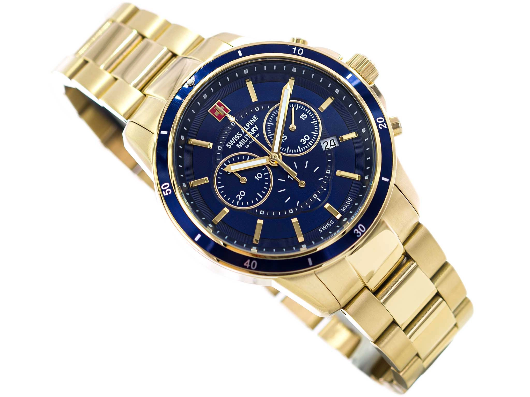 - Wodoszczelny Zegarek Męski Swiss Alpine Military SAM7089.9115 złoty na bransolecie, posiada funkcje takie jak stoper i datownik.