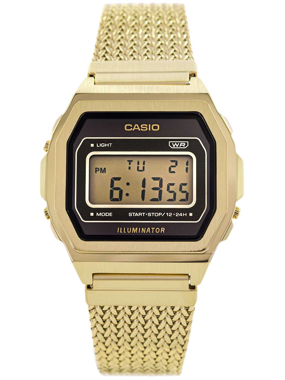 - Zegarek Damski Casio A1000MGA 5 złoty na bransolecie, posiada funkcje takie jak stoper i datownik.