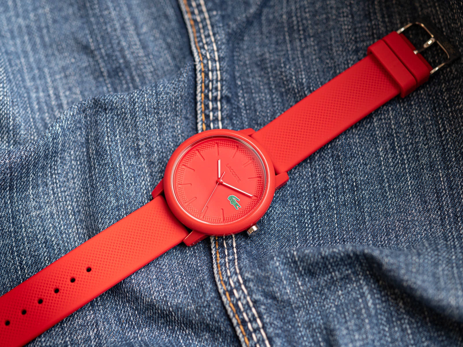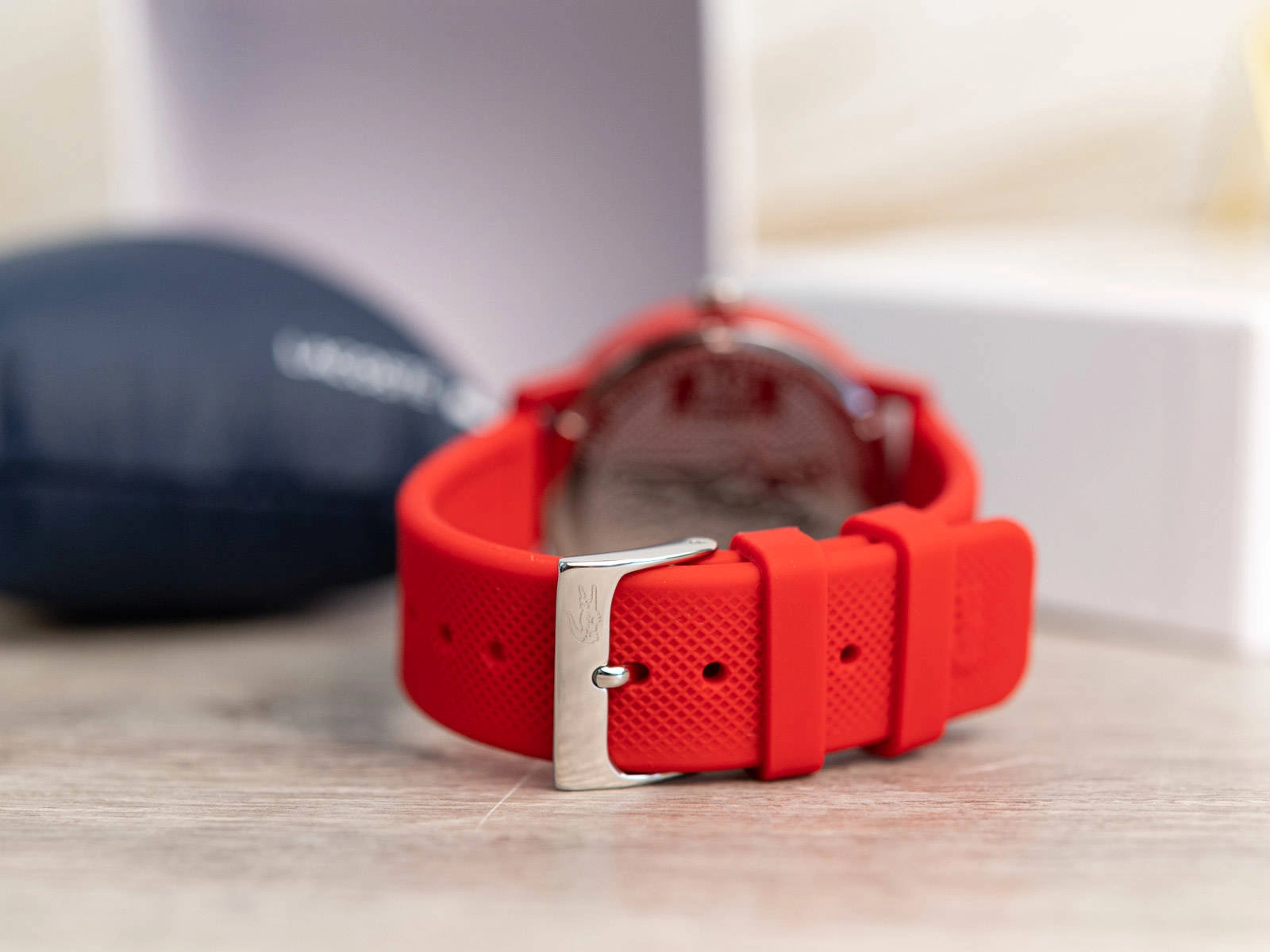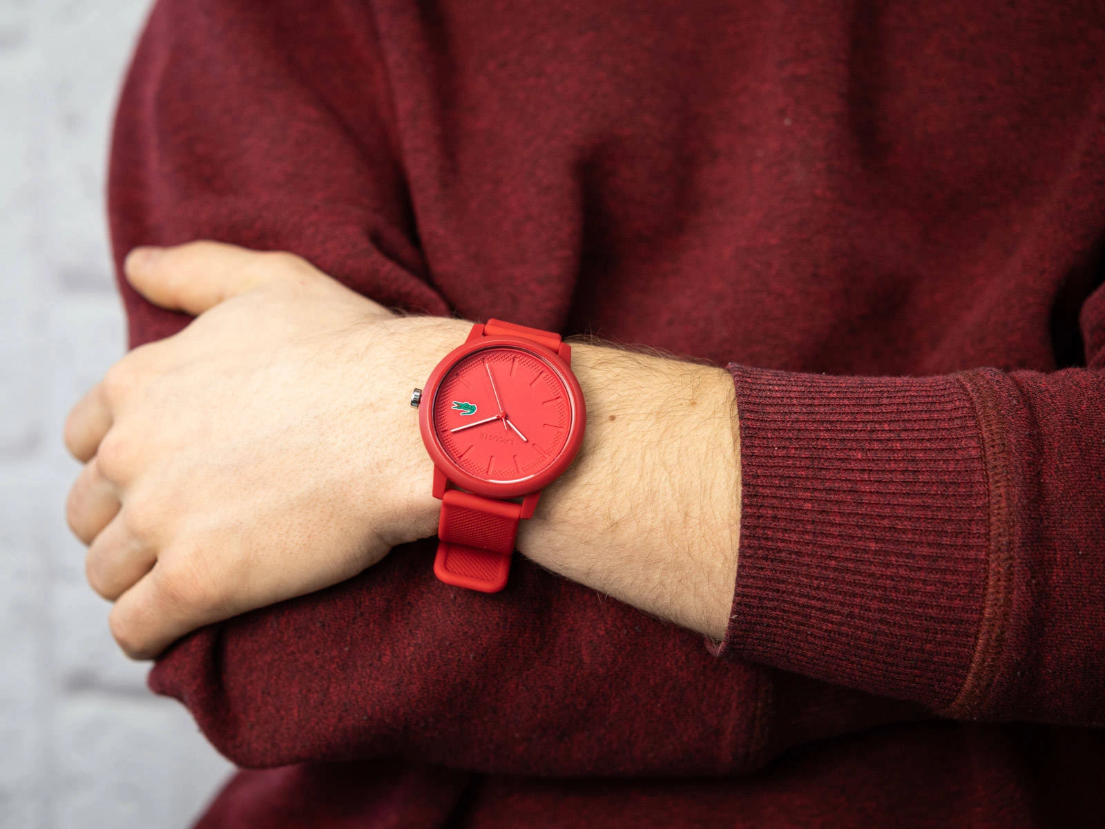 Lacoste 2011173 to produkt zaprojektowany dla mężczyzn, którzy lubią bawić się modą. Na elastycznym pasku z tworzywa sztucznego zawieszono połyskującą kopertę. Zegarek w całości pokryty jest odważnym, czerwonym kolorem. Wobec czego, nie mamy wątpliwości, że ożywi męską stylizacje. Minimalistyczną tarcze chroni szkiełko mineralne, odporne na zarysowania. Dodatkowo przy godzinie 3 umieszczono logo producenta w postaci słynnego krokodyla Lacoste. Warto zaznaczyć, że wewnątrz pracuje precyzyjny mechanizm kwarcowy, zasilany wymienną baterią. Model 2011173 to gustowny czasomierz o estetycznym designie, dokonale prezentuje się na męskim nadgarstku. Do zegarka dołączone zostało eleganckie, markowe pudełko, które doskonale sprawdzi się jako opakowanie na prezent.