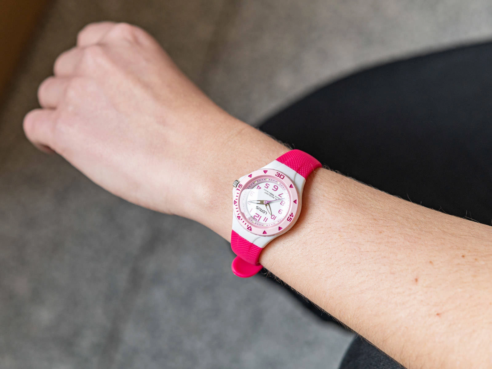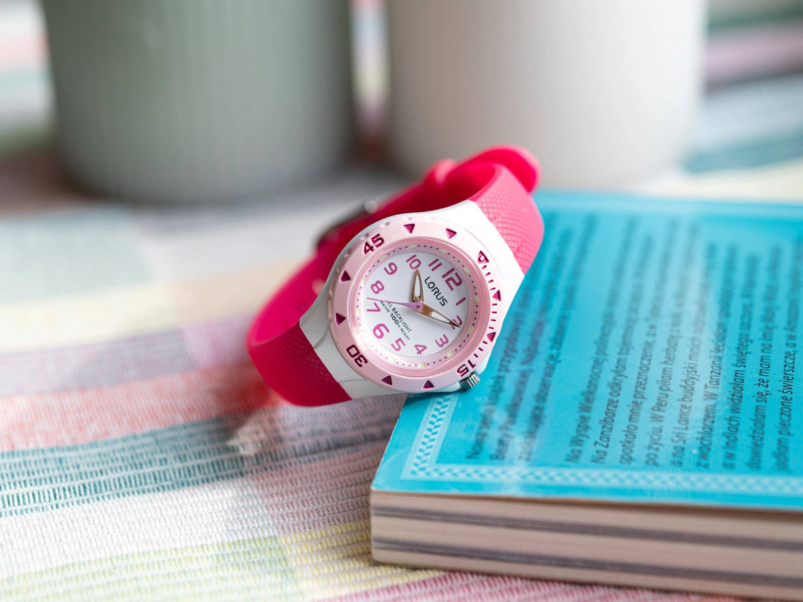 - Wodoszczelny Zegarek dziecięcy Lorus R2339DX9 różowy na pasku.