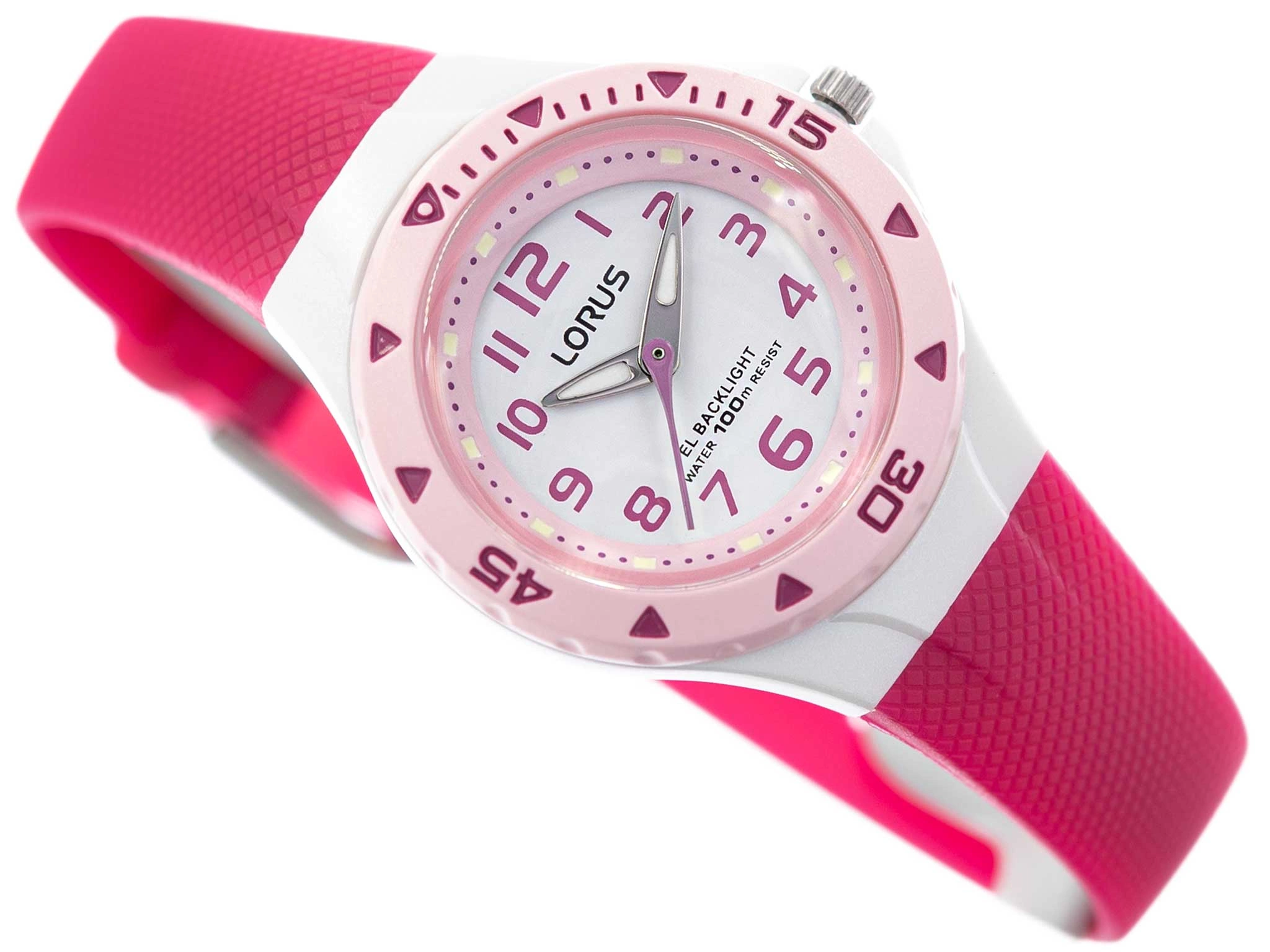 Lorus R2339DX9 to propozycja producenta stworzona z myślą o dziewczynkach. Model działa w oparciu o precyzyjny mechanizm kwarcowy, napędzany wymienną baterią. Tworzywo sztuczne, z którego wykonano zegarek sprawia, że jest on bardzo lekki wygodny w noszeniu. Na białej tarczy umieszczone są wyraźne cyfry, które ułatwią odczyt godziny, w szczególności dzieciom, które rozpoczynają przygodę z czasem. Ze względu na wysoka klasę wodoszczelności 100m, bezproblemowo możemy pływać z zegarkiem. Należy jednak pamiętać, aby po zanurzeniu nie używać przycisku, a koronka była cały czas dociśnięta. Wskazówki pokryte są neobrite, wiec po naświetleniu są widoczne w ciemności przez jakiś czas. Warto wspomnieć, że Lorus R2339DX9 wyposażony został w przycisk z prawej strony na kopercie, który podświetla cyferblat na niebiesko. Do zegarków Lorus dołączone jest stylowe i oryginalne pudełko, które pochodzi od producenta i z powodzeniem może pełnić role opakowania na prezent.
