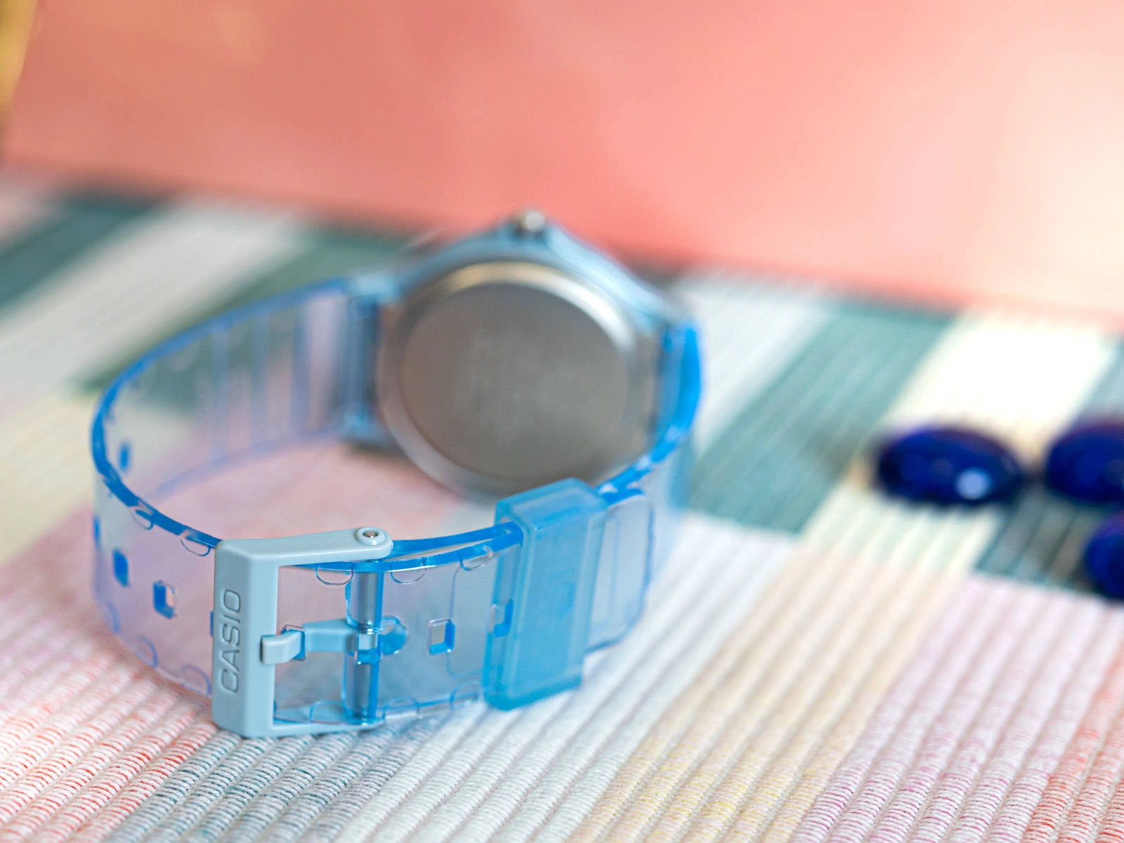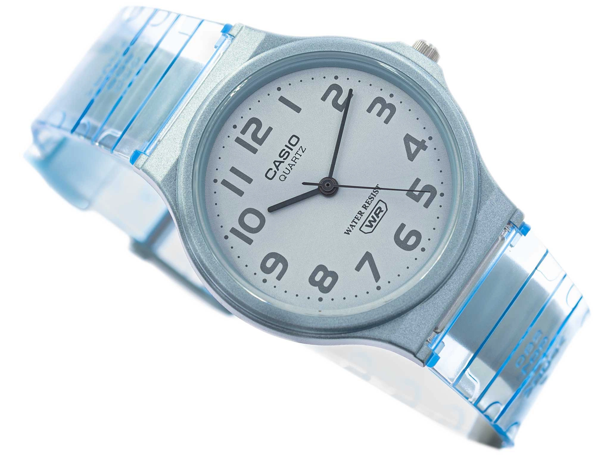 CASIO MQ-24S-2BEF to prosty model na gumowym pasku. Zegarek ten w całości wykonany został z tworzywa sztucznego, w odcieniach niebieskiego. Na jasnej tarczy ulokowano wyraźne cyfry arabskie oznaczające godziny. Czytelne, kontrastowe oznakowanie sprawia, że odczyt godziny nie sprawi najmniejszego problemu. Ten minimalistyczny i lekki model będzie się bardzo dobrze prezentował na damskim nadgarstku. Zegarek Casio MQ-24S-2B pracuje w oparciu o precyzyjny mechanizm kwarcowy, zasilany baterią. Ponadto produkt nie zawiera niklu i nie powinien wywołać reakcji uczulającej.