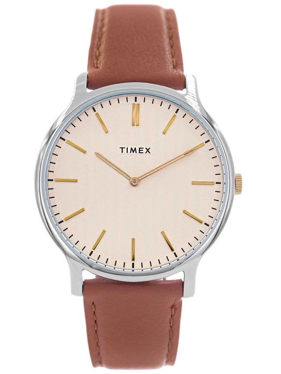 Timex TW2V28200 CITY to propozycja czasomierza dla nowoczesnego mężczyzny. Lśniąca, srebrna koperta idealnie komponuje się ze skórzanym, brązowym paskiem, który jest miły w dotyku. Za sprawą smukłej koperty bezproblemowo zmieści się pod rękawem koszuli i doskonale sprawdzi się w roli zegarka do garnituru. Z całą pewnością zegarek doskonale uzupełni biurową stylizacje, ale może towarzyszyć nam podczas przeróżnych uroczystości. Na tarczy w paski, chronionej mineralnym płaskim szkłem, godziny wyznaczone są za pomocą pionowych, wyraźnych indeksów. Całość prezentuje się schludnie i czytelnie. Poprzez staranność wykonania i dobór wartościowych materiałów model TW2V28200 jest doskonałą propozycją dla mężczyzn szukających klasycznego zegarka.