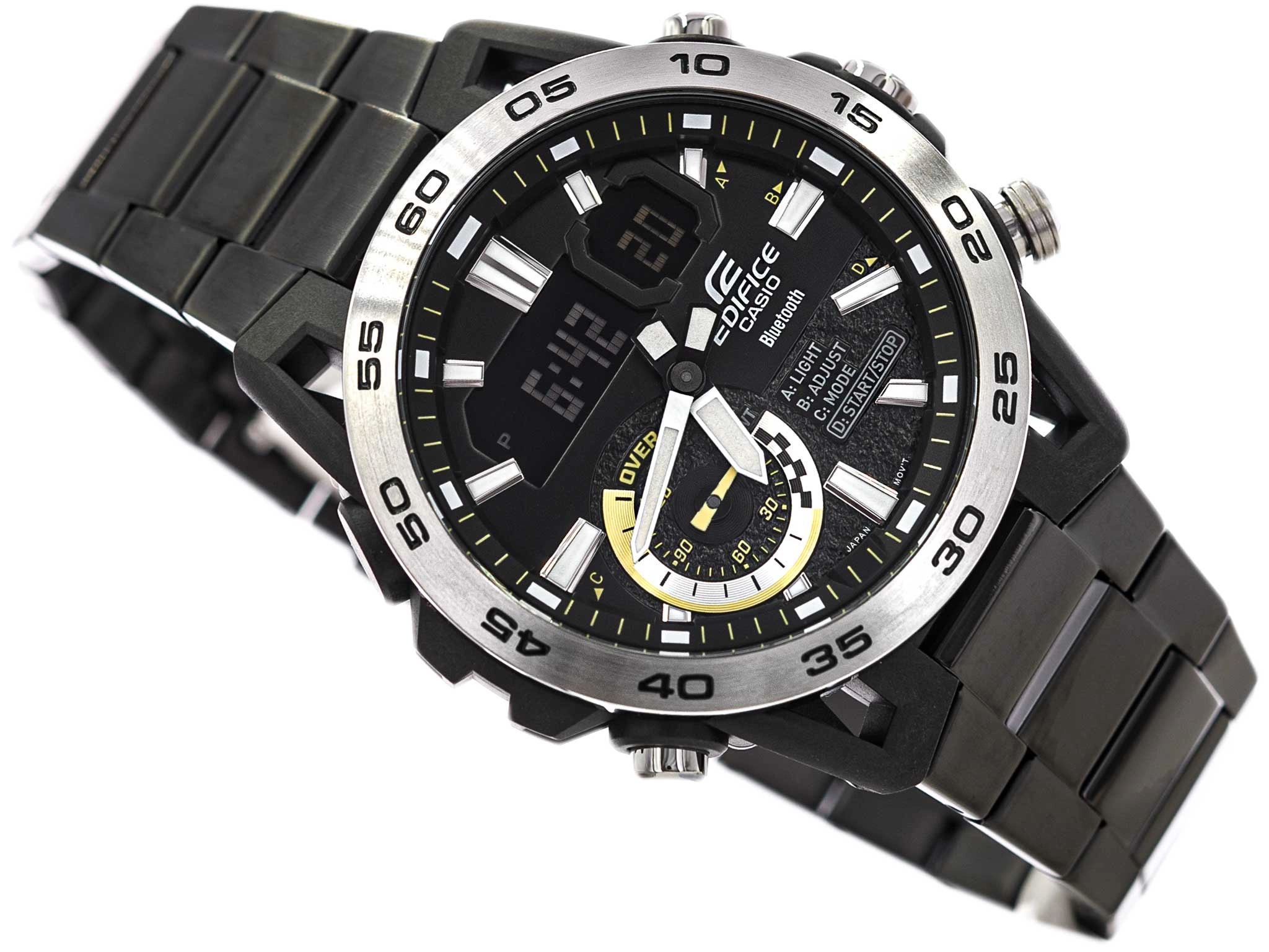 • Wodoszczelny Zegarek Męski Casio Edifice ECB-40DC 1A czarny na bransolecie, posiada funkcje takie jak bluetooth, stoper i datownik.