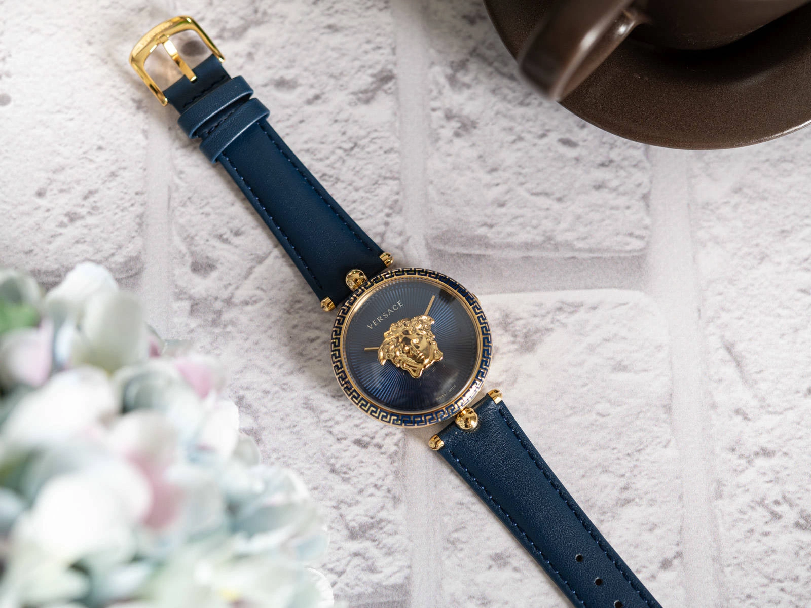Versace VECO02122 Palazzo to produkt zaprojektowany dla miłośniczek kunsztu i dobrego smaku. Charakterystyczną cechą zegarka, bez wątpienia jest złota meduza - logo producenta, zamieszczona na cyferblacie. Stalowa koperta w ponadczasowym kolorze żółtego złota została zawieszona na granatowym, skórzanym pasku. Warto zaznaczyć, że model sygnowany jest logo swiss made, które świadczy o szwajcarskiej precyzji wykonania. Za sprawą spójnej kolorystyki oraz gustownego wzornictwa zegarek na kobiecym nadgarstku prezentuje się fenomenalnie. Z pewnością Versace Palazzo podkreśli codzienną stylizację i nada jej oryginalności. Do zegarka zostało dołączone eleganckie pudełko, może stać się wyjątkowym opakowaniem na prezent.