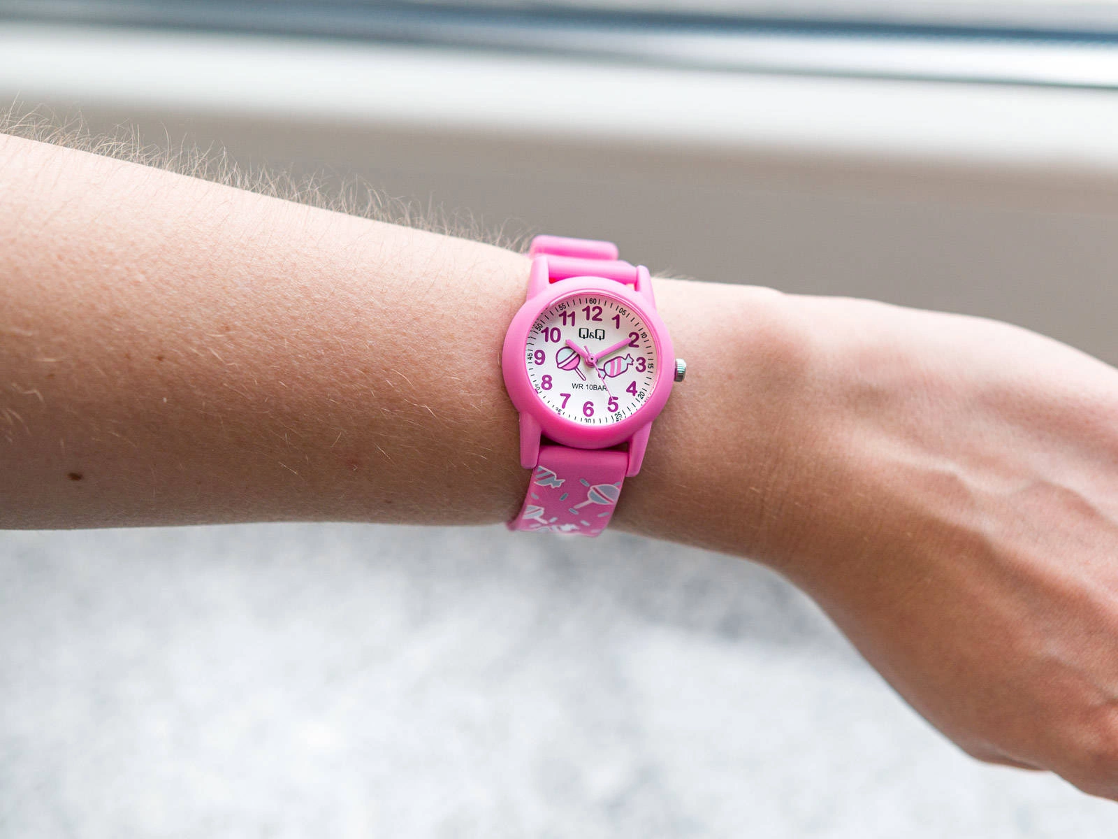 - Wodoszczelny Zegarek dziecięcy Q&Q V22A-003VY różowy na pasku.