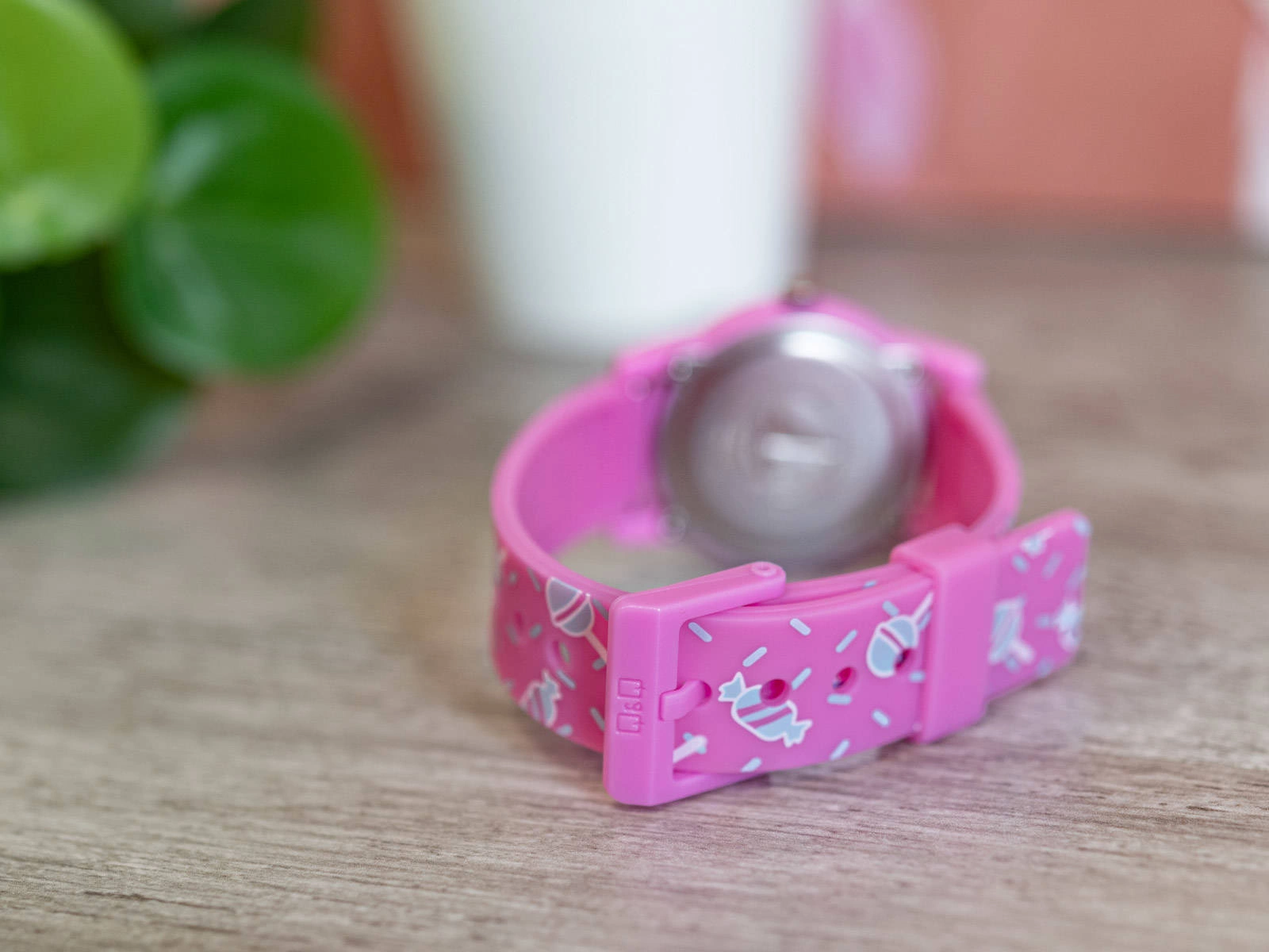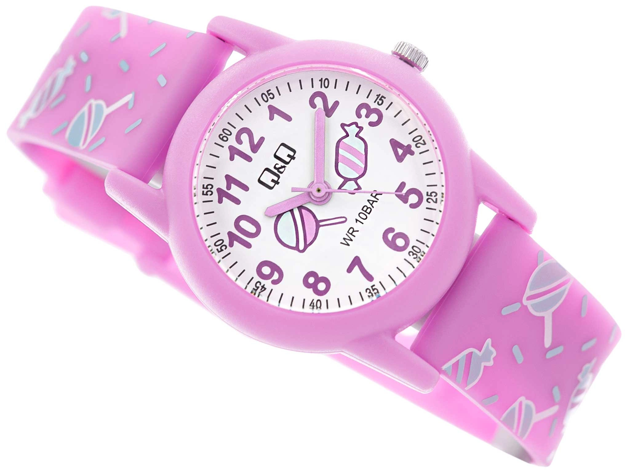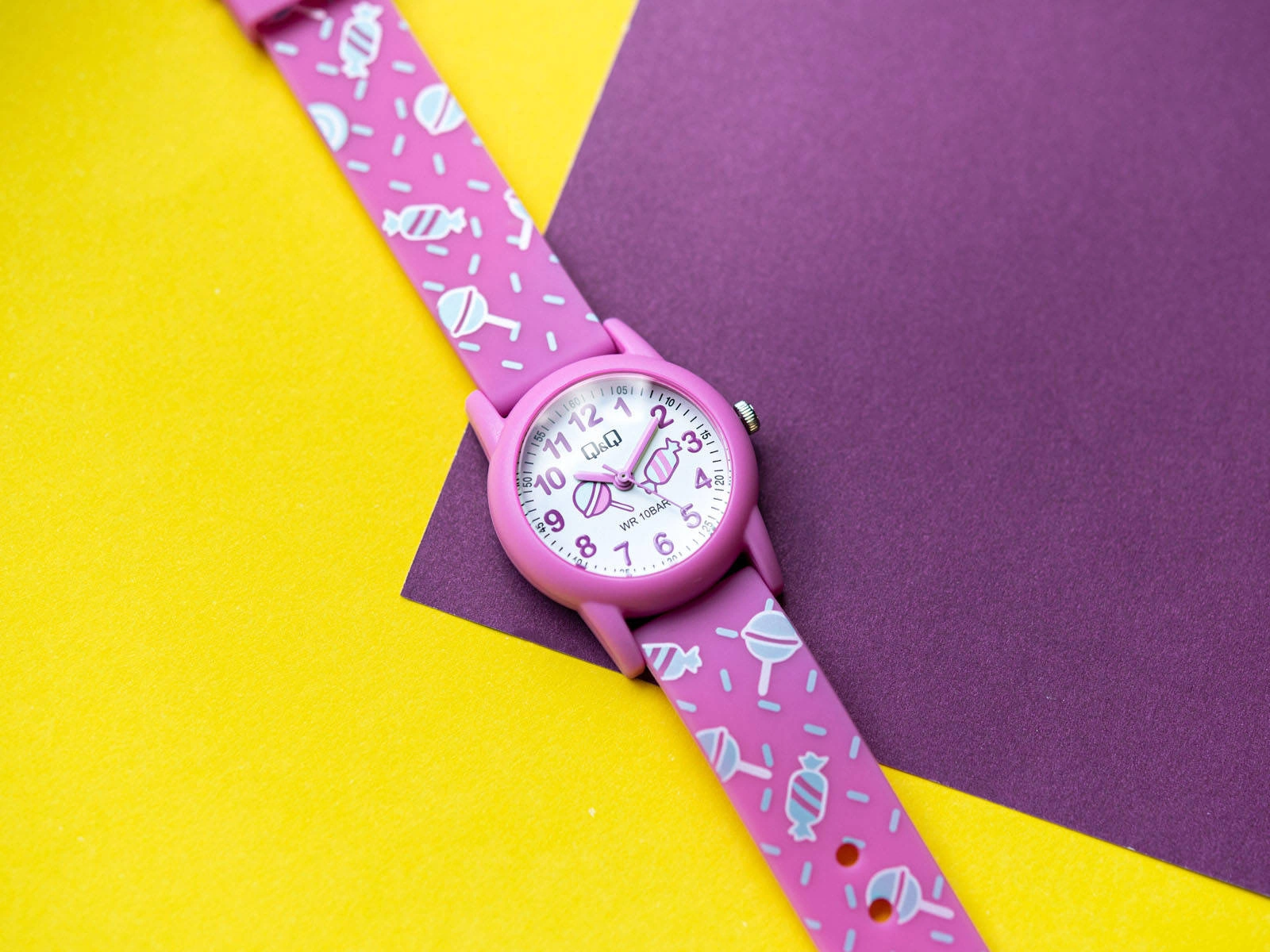 Q&Q V22A-003VY to idealny zegarek dla dziewczynki, lubiącej słodkości. Na białym cyferblacie godziny wyznaczone są za pomocą wyrazistych cyfr arabskich, nad którymi znajdują się liczby minut w celu ułatwienia odczytu aktualnego czasu. Różowa koperta połączona jest z wygodnym, różowym paskiem z motywem cukierków. Na cyferblacie również producent zamieścił grafikę przedstawiającą cukierki. Zegarek świetnie prezentuje się na dziewczęcym nadgarstku ze względu na użycie kontrastowych kolorów. Klasa wodoszczelności 100M pozwala na pływanie z zegarkiem na ręce, co jest niezwykle istotnym parametrem przy wyborze zegarka dla dziecka. Q&Q V22A-003VY to produkt zaprojektowany dla dziecka, które rozpoczyna swoja przygodę z czasem i bezsprzecznie będzie sprawdzi się w roli zegarka na prezent.