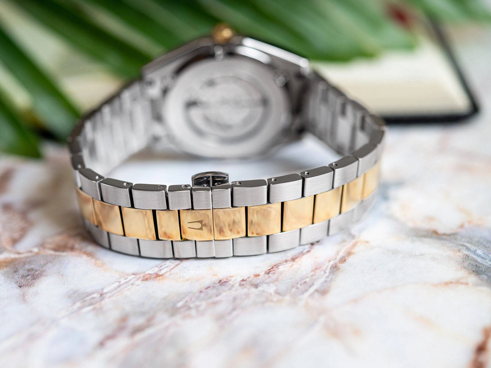 Bulova 98A284 Surveyor będzie idealnie leżał na większym, męskim nadgarstku. Koperta zawieszona została na dwukolorowej, odpornej na szkodliwe działanie korozji, stalowej bransolecie. Przez przeszklony dekiel oraz odsłoniętą część tarczy możemy na bieżąco obserwować prace mechanizmu automatycznego. Dzięki tego typu mechanizmowi nie musimy nigdy wymieniać baterii. Jest to zdecydowanie ekologiczne rozwiązanie. Kontrastowe indeksy i wskazówki są dobrze widoczne na cyferblacie co pozwala na precyzyjne odczytanie aktualnej godziny. Bulova 98A284 będzie doskonałym dopełnieniem codziennej, ale również bardziej odświętnej stylizacji. Jesteśmy pewni, że z powodzeniem może pełnić role zegarka na prezent.