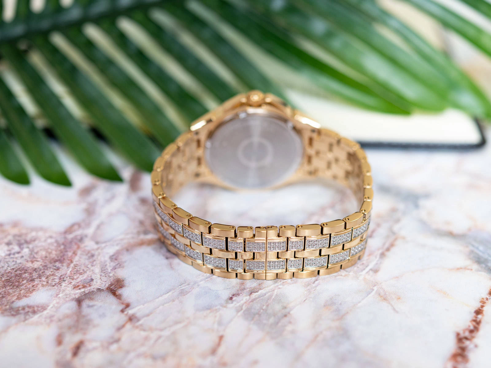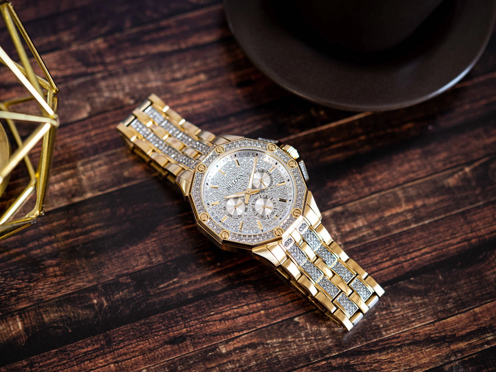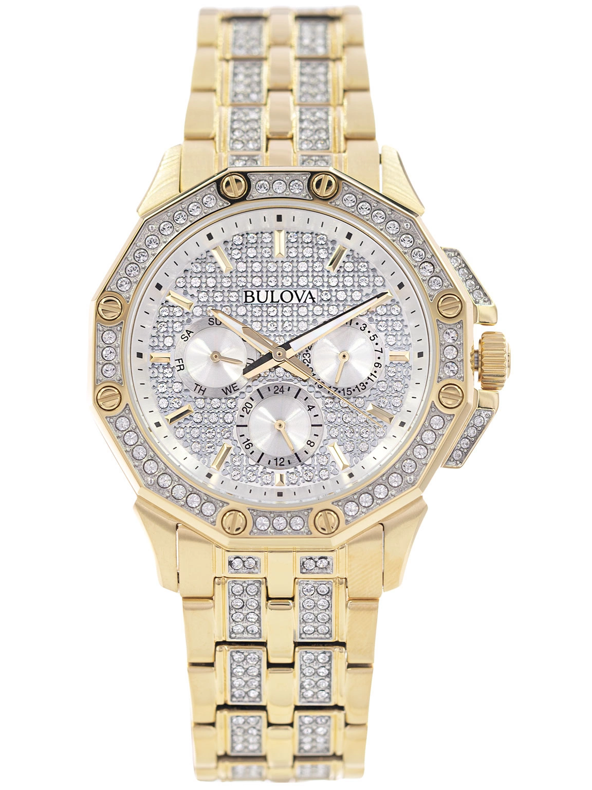 Bulova 98C126 Crystal to propozycja dla mężczyzn odważnych, preferujących nowatorskie wzornictwo. Imponująca, złota koperta została połączona z odporną na korozję stalową bransoletą, a obydwa elementy przyozdobione zostały błyszczącymi cyrkoniami. Bransoleta posiada zabezpieczenie, które uniemożliwia przypadkowe otwarcie i zsunięcie się zegarka z ręki. Ponadto na bogato zdobionym cyferblacie znajdziemy mniejsze tarcze, które wskazują kolejno dzień tygodnia, dzień miesiąca oraz czas w formacie 24godzinnym. Dodatkowo błysku tarczy dodaje szkiełko mineralne, które chroni tarcze przed działaniem czynników zewnętrznych. Z pewnością można stwierdzić, że obok modelu Bulova 98C126 nikt nie przejdzie obojętnie, a jego oryginalny design przykuwa wzrok. Model ten został zapakowany w pudełko producenta, które może zarówno posłużyć jako opakowanie na prezent jak i pudełko do przechowywania.