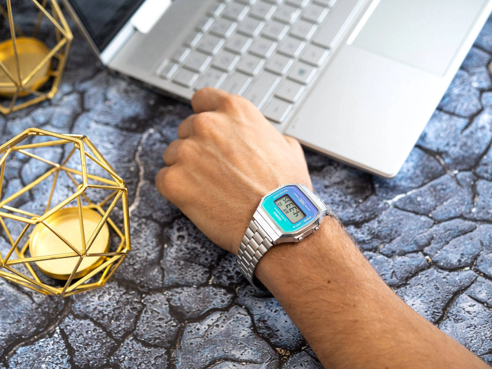 Casio A168WER-2AEF wpisze się w gusta miłośników stylu retro. Część tarczy wokół wyświetlacza cyfrowego upiększona jest wzorem ombre, połączeniem zielonego i fioletu. Stalową bransoletę możemy regulować bez konieczności wizyty u zegarmistrza, przesuwając zapięcie. Producent zaopatrzył Casio A168WER-2A w wiele pomocnych funkcji, takich jak datownik, alarm czy stoper. W Po zmroku odczyt godziny ułatwi nam podświetlenie diodą LED. W zegarku pracuje japoński, kwarcowy mechanizm, który zasilany jest baterią. Dokładność pracy mechanizmu wynosi +/- 30 sekund w skali miesiąca. Warto wspomnieć, że producent deklaruje żywotność baterii na około 7 lat. Jeżeli poszukujesz zegarka, który ma być stylowym dodatkiem na co dzień, Casio z serii Vintage będzie idealnym wyborem.