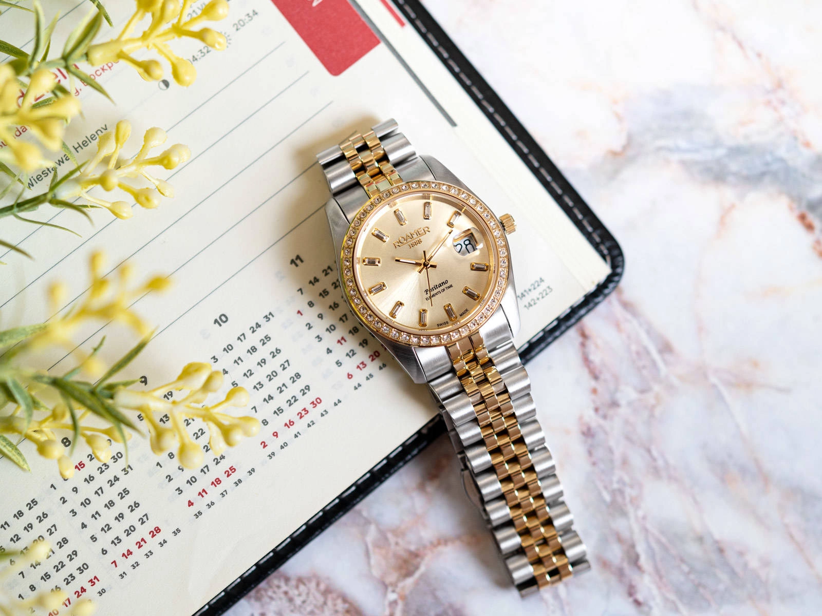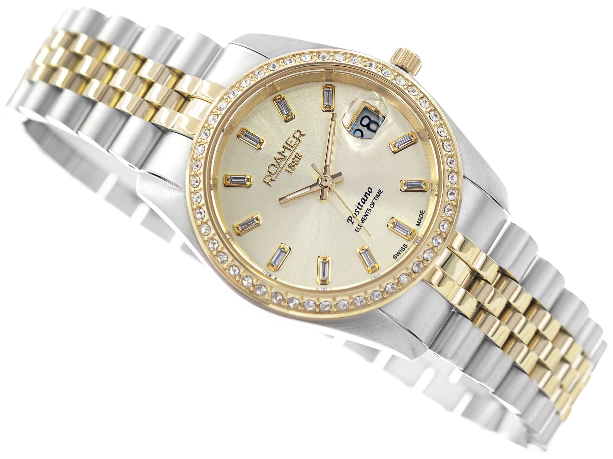 • Wodoszczelny Zegarek Damski Roamer 853858 47 39 20 srebrno-złoty na bransolecie, posiada funkcję datownika.