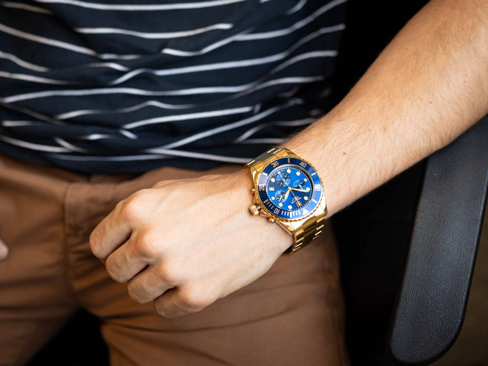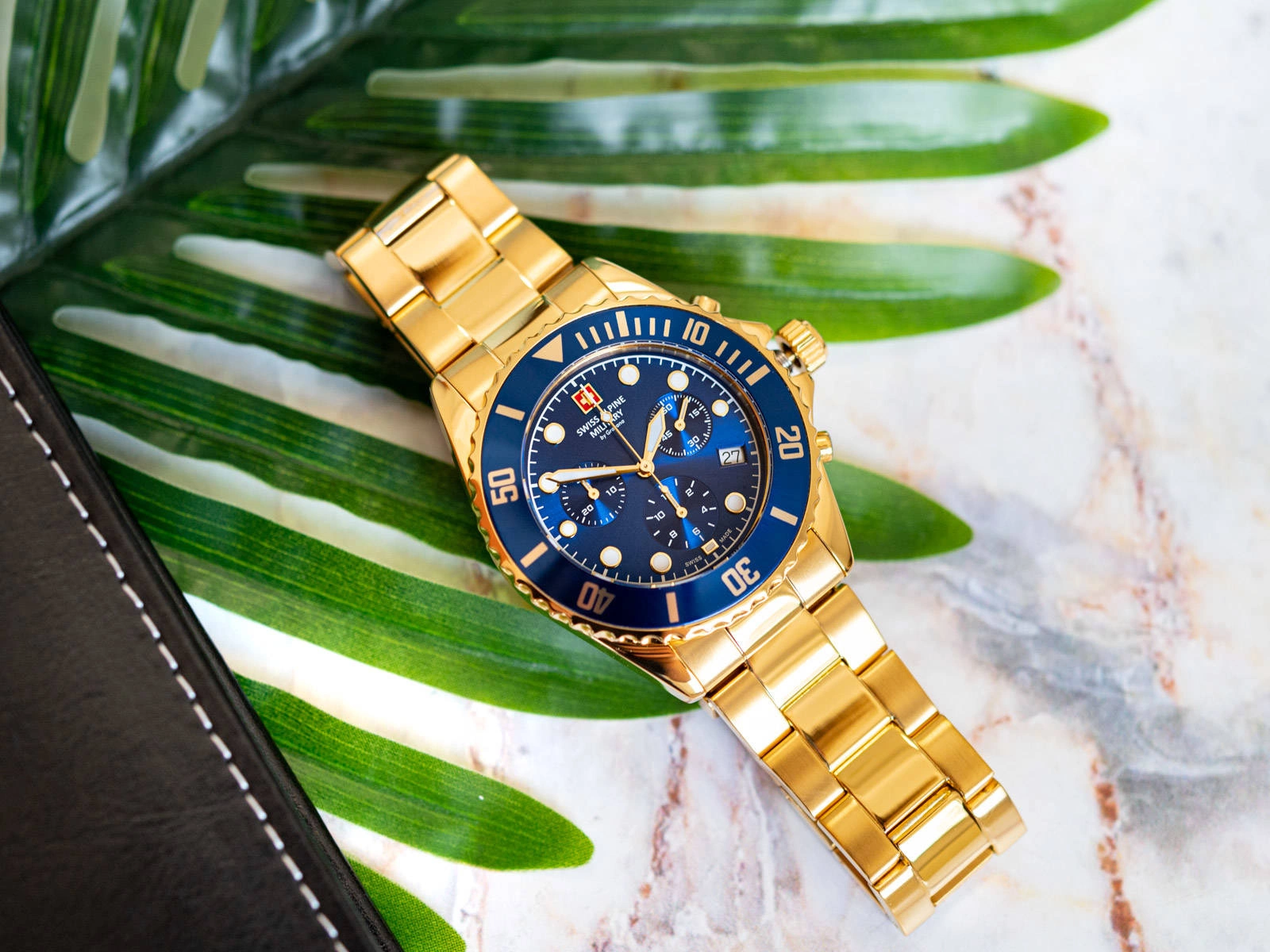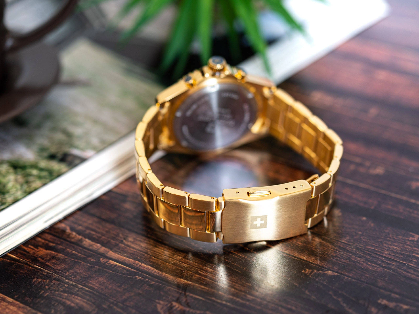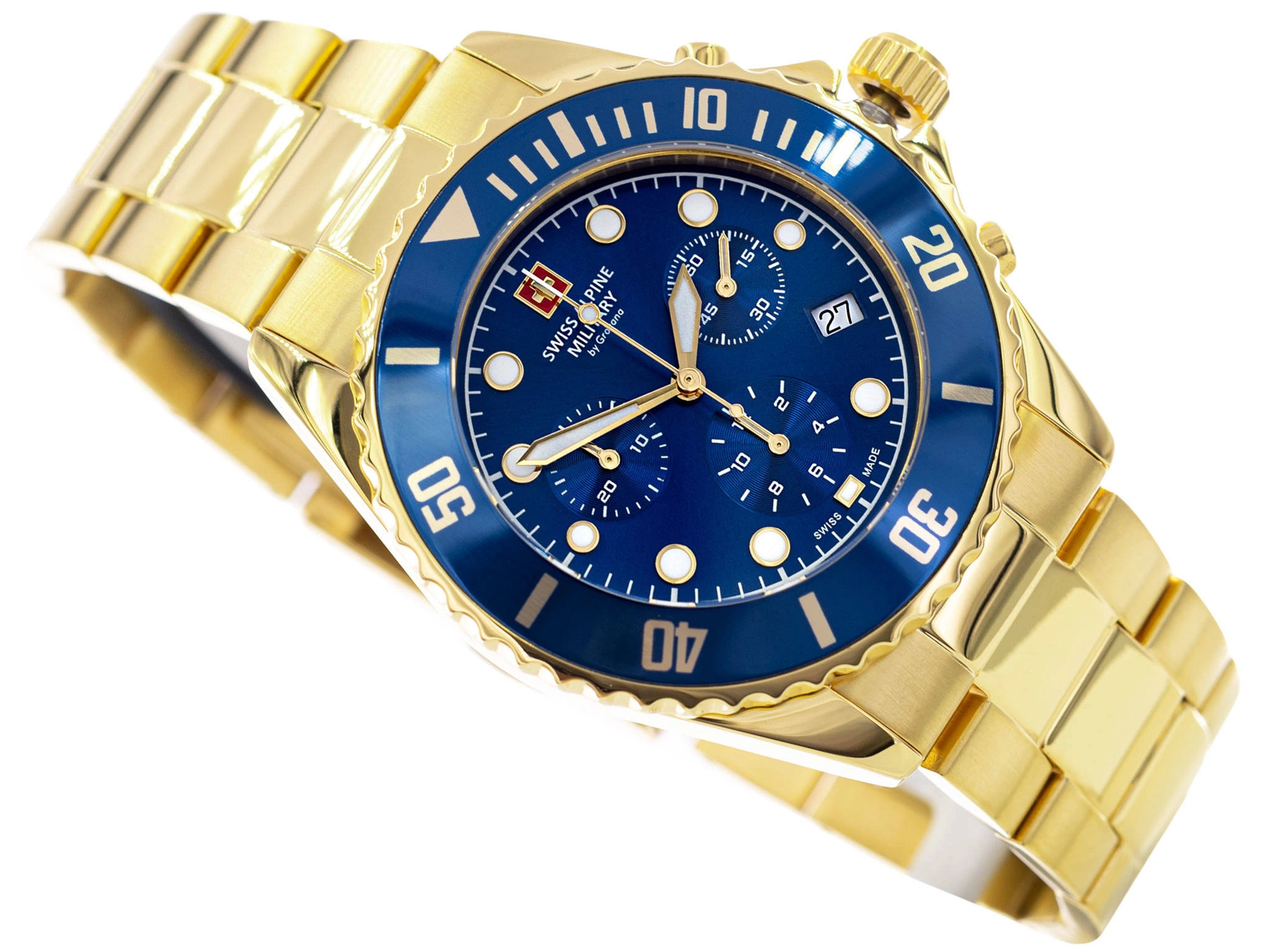 - Wodoszczelny Zegarek Męski Swiss Alpine Military 7053.9115 złoty na bransolecie, posiada funkcje takie jak stoper i datownik.